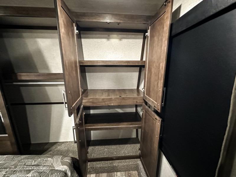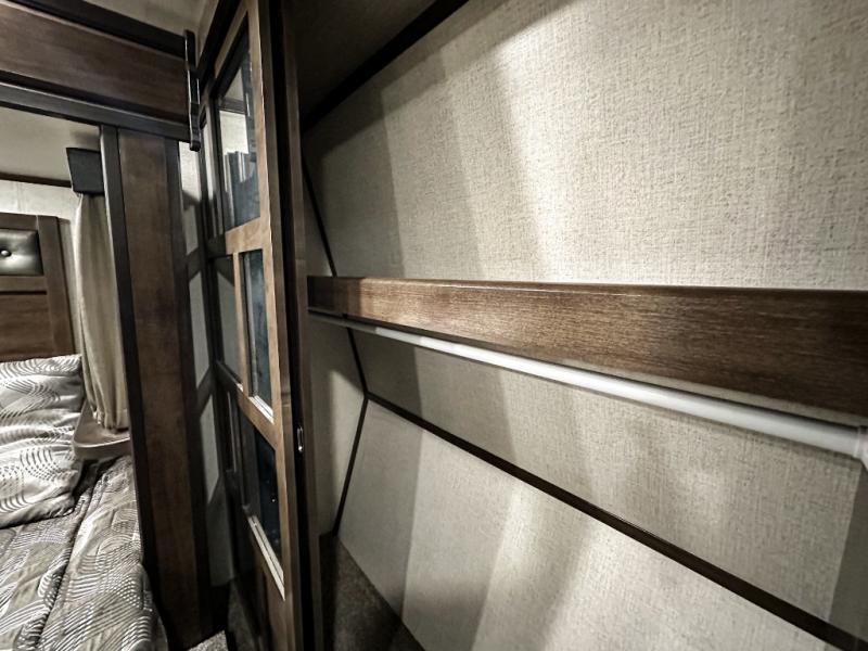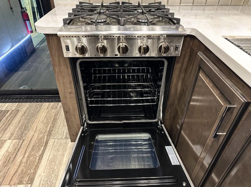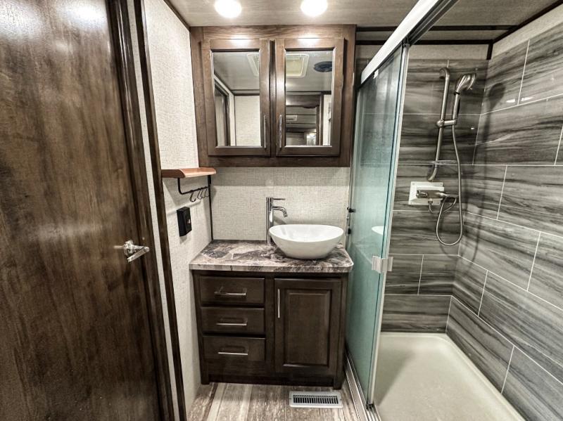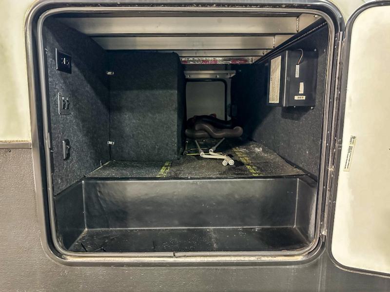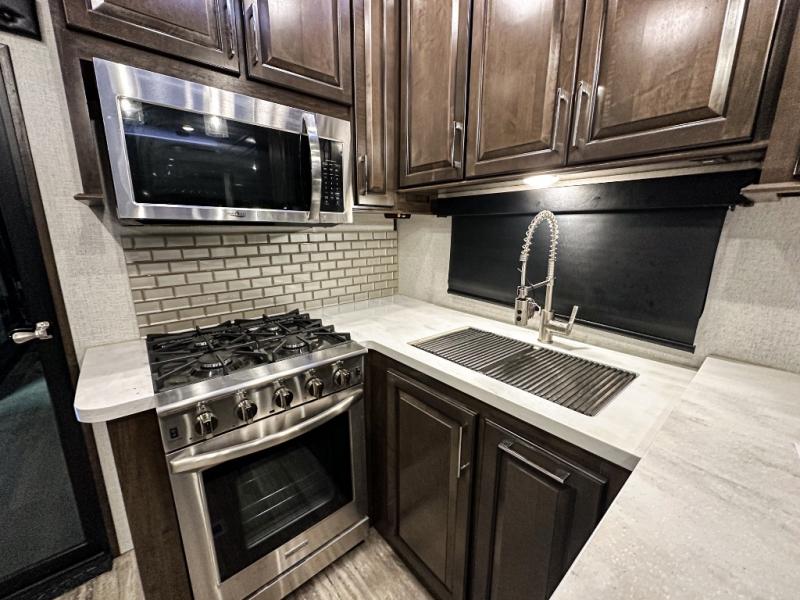 You will be extremely impressed by the amount of luxury found on the Dutchmen Voltage fifth wheel toy hauler! Some of the premium features that you will find on the Voltage are the Zero-Gravity ramp door that lets you access your toys with very little effort and the king-size bed which offers you extra space for sleeping comfortably. The Voltage also has industry-leading 7'-tall slides so that you can feel free to stretch your legs while inside. The ramp door patio system is certainly going to be an appealing factor because it provides you with an extra party space, and the dedicated heat ducts for the underbelly and the All-Weather Package with additional insulation will ensure that your Voltage is protected and prepared for all sorts of weather.