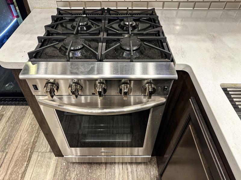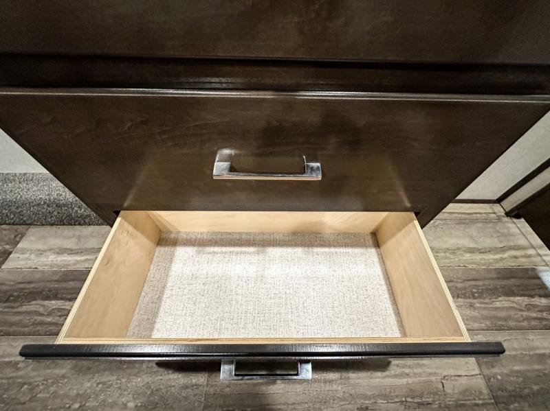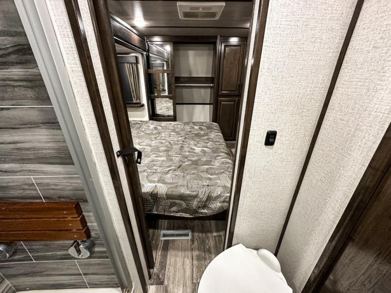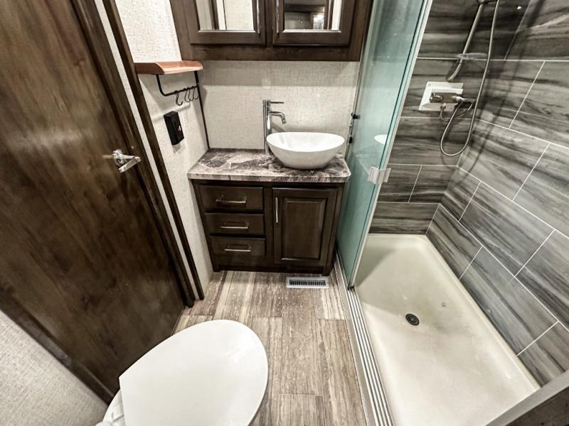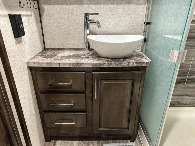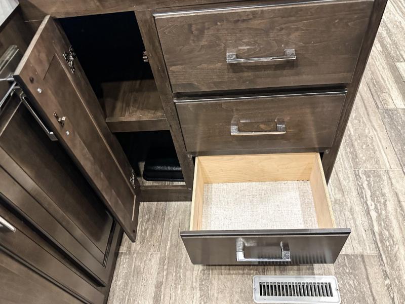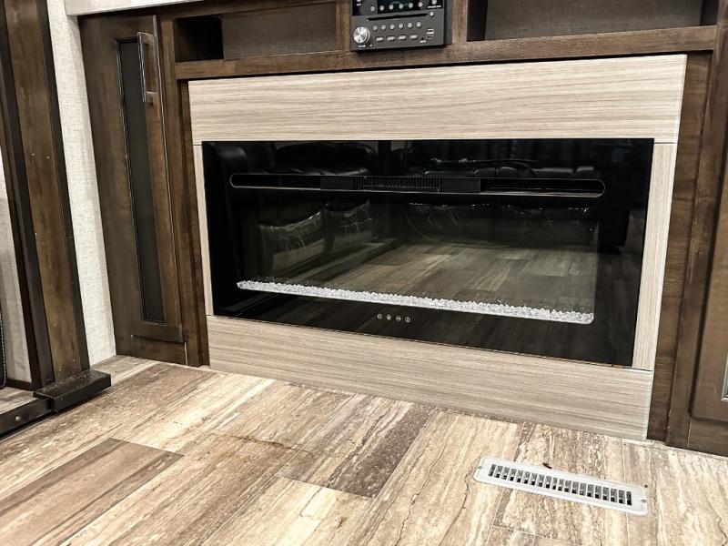 You will be extremely impressed by the amount of luxury found on the Dutchmen Voltage fifth wheel toy hauler! Some of the premium features that you will find on the Voltage are the Zero-Gravity ramp door that lets you access your toys with very little effort and the king-size bed which offers you extra space for sleeping comfortably. The Voltage also has industry-leading 7'-tall slides so that you can feel free to stretch your legs while inside. The ramp door patio system is certainly going to be an appealing factor because it provides you with an extra party space, and the dedicated heat ducts for the underbelly and the All-Weather Package with additional insulation will ensure that your Voltage is protected and prepared for all sorts of weather.