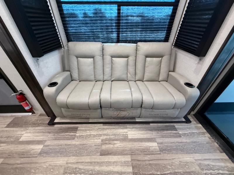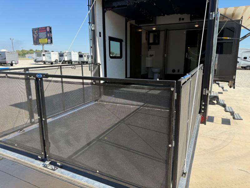 Traveling with your family or your adventure buddies will be easy when you are towing this Voltage Triton fifth wheel toy hauler behind your truck! You will enjoy garage space that you can easily access via the rear 8' ramp door with spring assist. There is even access from inside the living area through a glass door if you like. The garage offers a lay-flat Happi-Jack power bunk with dual sofas and a table beneath, plus there is a twin-size loft overhead and a convenient half bath as well. Enjoy the convenience of a full kitchen for meals and a comfy king-size bed in the front master suite. Add the rear optional patio awning onto the ramp door and create a whole new way to enjoy the outdoors!