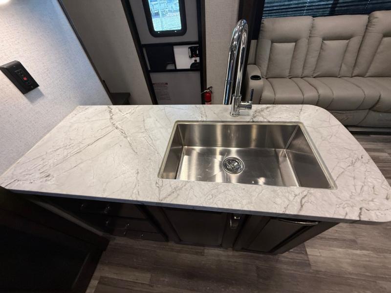 With any Voltage Triton toy hauler by Dutchmen RV, you will enjoy the luxurious interior, as well as the fabulous garage features that include a spring-assist ramp door, a 30-gallon fuel station to keep your toys fueled all weekend long, Tuff Ply flooring for durability, and 2,500-LB tie downs to secure your toys while on the go. Inside each model you will find a 50" TV, upgraded residential furniture, solid-surface countertops, and a stainless steel kitchen sink. It's time to stop dreaming about adventure and luxury and start living it!