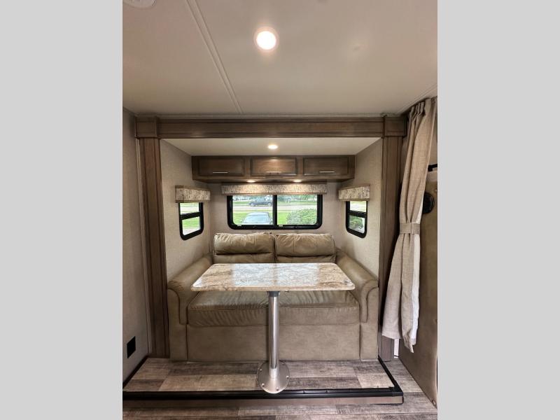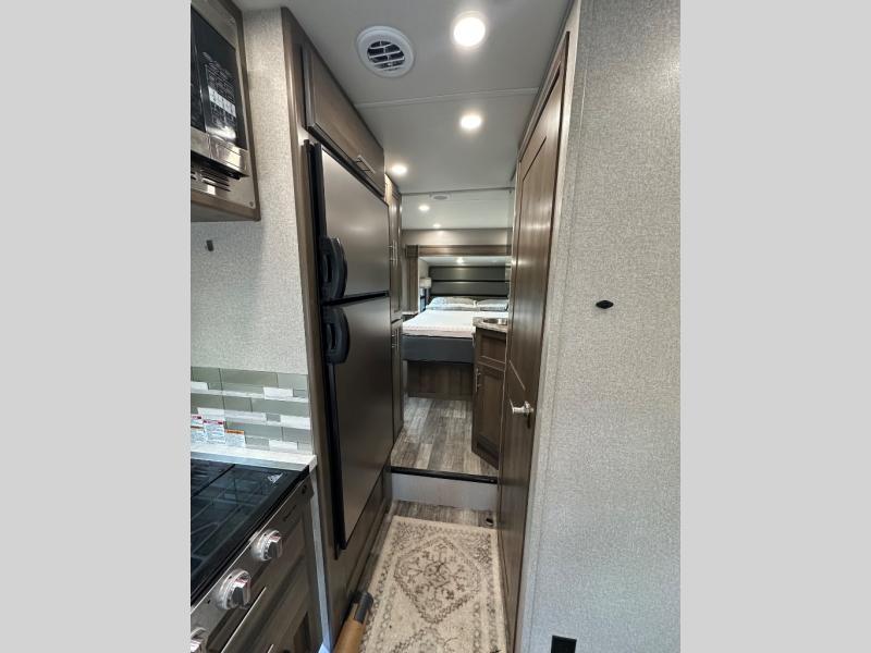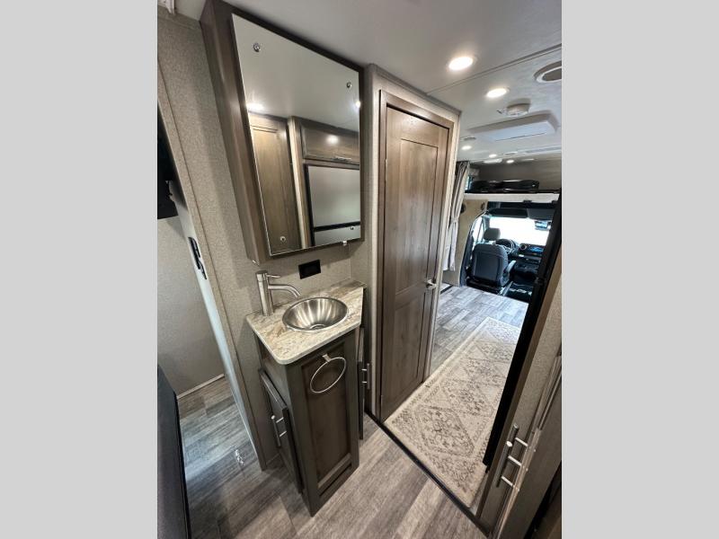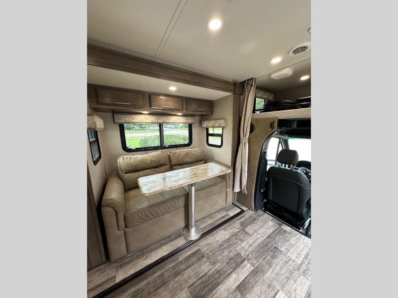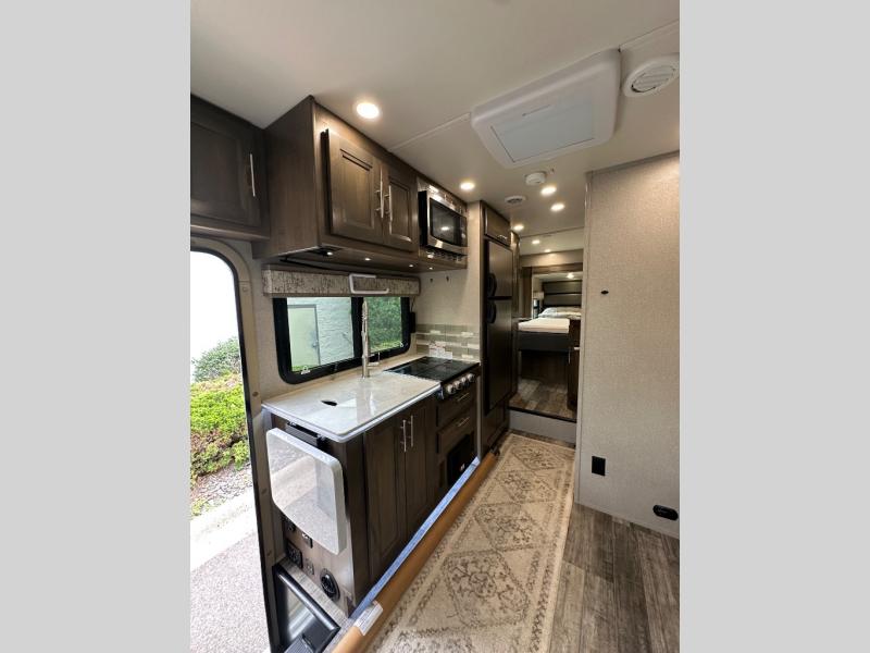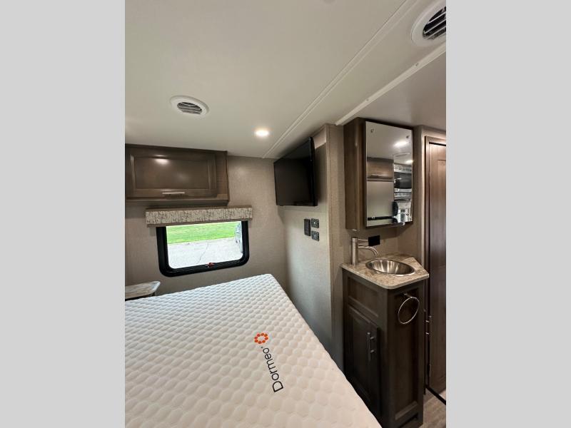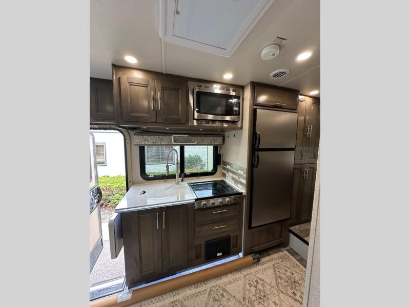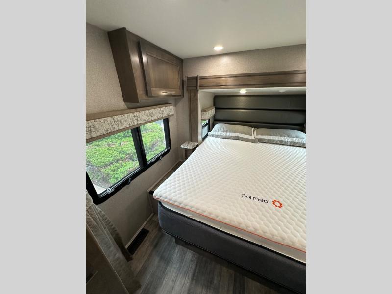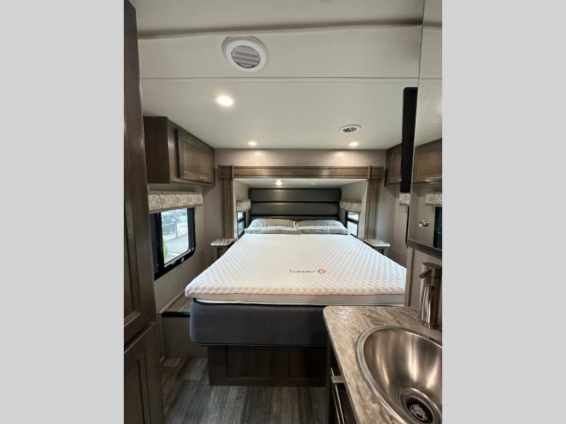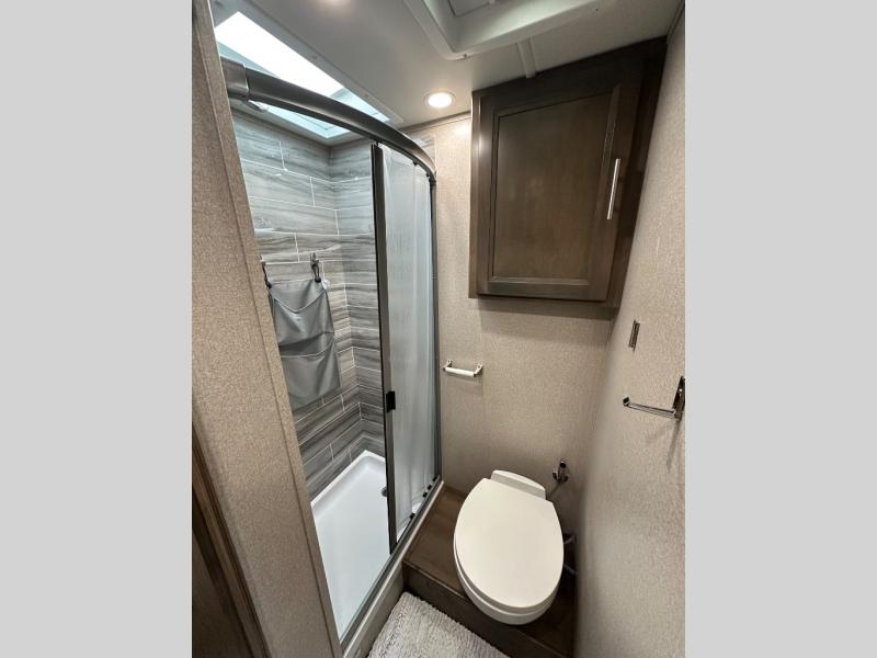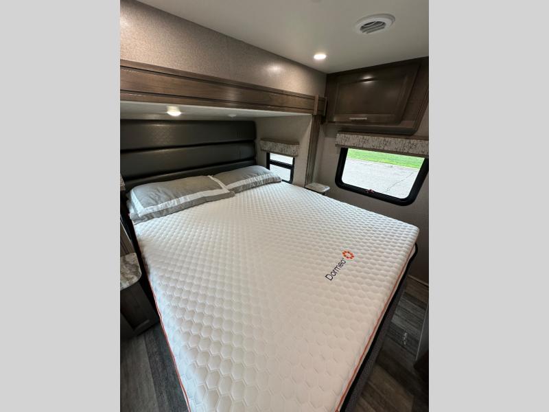 You and your spouse will love traveling in this 24RW Class C diesel motorhome! It features a rear private bedroom with a queen-size bed slide, overhead cabinets, a 32" LED TV, and a privacy curtain to draw at night. The full bathroom shower not only has a skylight above it, but also an Oxygenics Body Spa RV shower head and a lightweight, soft-sided shower door, plus there is a MaxxAir power vent with a built-in rain cover. The booth dinette is great for eating your meals at and playing games, just pop a bag of popcorn in the convection microwave oven and you're all set!