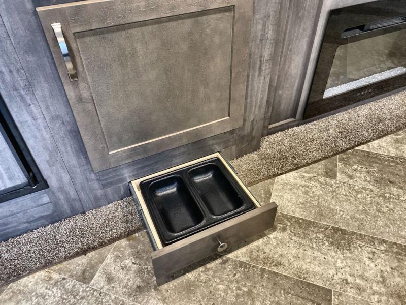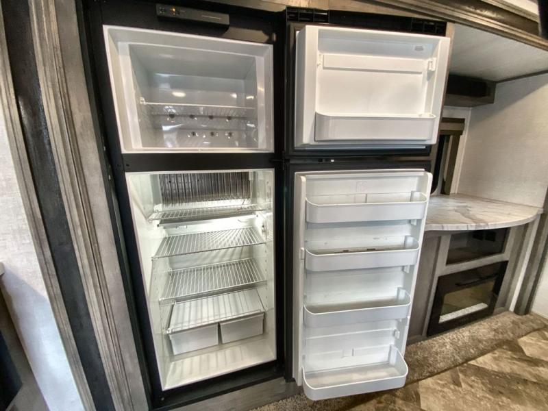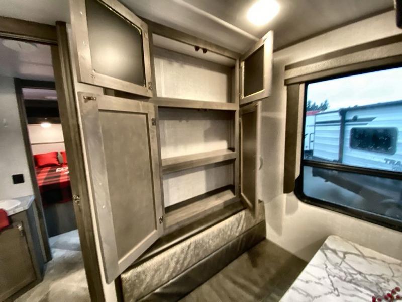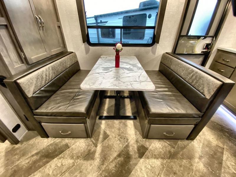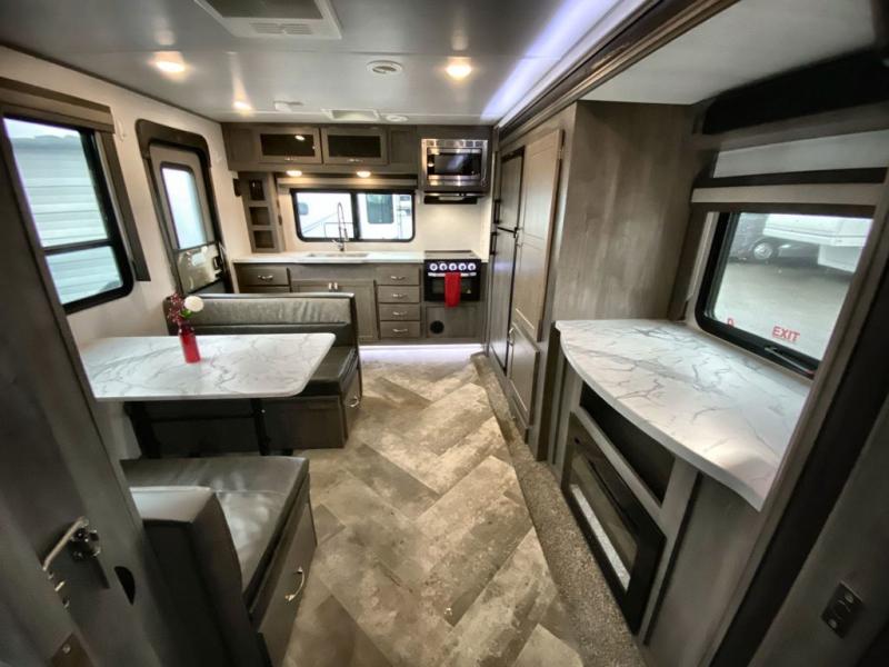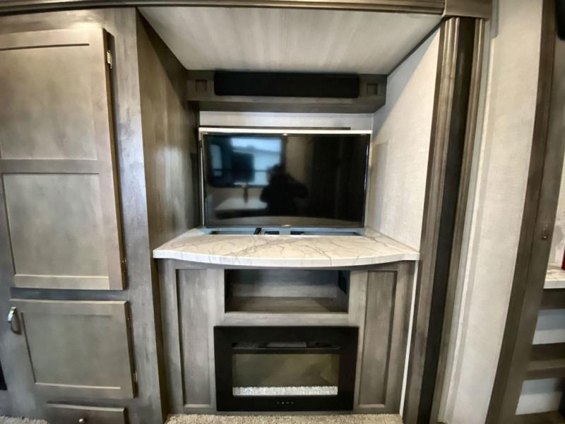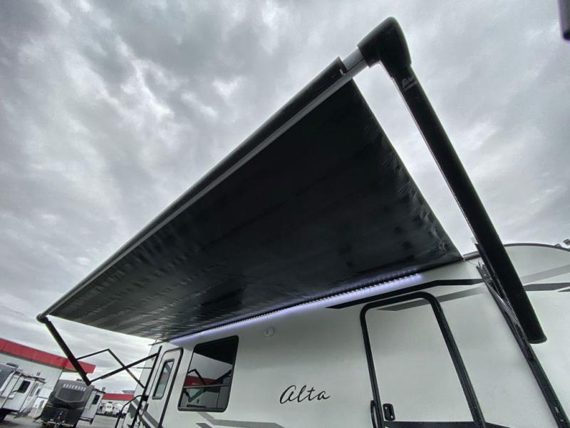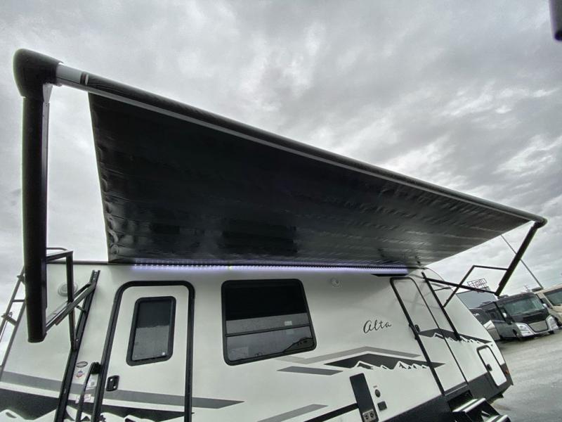 As soon as you step inside this Alta, you will appreciate all the added features that make this travel trailer great. The rear kitchen features plenty of counter space for meal prepping, and the two entry doors are a convenience you won't want to camp without. The kids can enjoy their morning breakfast at the booth dinette and watch cartoons on the telescoping 40" TV before heading outside for the day. During the evening, the fireplace below the television will create a cozy space, and the walk-through bath leads to the front private bedroom when it's time for bed. Here, you will enjoy a king bed, dual nightstands and wardrobes, and your own exterior entry door.