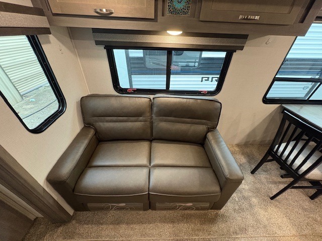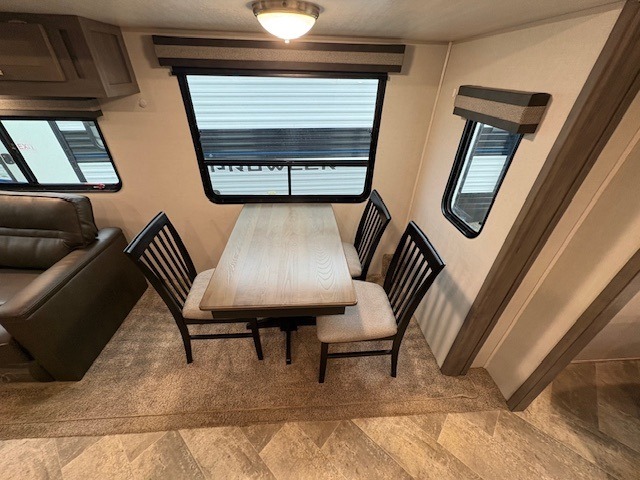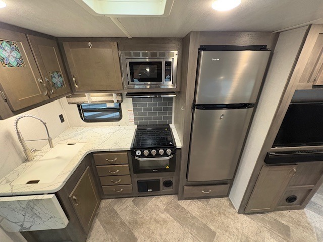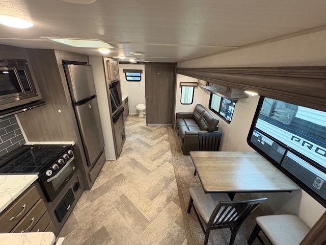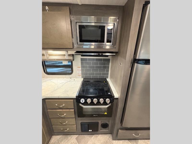 If you're looking for a travel trailer with a little more space, take a look at this Alta that features a large slide out in the living/kitchen area. The tri-fold sofa and booth dinette within the slide provide plenty of seating and can be converted into sleeping space for the kids or your guests. You can also choose the theater seat option in place of the tri-fold sofa. This unit has everything you need to prepare meals each day: a three-burner cooktop, a microwave oven, and a countertop extension for more prep space. Spend your days hiking, biking, or swimming and then clean up in the large rear bath just like you do at home. And, you will love the front bedroom for extra privacy, and the king bed will provide a great night's rest!