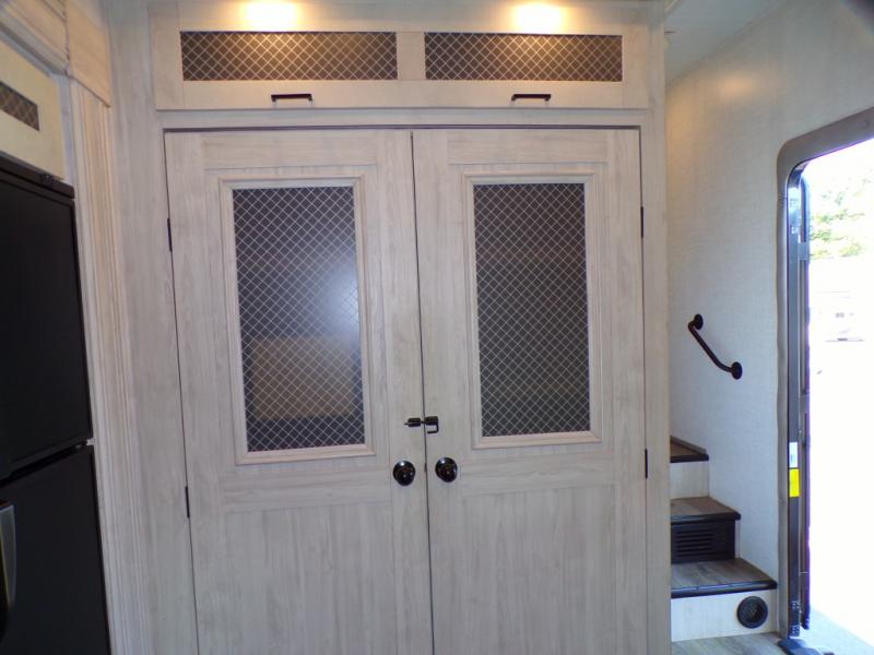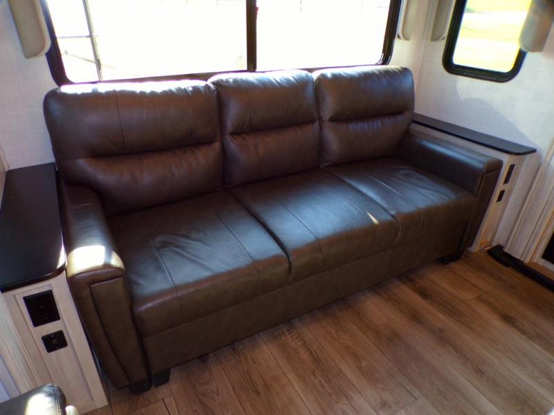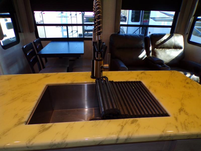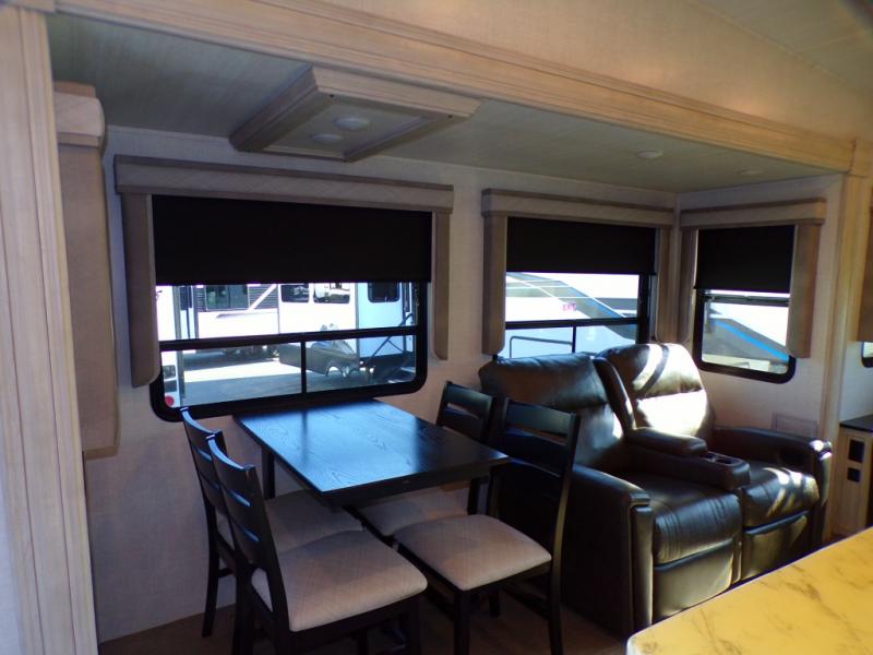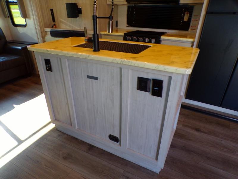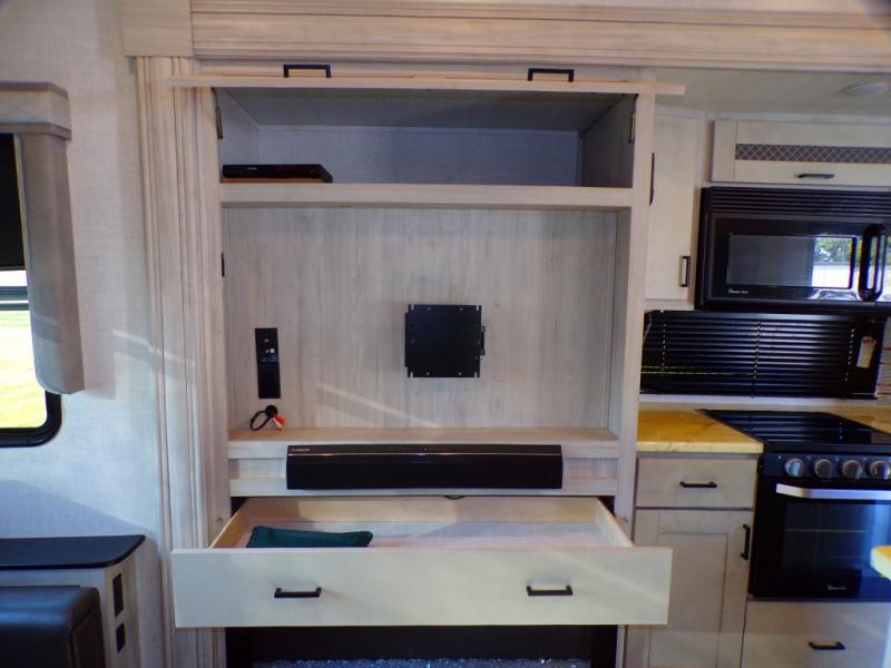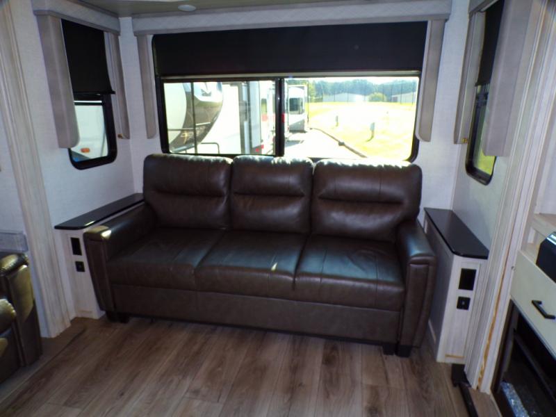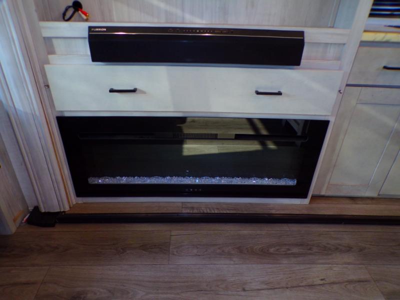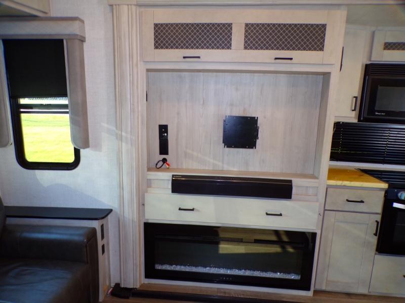 Get ready to find adventure when you take this Tandara camping or glamping! Inside, you can sleep on your own walk-around king bed, get cleaned up in the full bathroom with a seamless fiberglass shower, and watch the 50" TV on a swing arm with a fireplace below for those chilly nights. The residential microwave and refrigerator allow you to cook like at home, and the double-door pantry and coat closet gives you extra room for all the snacks. The kitchen island provides a deep-seated stainless steel sink with roll-up drying rack and residential high-rise faucet with pull-down sprayer making cleaning the dishes super easy. You can relax on the hide-a-bed sofa or theater seating and dine at the wall-mounted free-standing table with four chairs. And don't forget about the two power awnings offering a nice living space outside protected from the elements.