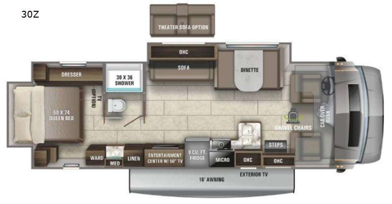 The Odyssey 30Z is built to make life on the road as comfortable as home. The slide-out bedroom creates a spacious retreat, while the cab-over bunk and fold-down furniture ensure flexible sleeping arrangements. Thoughtful interior features, including a modern kitchen, large TV, and convenient charging stations, keep travel practical and enjoyable. Outside, the electric awning, exterior speakers, and shower expand your living space for outdoor relaxation.