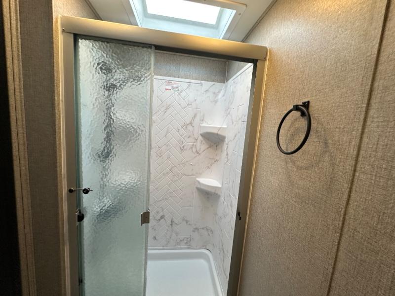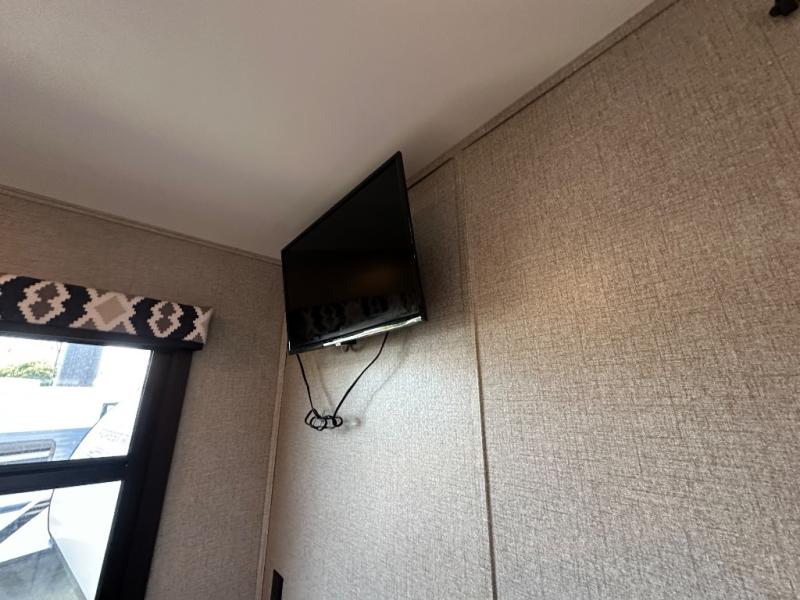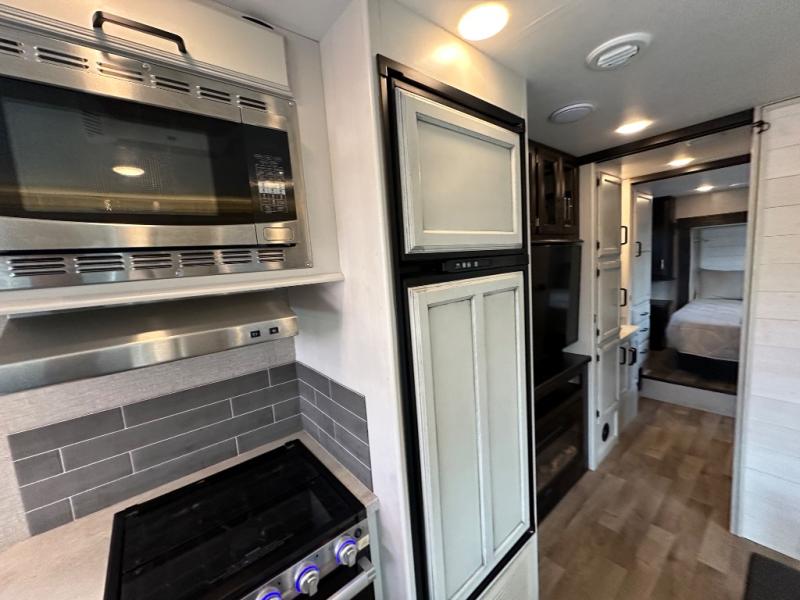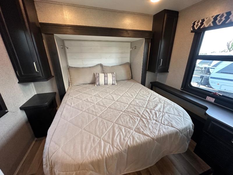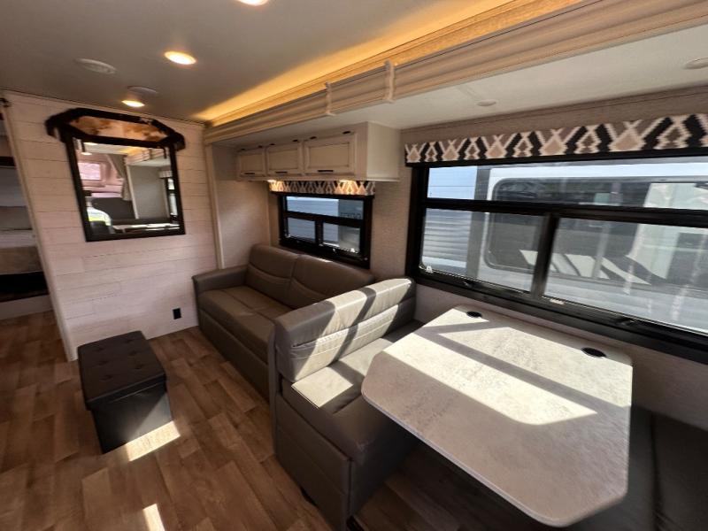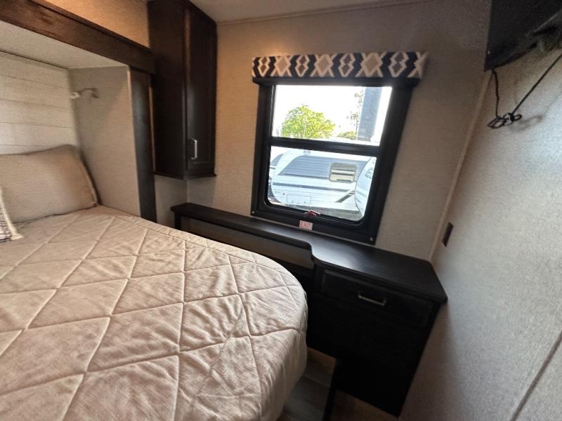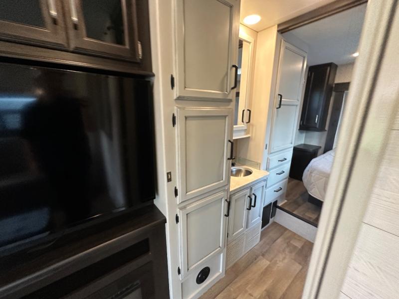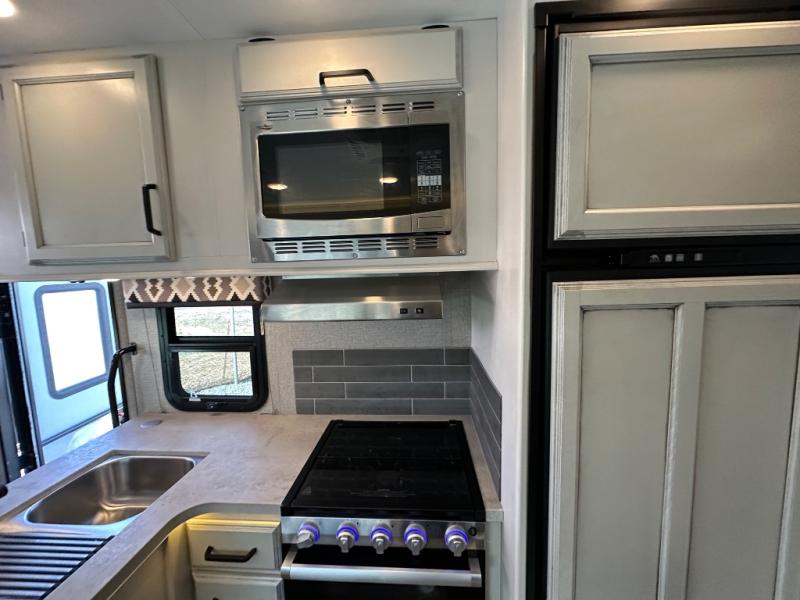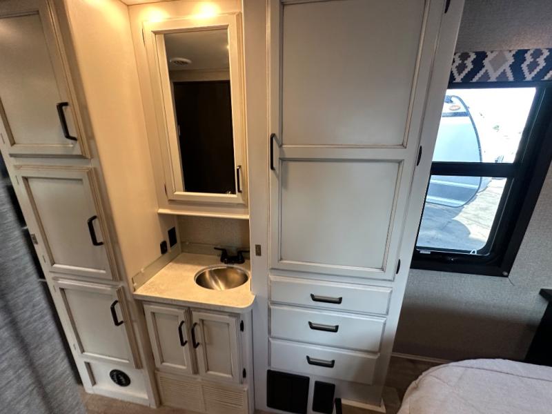 Swivel captain's seats, a rear bedroom slide, plus a full bath make this the perfect couples unit. If the grandkids tag along, they can sleep on the cab-over bunk or on the furniture once folded down for the night. You'll find a dresser in the bedroom for your clothes, plus a wardrobe and linen closet in the bathroom for additional storage space. The chef of the family can make breakfast each morning on the Furrion all-in-one cooktop, or use the convection microwave, and everyone can watch the news on the 50" TV before heading out for the day!