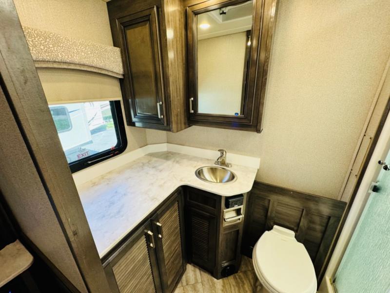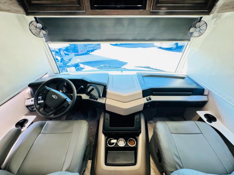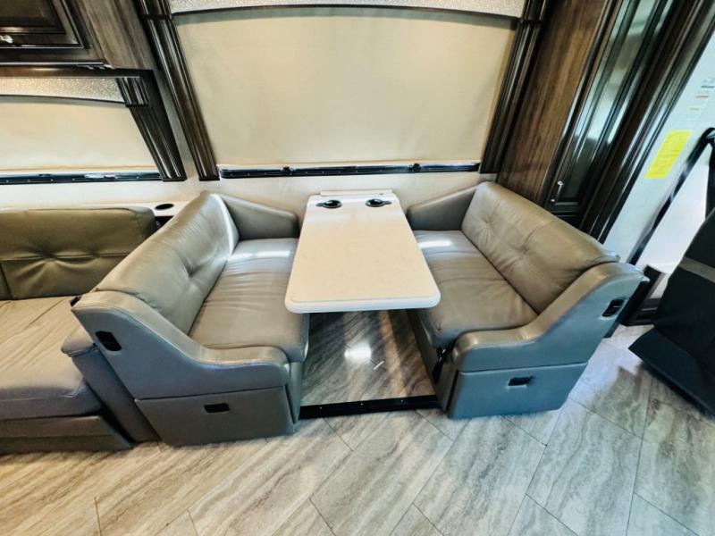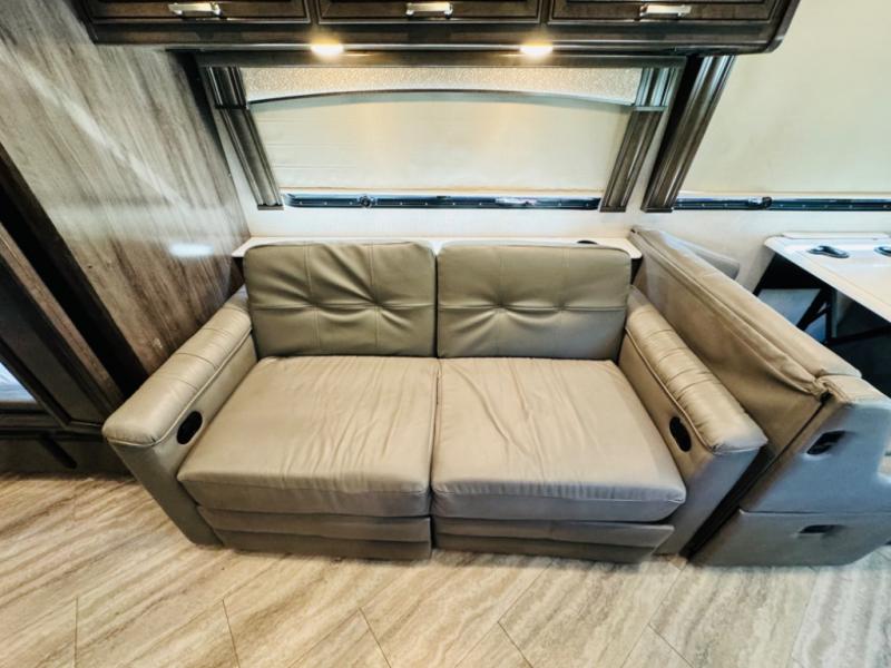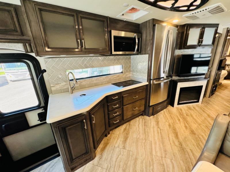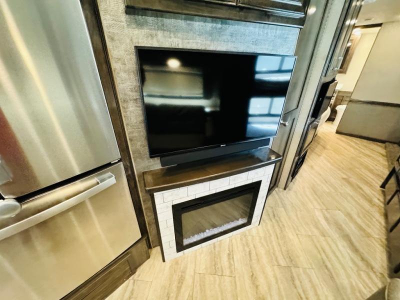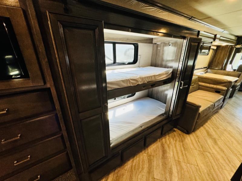 This motorhome is decked out in luxurious features for the whole family! From the two full bathrooms to the 26" x 74" bunk beds that can convert into a wardrobe and seating for the TV gaming center. Across from the bunks is a 24" LED TV with flip down storage and linen outside of one of the full bathrooms. You will feel right at home in the private bedroom with the Serenity Series king bed that has CPAP storage above it, a 24" LED TV above the dresser, and your very own private full bathroom with lots of counter space for you to get ready each morning. You can prepare your best home cooked meals with the two burner electric induction cooktop, and eat them at the 76" booth dinette and even the driver/passenger pedestal table. Wind down your nights by relaxing outside at the exterior entertainment center or indoors on the 70" sofa by the fireplace with the 40" LED TV to watch your favorite movie!