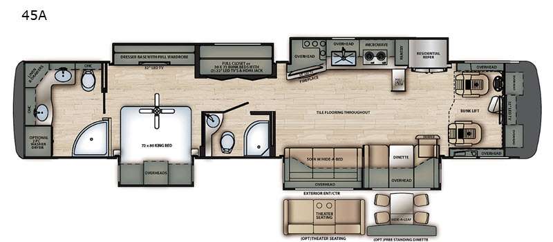 The time has come for you to relax in comfort and style with several conveniences that you are sure to want! There is a set of bunk beds that the kids will love which includes a 22" LED TV in both to help them wind down at night. A hide-a-bed sofa and dinette with a storage drawer allow for seating and dining during the day and extra sleeping space at night if the bunk beds and cab bunk lift aren't enough. You can wind down your evening inside while watching the 43" LED TV and staying cozy from the fireplace, or you can make a snack in the full kitchen which also includes a residential refrigerator and pull-out countertop. The rear full bathroom offers a dual-sink vanity and a place to add an optional washer/dryer, and the mid-cab full bathroom provides the kids with their own radius shower.