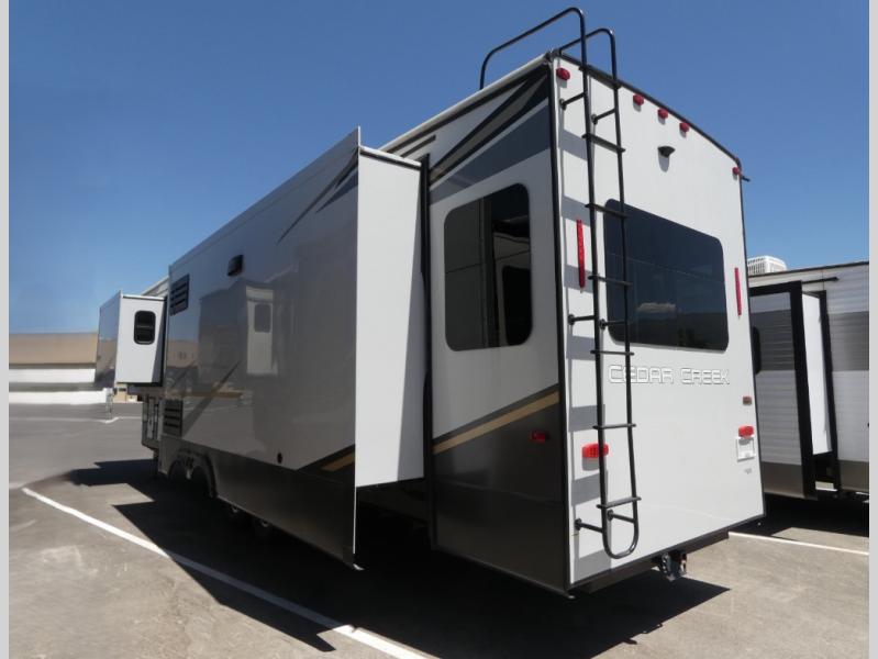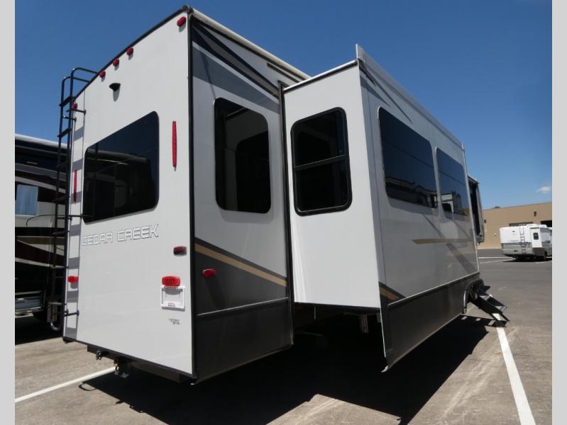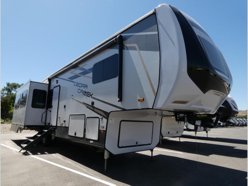 See where the road leads with any one of these Forest River Cedar Creek fifth wheels! They are constructed with the famous Cedar Creek all-aluminum superstructure on 16" centers, a "True" gelcoat exterior, and Silaprene® bonded sidewalls that are resilient, grow stronger with age, and also have an outstanding resistance to UV, heat, cold, moisture, oil/gas, and highway chemicals. The Dexter Performance and Safety Package will give you a peace of mind while driving down the road. You can also bring your furry friend with the animal leash latch, and enjoy your privacy with the Hehr frameless, tinted automotive-style windows. A few other convenient features you are sure to love are the Intervac central vacuum system with a front storage compartment port and interior automatic dustpan, the Congoleum® flooring (carpet mandatory in dining slide), and the USB plug-ins on each side of the king bed. Come choose the model that best suits you today!