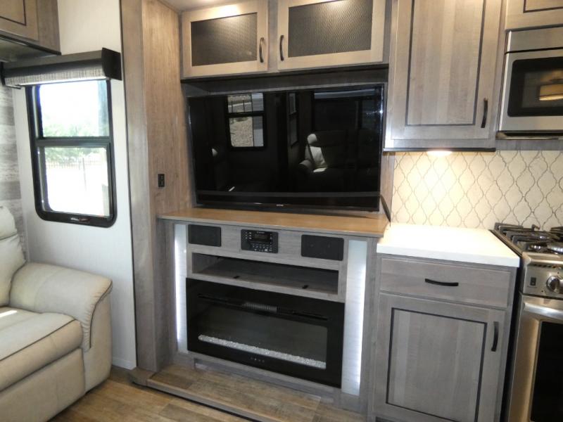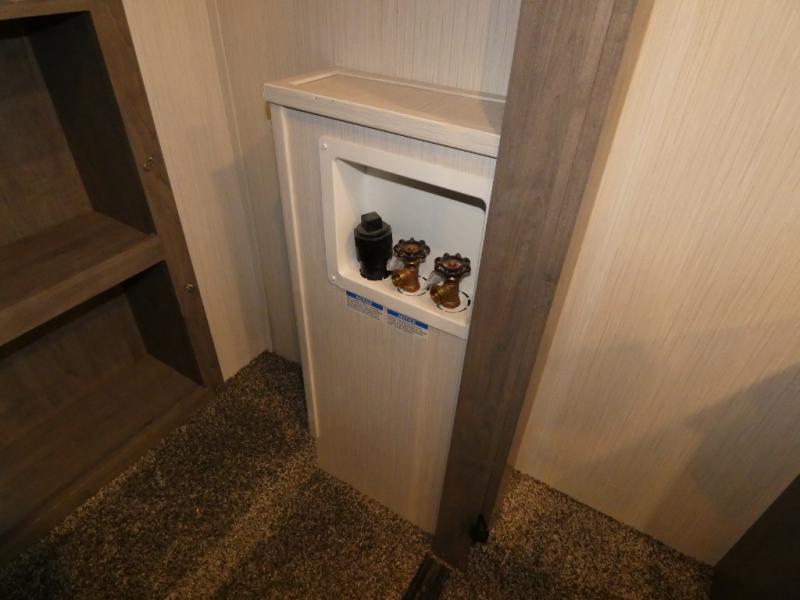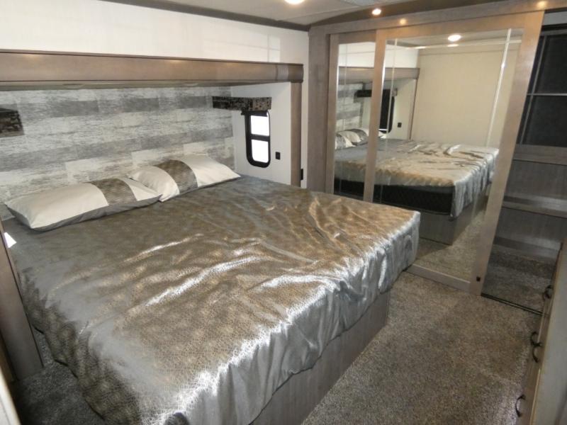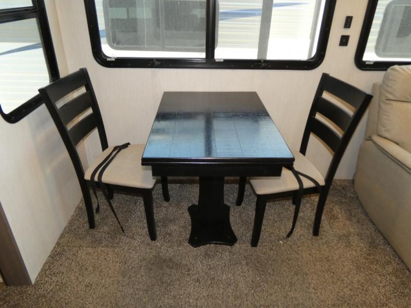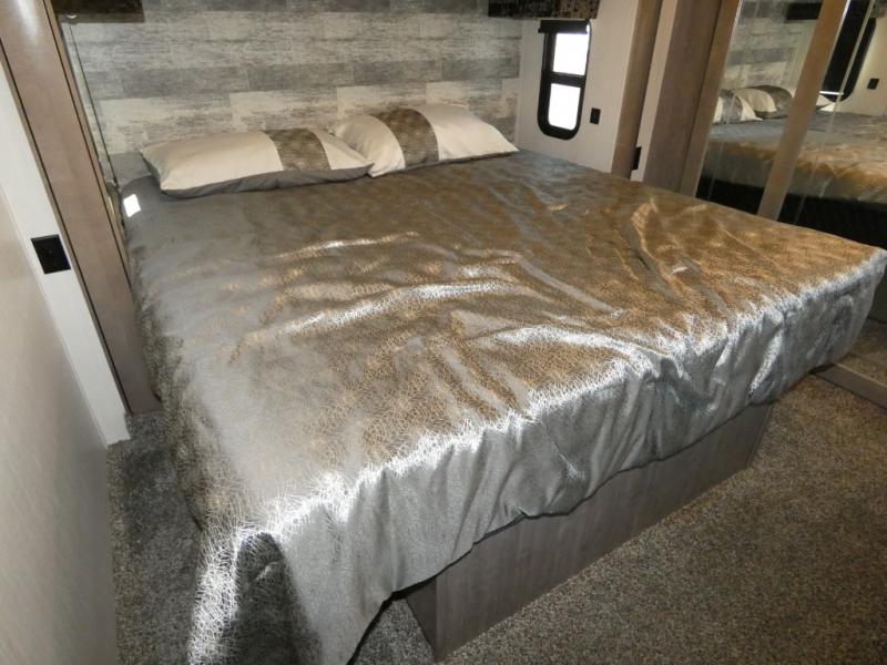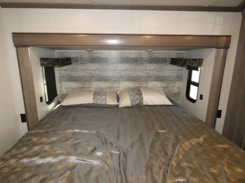 Do you wish to escape the mundane lifestyle? Well then, pick your favorite campsite and hitch up this Cedar Creek fifth wheel! The rear living area has a hide-a-bed sofa for you to bring an extra guest or two and power theater seating across from the entertainment center with a fireplace. The kitchen island will make your meal prep easy. The large kitchen pantry is big enough to store your favorite snacks, and the free-standing table is a great place to enjoy your meals. Just outside the full bathroom is a closet to use as you wish, and inside is a shower with a seat, a linen closet, and a large sink with two faucets.