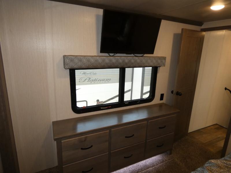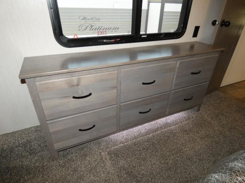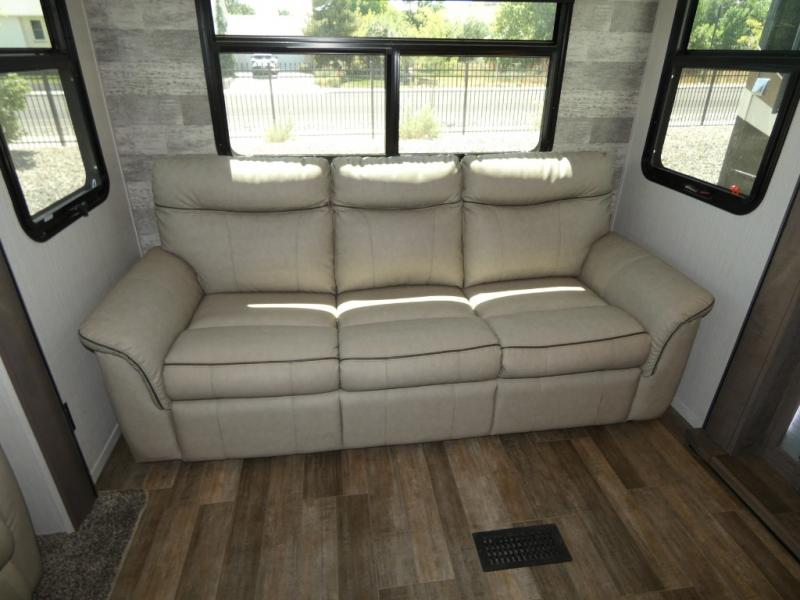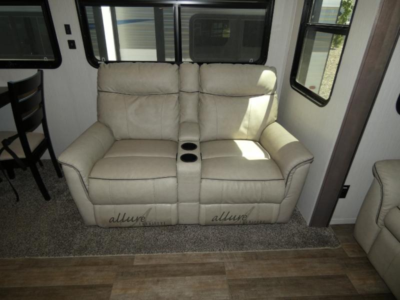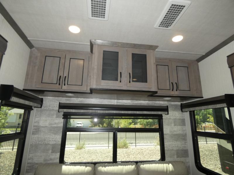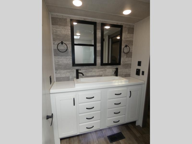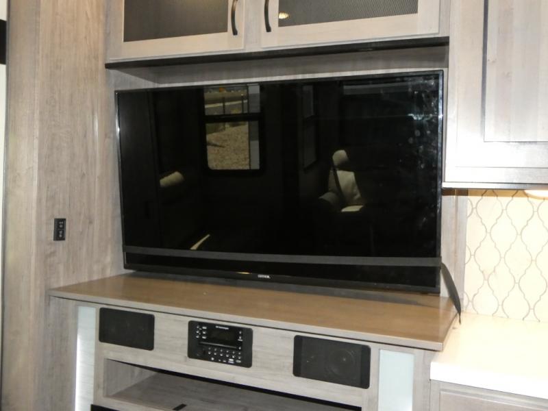 Do you wish to escape the mundane lifestyle? Well then, pick your favorite campsite and hitch up this Cedar Creek fifth wheel! The rear living area has a hide-a-bed sofa for you to bring an extra guest or two and power theater seating across from the entertainment center with a fireplace. The kitchen island will make your meal prep easy. The large kitchen pantry is big enough to store your favorite snacks, and the free-standing table is a great place to enjoy your meals. Just outside the full bathroom is a closet to use as you wish, and inside is a shower with a seat, a linen closet, and a large sink with two faucets.