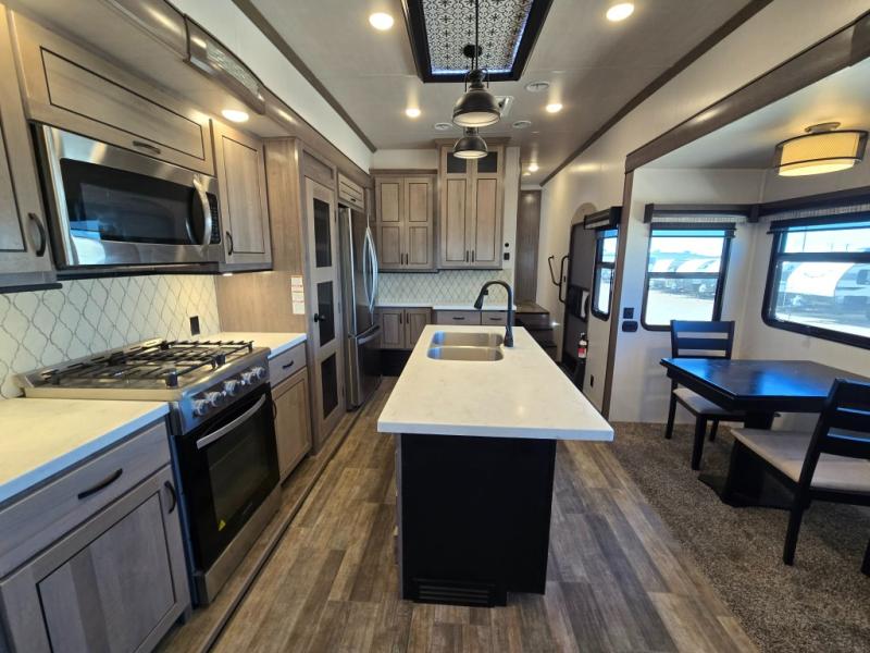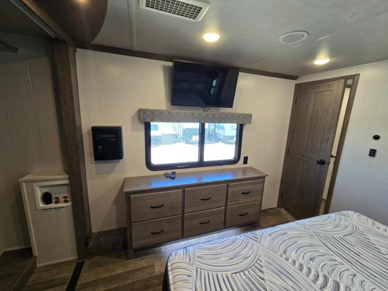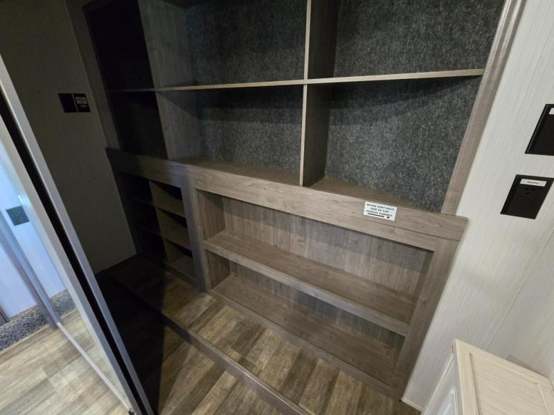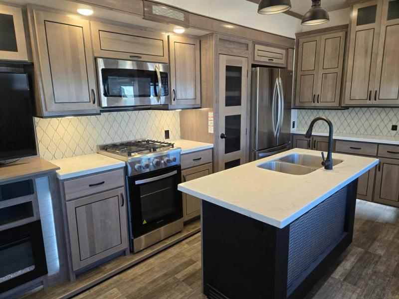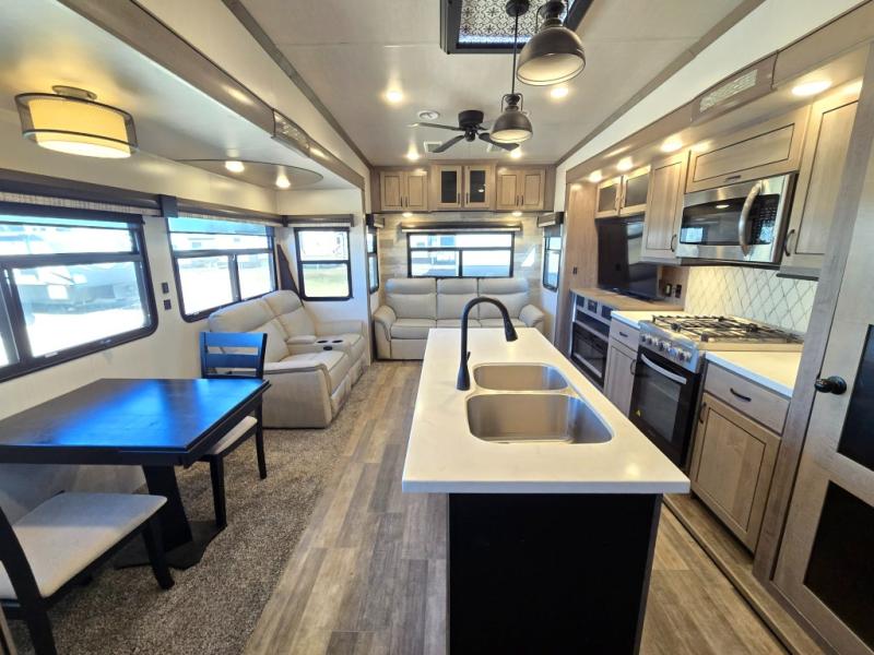 Do you wish to escape the mundane lifestyle? Well then, pick your favorite campsite and hitch up this Cedar Creek fifth wheel! The rear living area has a hide-a-bed sofa for you to bring an extra guest or two and power theater seating across from the entertainment center with a fireplace. The kitchen island will make your meal prep easy, and if you add the optional dishwasher, then you will have an even easier clean up. The large kitchen pantry is big enough to store your favorite snacks, and the free-standing table is a great place to enjoy your meals. Just outside the full bathroom is a closet to use as you wish, and inside is a shower with a seat, a linen closet, and a large sink with two faucets. You can even choose to add the optional exterior pull-out kitchen to breathe in some fresh air while grilling up some burgers!