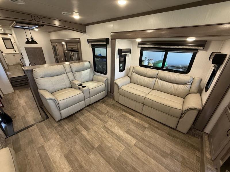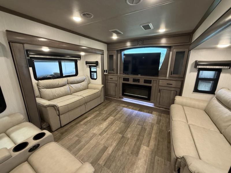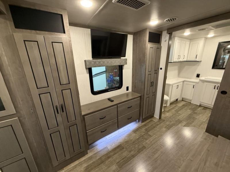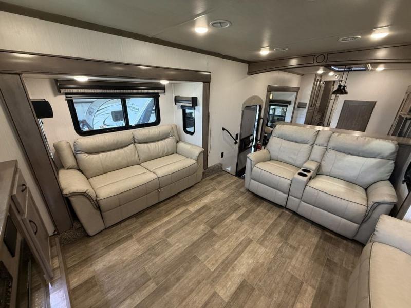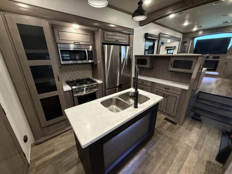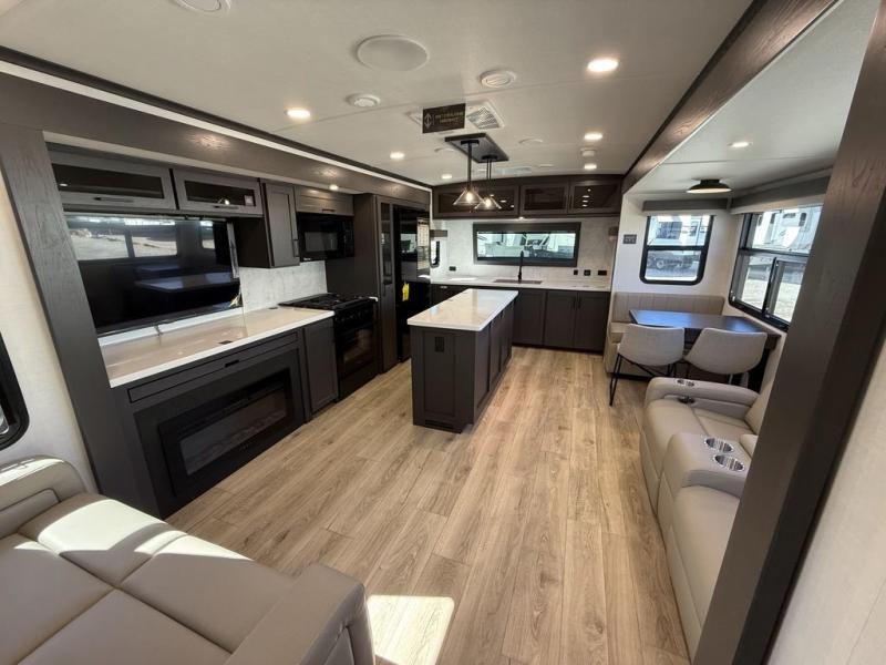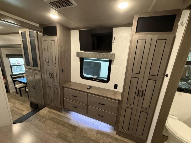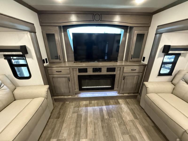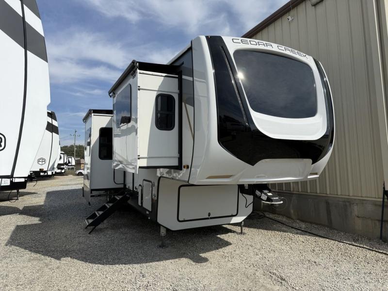 All of the luxurious features throughout this Cedar Creek fifth wheel will astound you! Everything in this unit will have you amazed from the front living area with opposing tri-fold sofas and power theater seating across from the entertainment center with a fireplace and a 50" TV, to the full rear bathroom with drop-down storage, a linen closet, a shower with a seat, plus a closet that is prepped to add the optional washer and dryer. The full bedroom has a king bed across from a dresser with a 32" TV and wardrobes on either side to keep your clothes looking their best. The kitchen is equipped with everything you need to whip up a delicious meal including a kitchen island with a space to add the optional dishwasher, a large pantry that you can choose to add optional shelving to, and a hutch to store your dishes. There are two 15' power awnings to relax underneath and an animal leash latch with a bonus beverage opener!