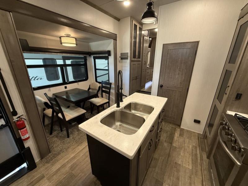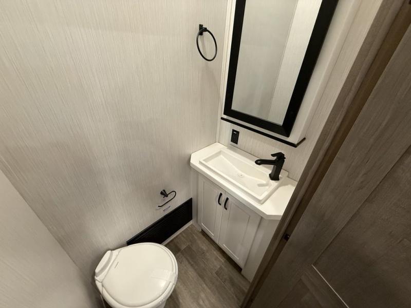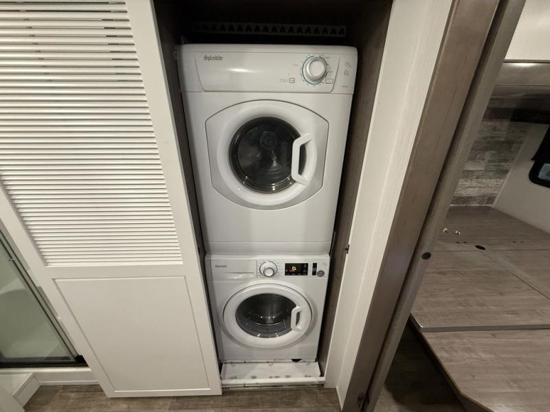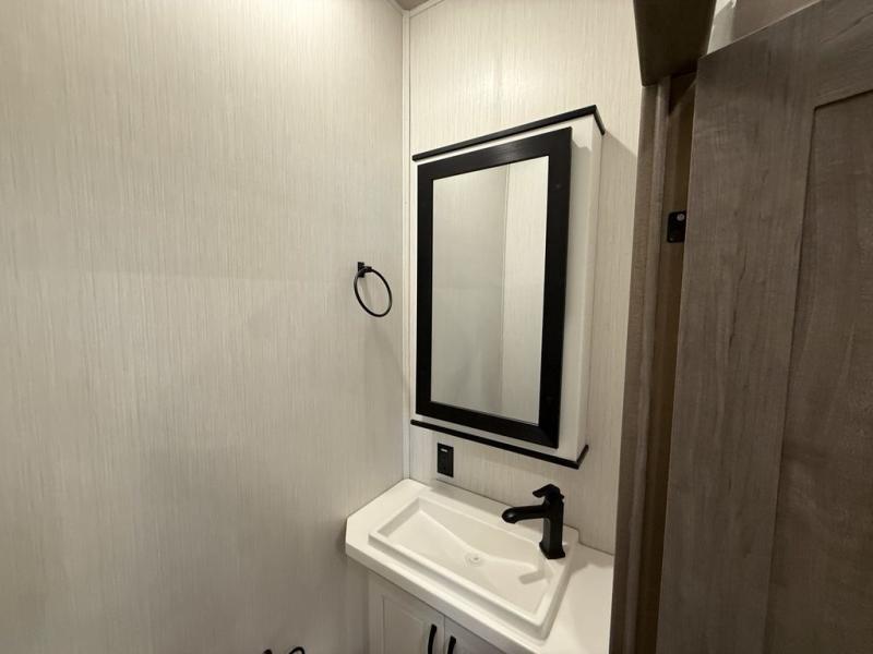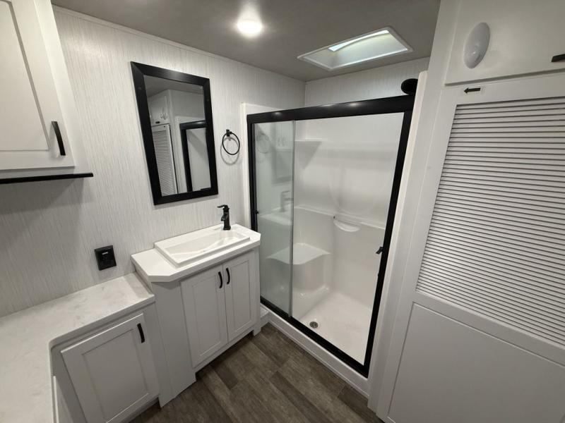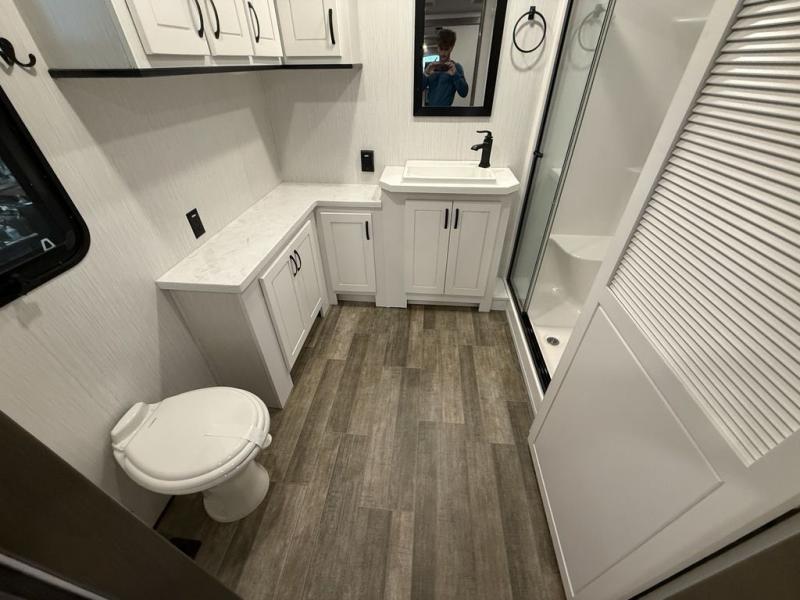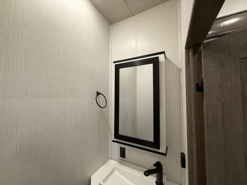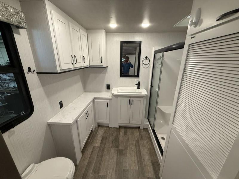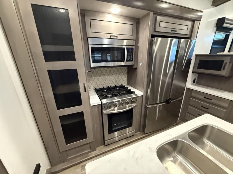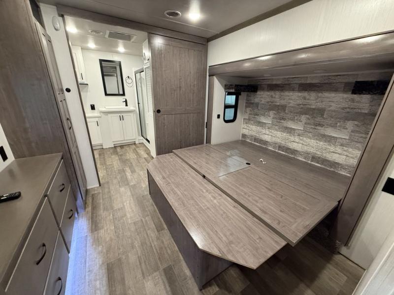 All of the luxurious features throughout this Cedar Creek fifth wheel will astound you! Everything in this unit will have you amazed from the front living area with opposing tri-fold sofas and power theater seating across from the entertainment center with a fireplace and a 50" TV, to the full rear bathroom with drop-down storage, a linen closet, a shower with a seat, plus a closet that is prepped to add the optional washer and dryer. The full bedroom has a king bed across from a dresser with a 32" TV and wardrobes on either side to keep your clothes looking their best. The kitchen is equipped with everything you need to whip up a delicious meal including a kitchen island with a space to add the optional dishwasher, a large pantry that you can choose to add optional shelving to, and a hutch to store your dishes. There are two 15' power awnings to relax underneath and an animal leash latch with a bonus beverage opener!