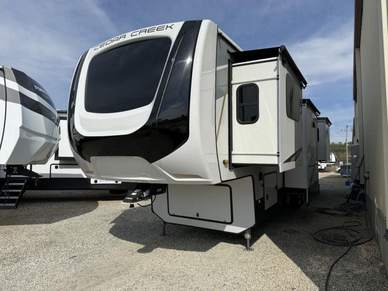 See where the road leads with any one of these Forest River Cedar Creek fifth wheels! They are constructed with the famous Cedar Creek all-aluminum superstructure on 16" centers, a "True" gelcoat exterior, and Silaprene® bonded sidewalls that are resilient, grow stronger with age, and also have an outstanding resistance to UV, heat, cold, moisture, oil/gas, and highway chemicals. The Dexter Performance and Safety Package will give you a peace of mind while driving down the road. You can also bring your furry friend with the animal leash latch, and enjoy your privacy with the Hehr frameless, tinted automotive-style windows. A few other convenient features you are sure to love are the Intervac central vacuum system with a front storage compartment port and interior automatic dustpan, the Congoleum® flooring (carpet mandatory in dining slide), and the USB plug-ins on each side of the king bed. Come choose the model that best suits you today!