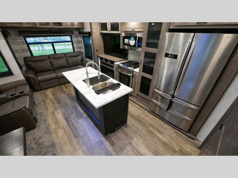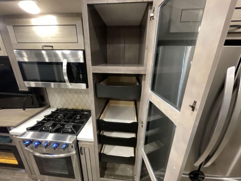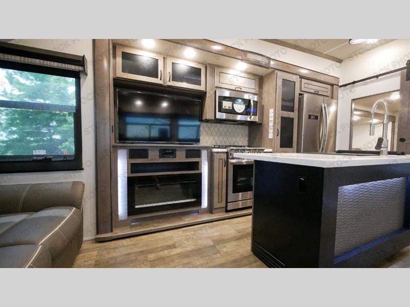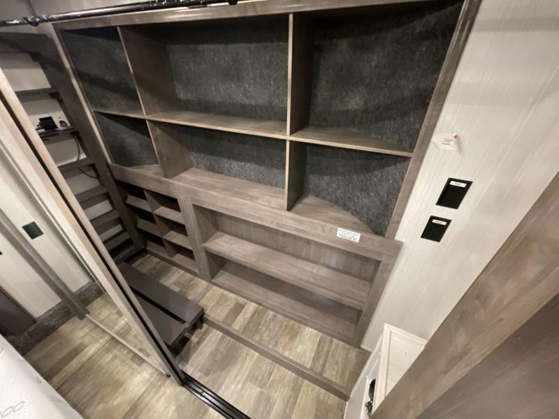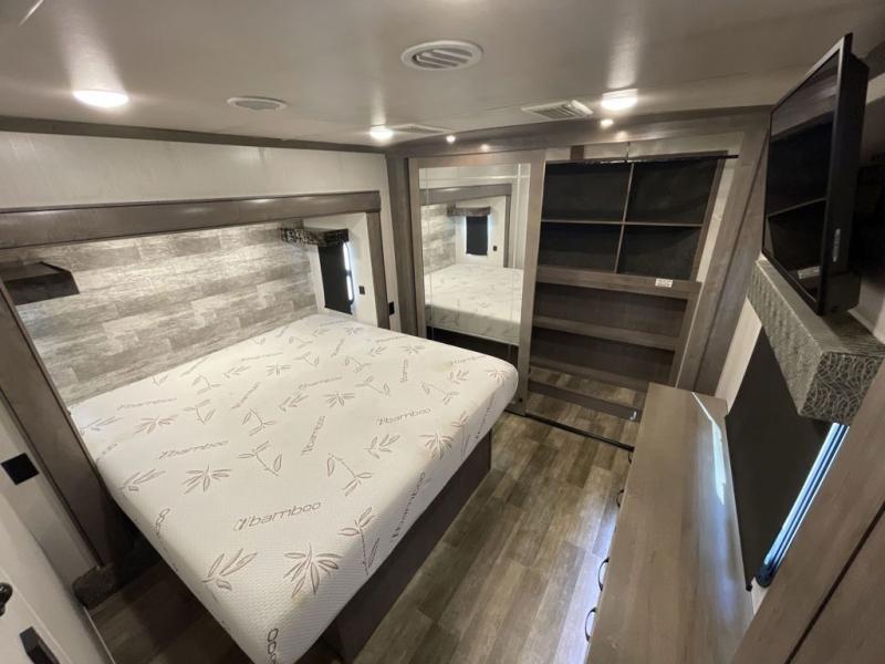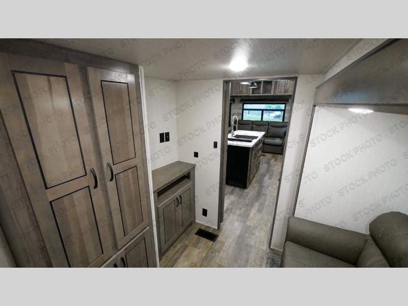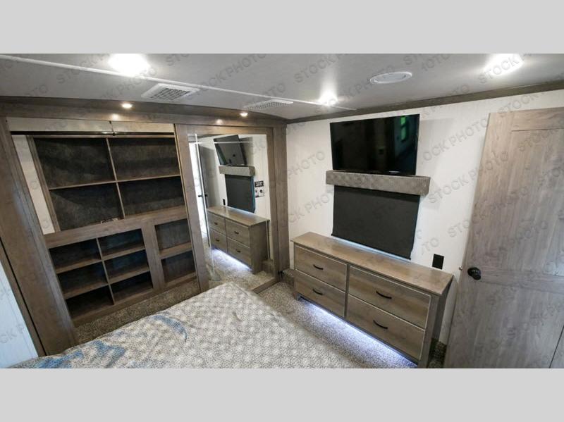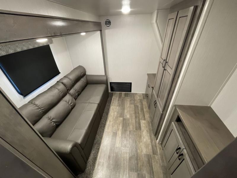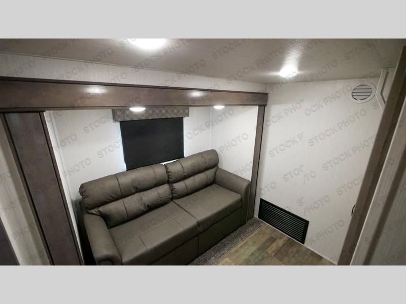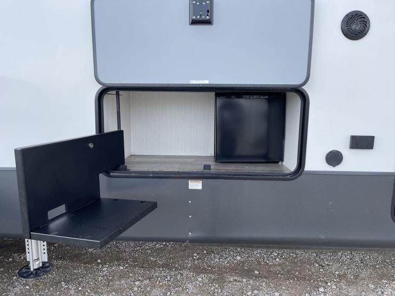 With two bedrooms, everyone will enjoy a good night's rest in this Cedar Creek fifth wheel! The front private bedroom has a king bed across from a dresser with a 32" TV and a full-width wardrobe with storage shelves and an area prepped to add the optional washer and dryer. The second bedroom has hide-a-bed sofa across from a wardrobe with a 91" x 64 1/4" loft above it all for extra sleeping and storage space. Everyone can freshen up each morning in the full bathroom that has an extra large shower and a linen closet to store your towels. You can whip up a delicious home-cooked meal indoors with the kitchen island, or if you wish to add the optional exterior pull-out kitchen, then you can breathe in some fresh air while you grill!