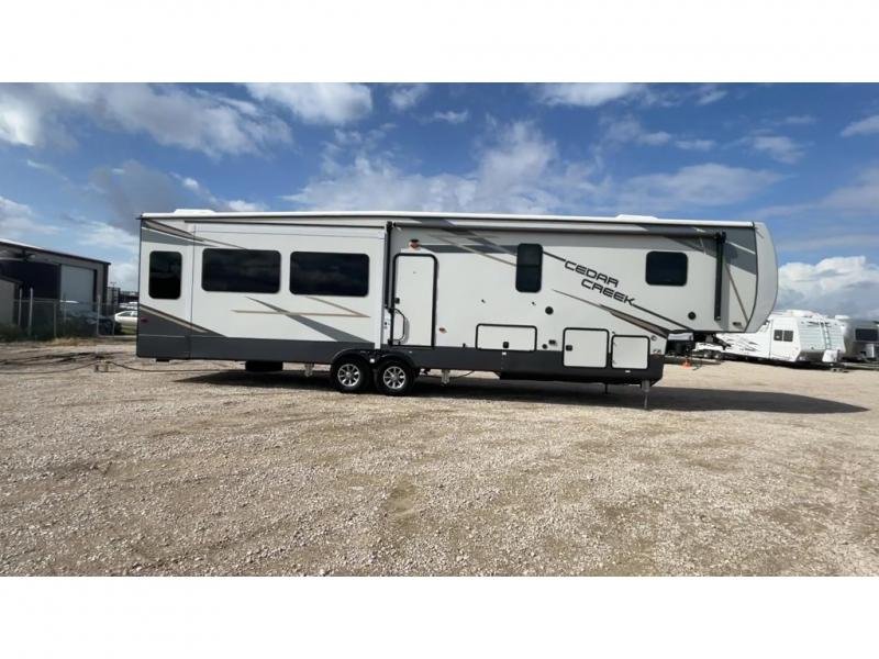 See where the road leads with any one of these Forest River Cedar Creek fifth wheels! They are constructed with the famous Cedar Creek all-aluminum superstructure on 16" centers, a "True" gelcoat exterior, and Silaprene® bonded sidewalls that are resilient, grow stronger with age, and also have an outstanding resistance to UV, heat, cold, moisture, oil/gas, and highway chemicals. The Dexter Performance and Safety Package will give you a peace of mind while driving down the road. You can also bring your furry friend with the animal leash latch, and enjoy your privacy with the Hehr frameless, tinted automotive-style windows. A few other convenient features you are sure to love are the Intervac central vacuum system with a front storage compartment port and interior automatic dustpan, the Congoleum® flooring (carpet mandatory in dining slide), and the USB plug-ins on each side of the king bed. Come choose the model that best suits you today!