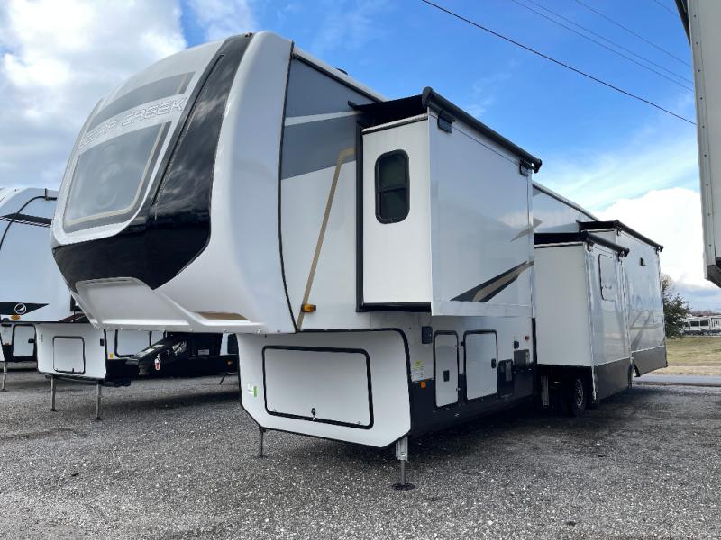 See where the road leads with any one of these Forest River Cedar Creek fifth wheels! They are constructed with the famous Cedar Creek all-aluminum superstructure on 16" centers, a "True" gelcoat exterior, and Silaprene® bonded sidewalls that are resilient, grow stronger with age, and also have an outstanding resistance to UV, heat, cold, moisture, oil/gas, and highway chemicals. The Dexter Performance and Safety Package will give you a peace of mind while driving down the road. You can also bring your furry friend with the animal leash latch, and enjoy your privacy with the Hehr frameless, tinted automotive-style windows. A few other convenient features you are sure to love are the Intervac central vacuum system with a front storage compartment port and interior automatic dustpan, the Congoleum® flooring (carpet mandatory in dining slide), and the USB plug-ins on each side of the king bed. Come choose the model that best suits you today!