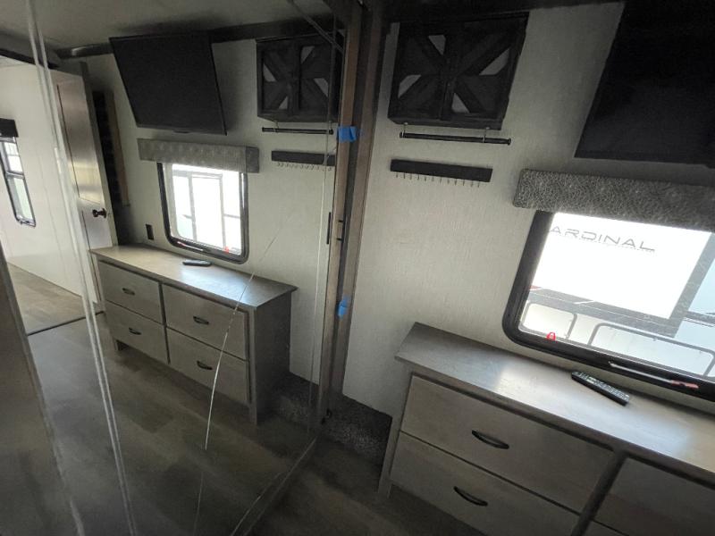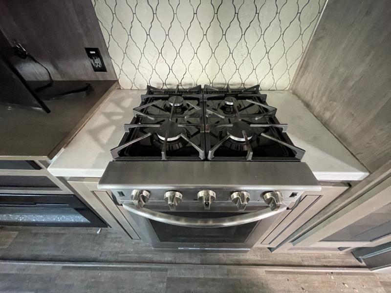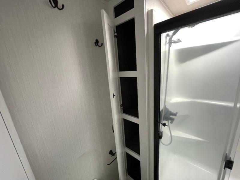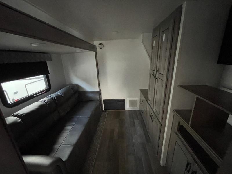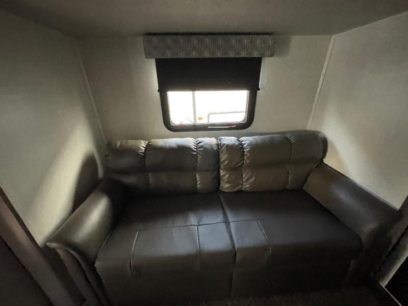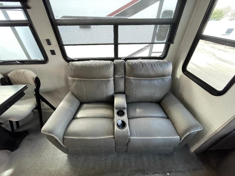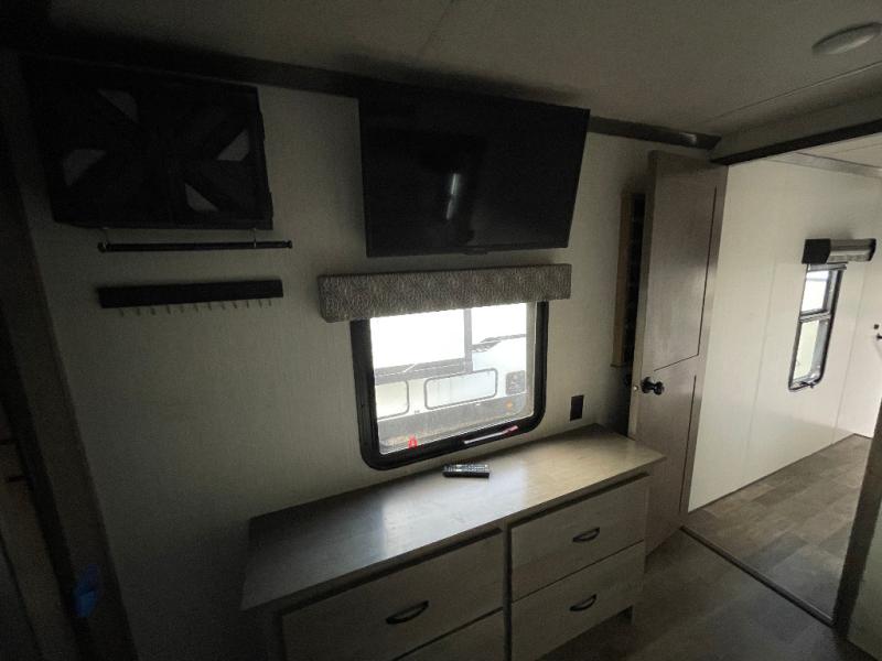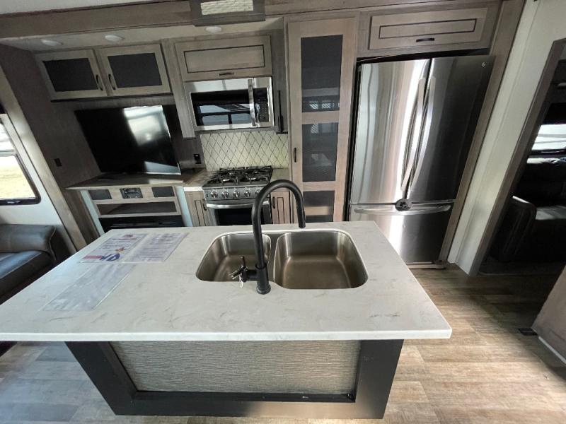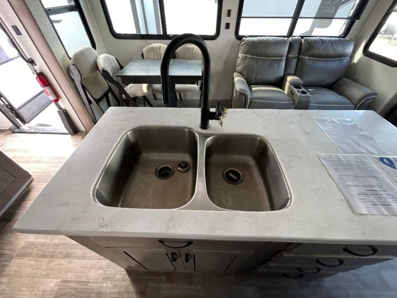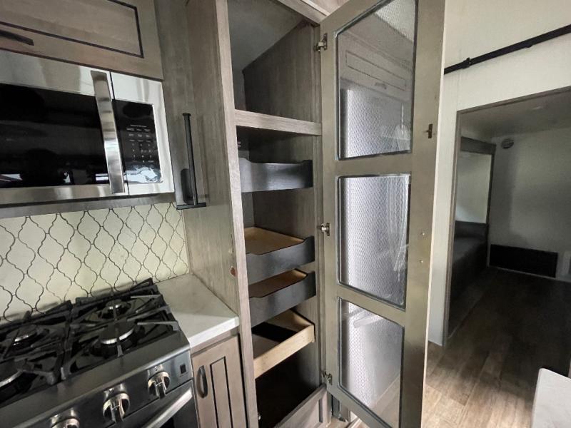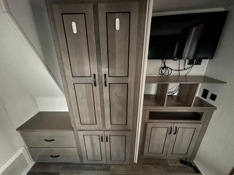 With two bedrooms, everyone will enjoy a good night's rest in this Cedar Creek fifth wheel! The front private bedroom has a king bed across from a dresser with a 32" TV and a full-width wardrobe with storage shelves and an area prepped to add the optional washer and dryer. The second bedroom has hide-a-bed sofa across from a wardrobe with a 91" x 64 1/4" loft above it all for extra sleeping and storage space. Everyone can freshen up each morning in the full bathroom that has a shower with a seat and a linen closet to store your towels. You can whip up a delicious home-cooked meal indoors with the kitchen island, or if you wish to add the optional exterior pull-out kitchen, then you can breathe in some fresh air while you grill!