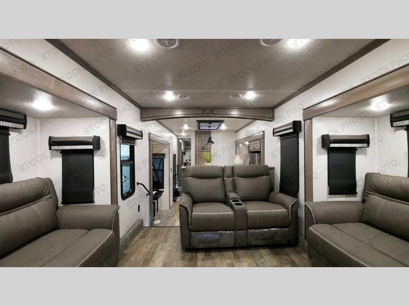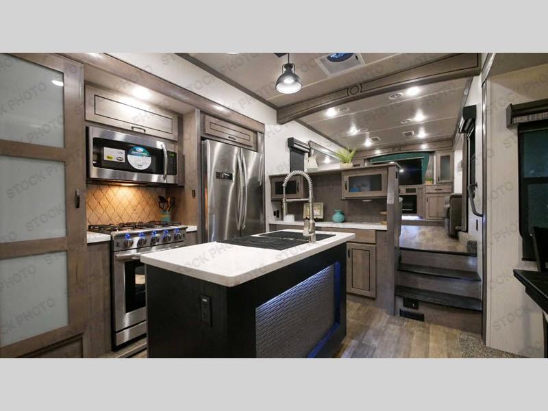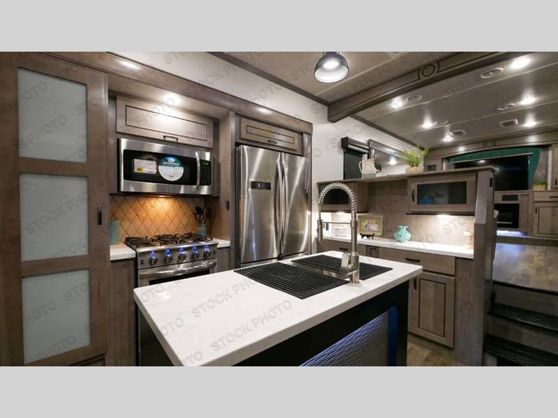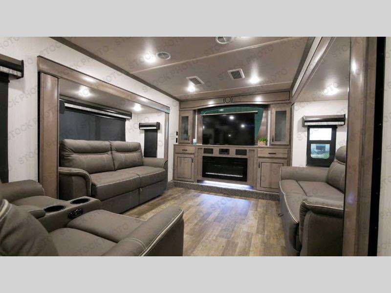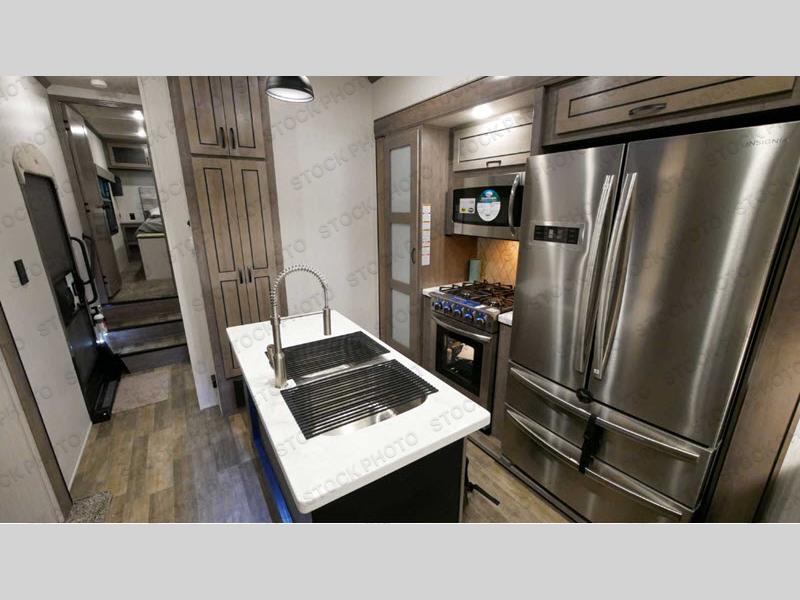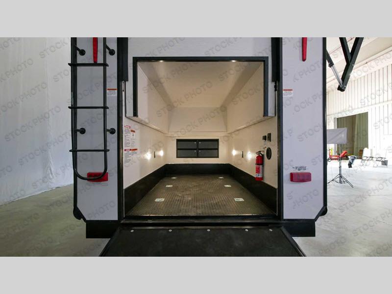 Load up your favorite off-road toys into this luxurious Cedar Creek toy hauler! Once you have unloaded the toys, you can relax on the rear queen bed and then put your clothes away in the wardrobe or sit on the bench with storage. The large kitchen pantry is big enough to store your favorite snacks, and the hutch is a great place to store your nice dishes. You can either prepare dinner indoors or at the outside kitchen with an entertainment center, and then you can head inside and enjoy it at the free-standing table. The front living area has opposing tri-fold sofas for extra sleeping spaces and power theater seating across from the entertainment center with a fireplace and a 50" TV above it. A couple other convenient features you can add are the optional washer and dryer and the optional dishwasher at the kitchen island!