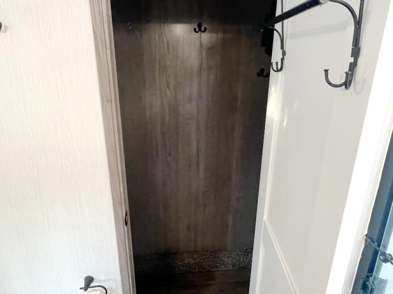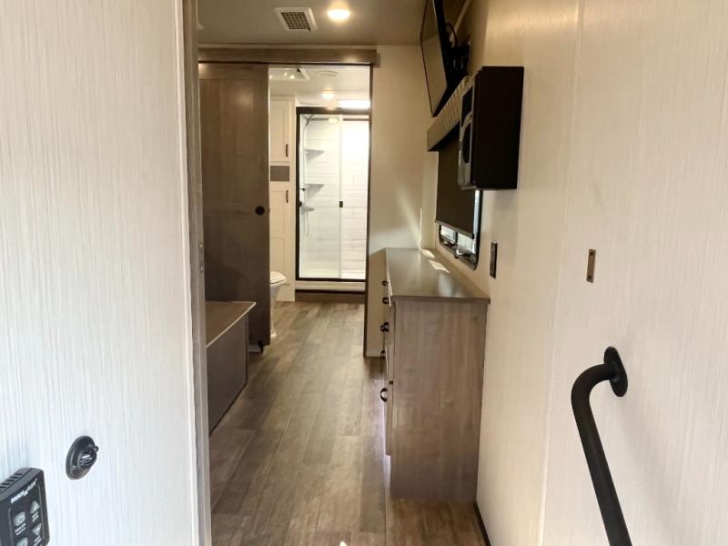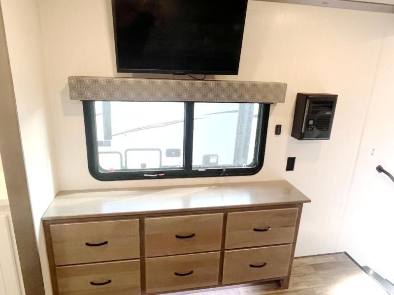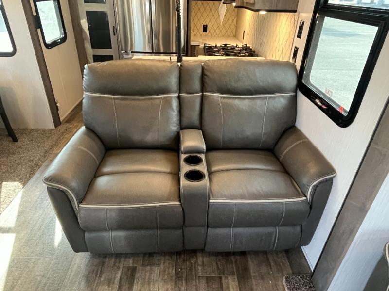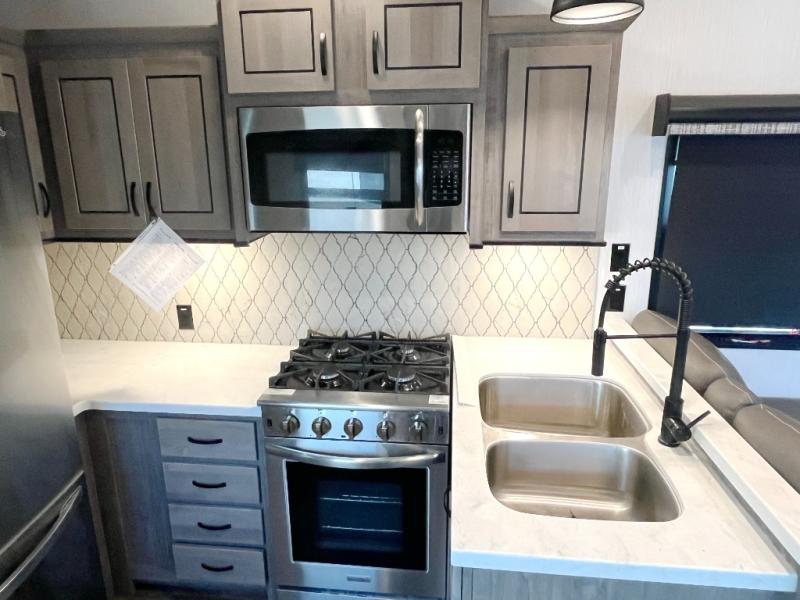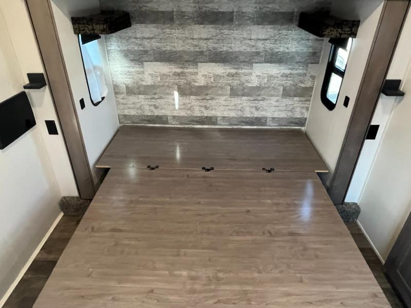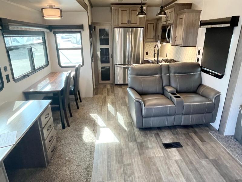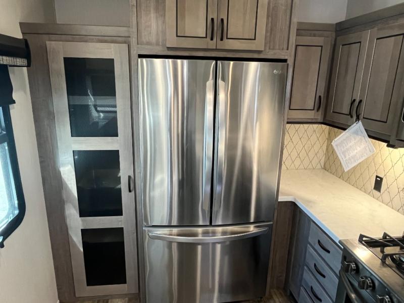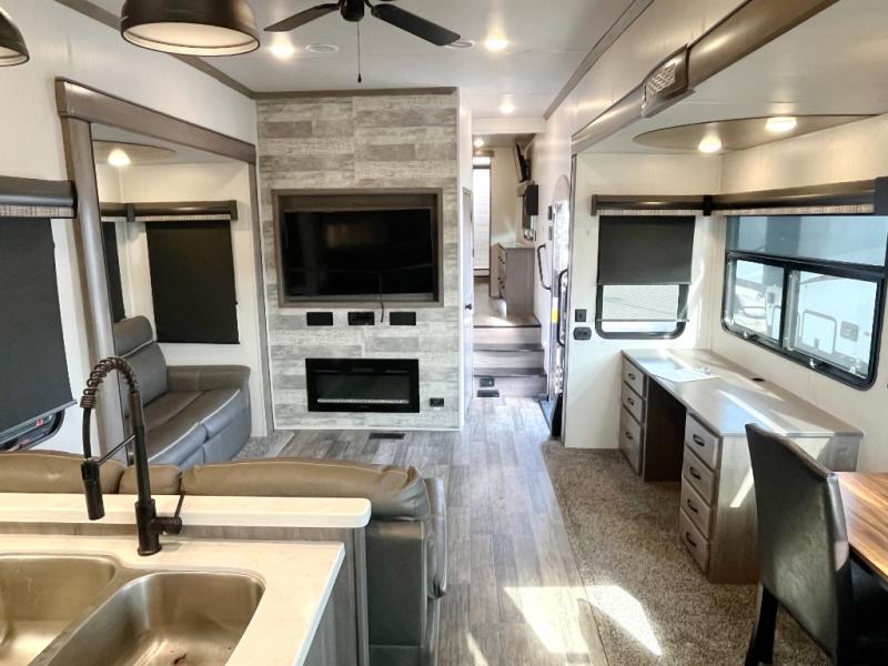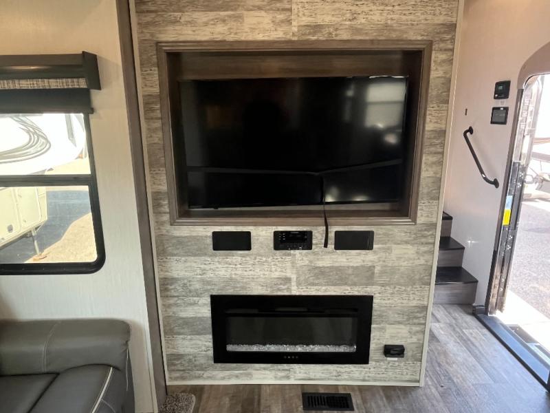This Cedar Creek fifth wheel with a rear kitchen will be a hit with everyone! The kitchen has everything you will need to whip up a delicious home-cooked meal with plenty of counter space, a large pantry to store your canned goods, and a 20-cu. ft. stainless steel refrigerator to store any leftovers, and you can enjoy your meals at the free-standing table. There is also a desk next to it for you to get some work done while you're away, and the desk is across from the living area with a hide-a-bed sofa slide and power theater seating across from the entertainment center with a fireplace and a 50" flat screen TV above it. The half bathroom has a closet that is prepped to add the optional washer and dryer, and the front full bathroom has a large walk-in closet with shelves, a shower with a seat, and a linen closet to store your towels. You can also choose to add the optional exterior pull-out kitchen with a TV lift!