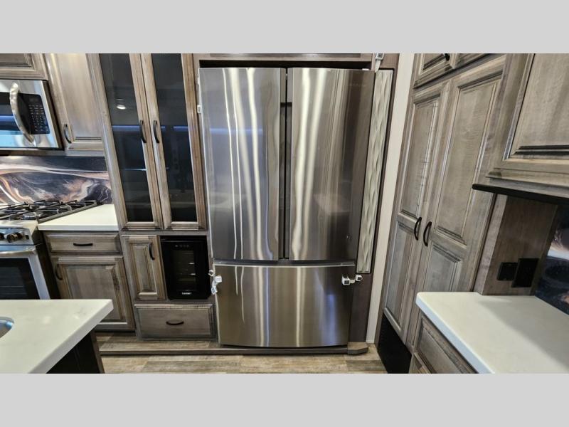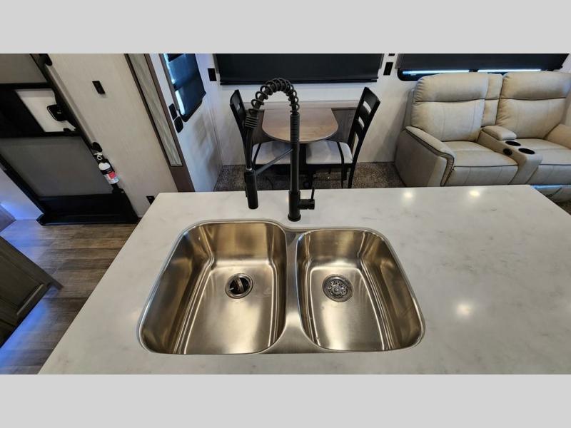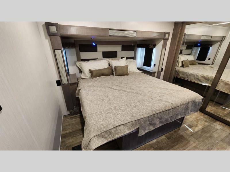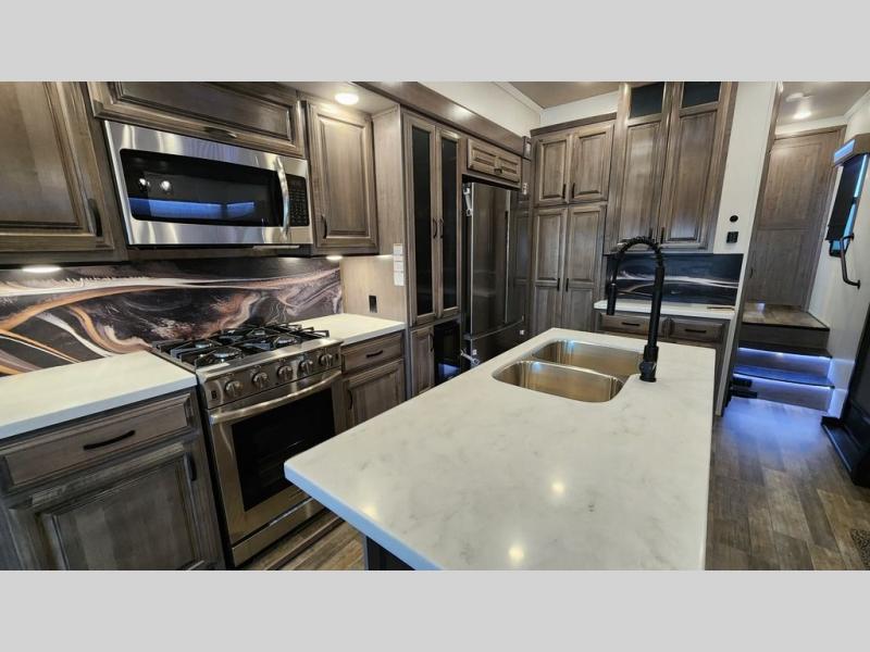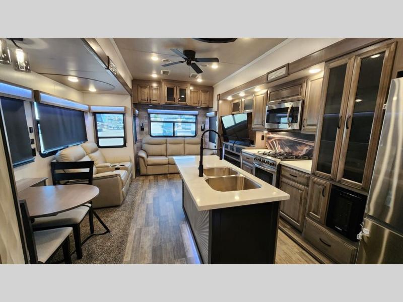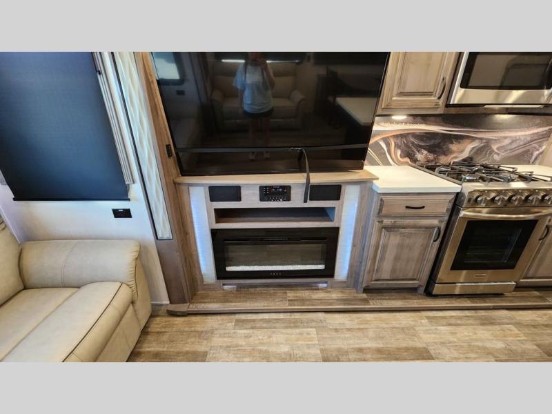 Looking for an RV to stay in for months at a time or full-time, look no further than this luxury fifth wheel. From the three slide outs giving you increased interior space, to the power theater seats directly across from the fireplace and 55" 4K TV with swing arm, you will feel right at home! The kitchen island has a double sink, extra counter space, plus you can add an optional dishwasher drawer which will speed up the clean-up process. Enjoy your meals at the pull-out dinette, and at night head up the stairs to the private front bedroom where you will find a upgraded luxury king mattress, a full-length wardrobe for your clothes with storage shelves, plus there is a spot that has been prepped for a washer and dryer option so that you can easily keep up with the laundry while you are away from home. You might like to add a few options to enhance the already amazing features such as an exterior pull-out kitchen, the full body paint package, a Cedar Creek party center, and/or the wireless rear camera observation system.