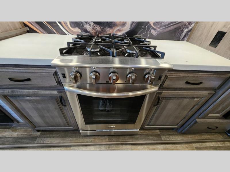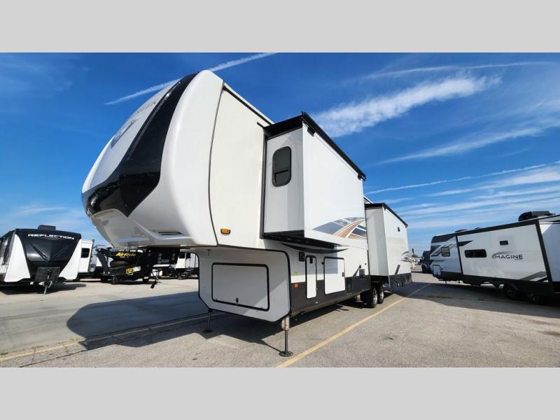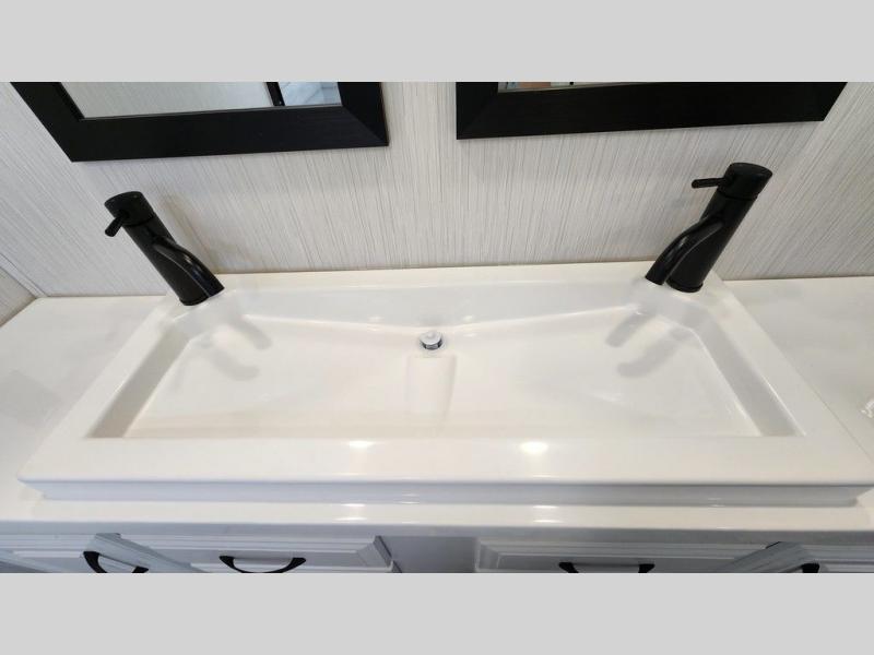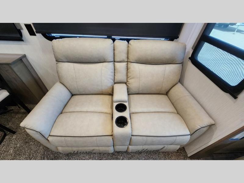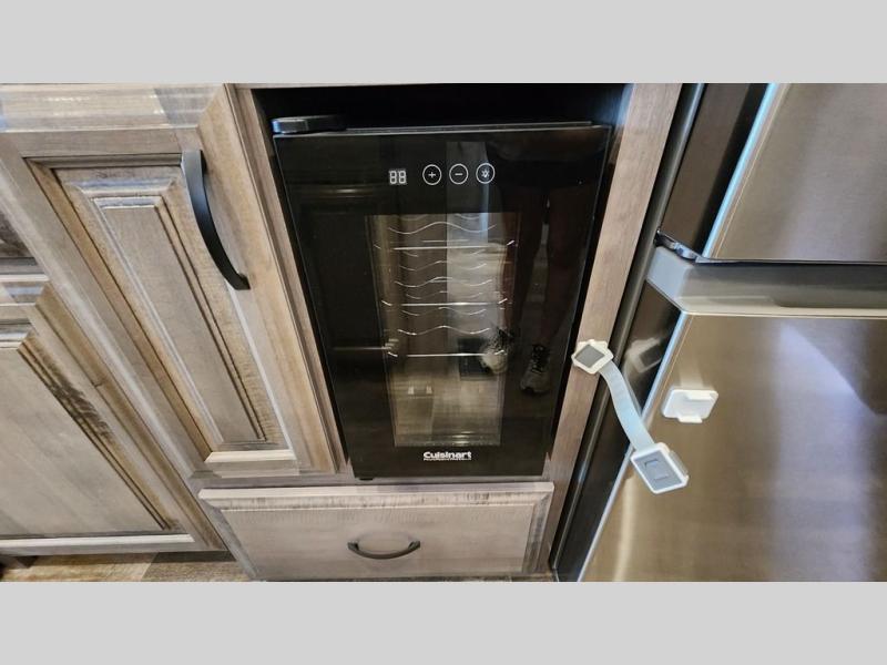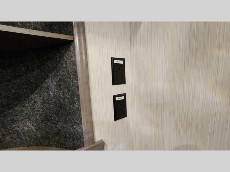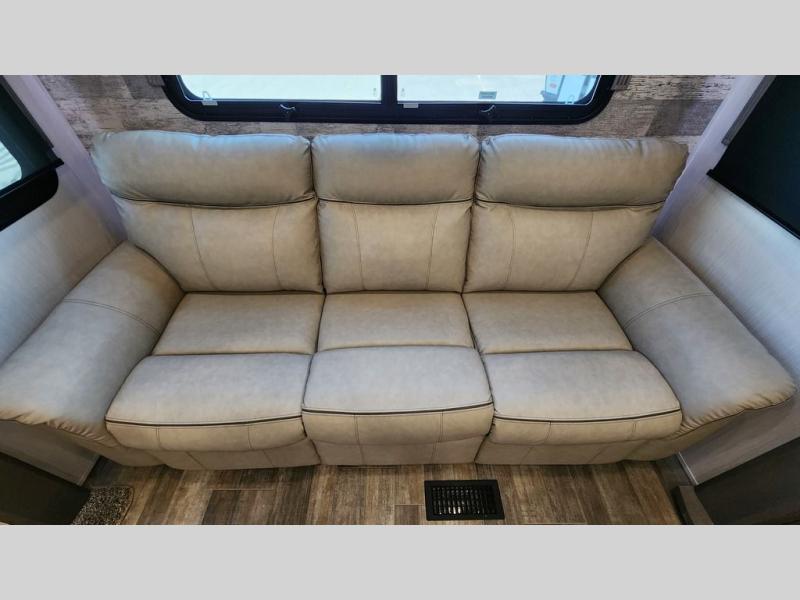 Looking for an RV to stay in for months at a time or full-time, look no further than this luxury fifth wheel. From the three slide outs giving you increased interior space, to the power theater seats directly across from the fireplace and 55" 4K TV with swing arm, you will feel right at home! The kitchen island has a double sink, extra counter space, plus you can add an optional dishwasher drawer which will speed up the clean-up process. Enjoy your meals at the pull-out dinette, and at night head up the stairs to the private front bedroom where you will find a upgraded luxury king mattress, a full-length wardrobe for your clothes with storage shelves, plus there is a spot that has been prepped for a washer and dryer option so that you can easily keep up with the laundry while you are away from home. You might like to add a few options to enhance the already amazing features such as an exterior pull-out kitchen, the full body paint package, a Cedar Creek party center, and/or the wireless rear camera observation system.