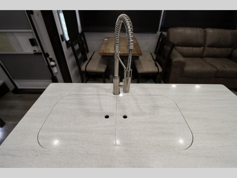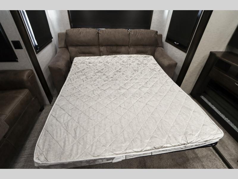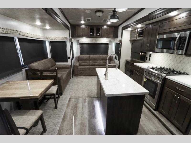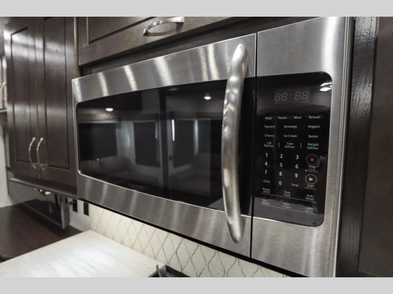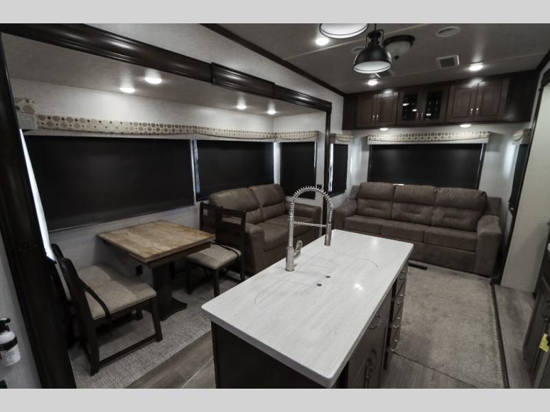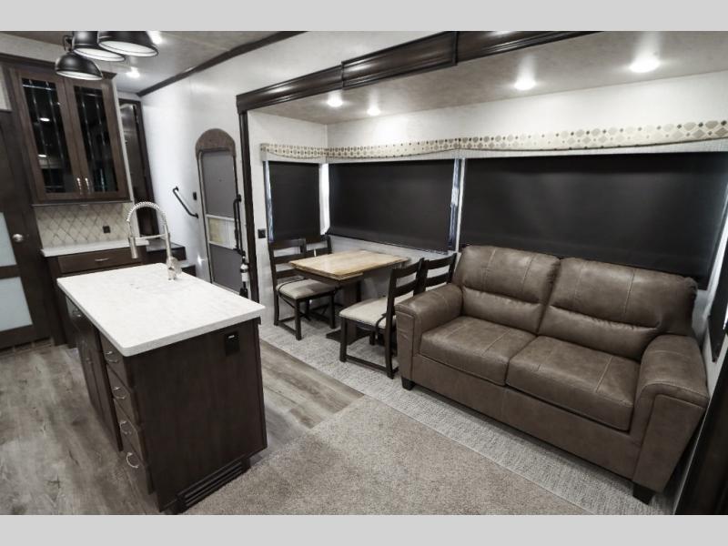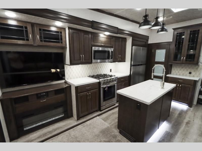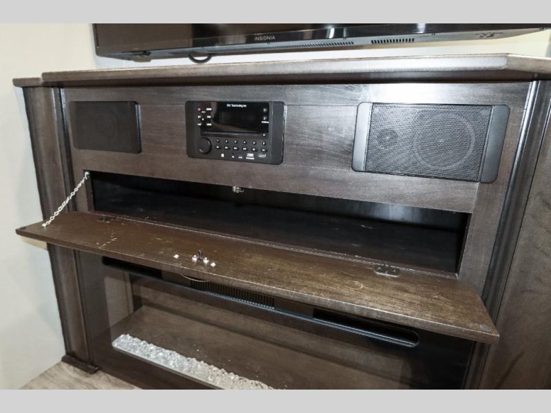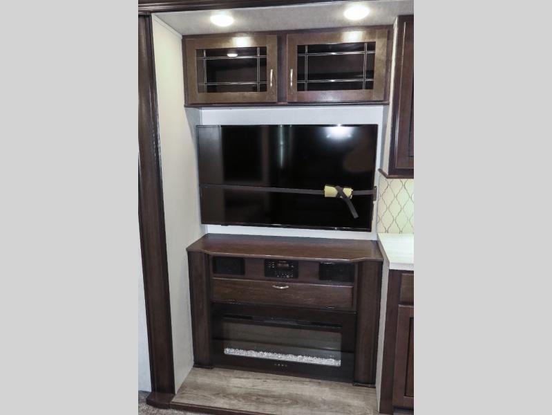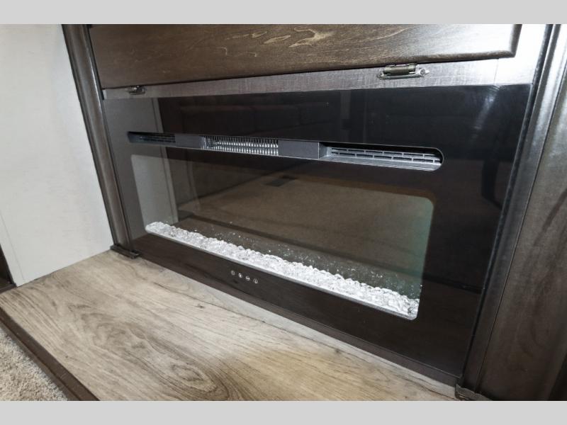 Are you ready to get away for the weekend while still enjoying the luxuries of home? Well then come check out this fifth wheel! It has a convenient kitchen island to provide more counter space and a double bowl sink with a high rise faucet to make clean up a breeze. You will also enjoy relaxing on the sofa or on the power theater seats while you watch a movie on the 50" TV on swing arm. If it's a chilly evening, everyone will love to watch the glow of the fireplace as you reminisce about your day. Mom and dad will love the front private bedroom that features a king bed slide out and a redesigned front wardrobe closet with removable shelves to add a washer and dryer if you choose.