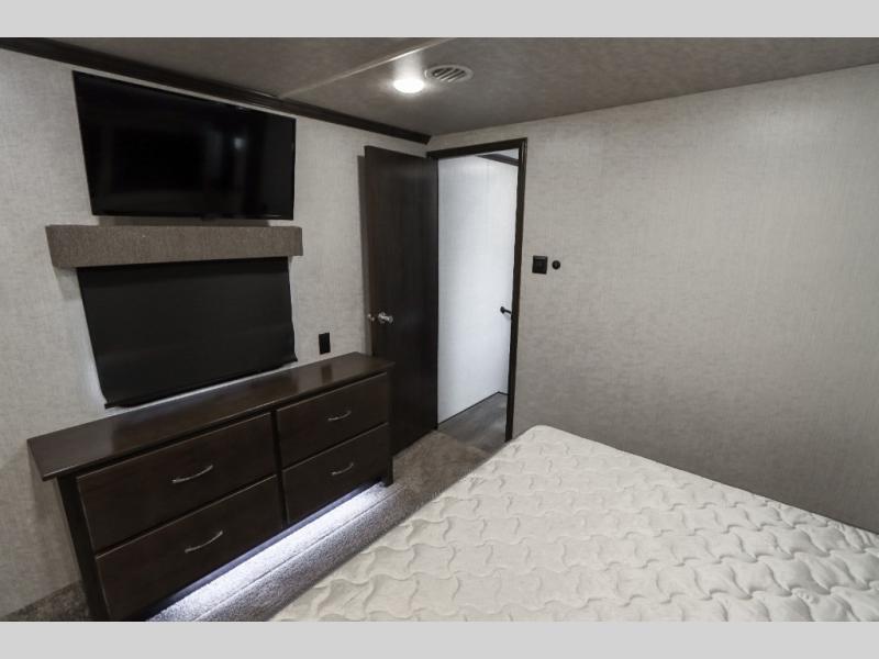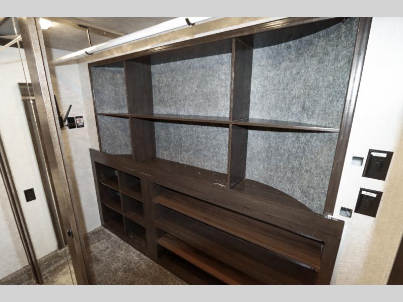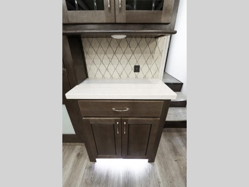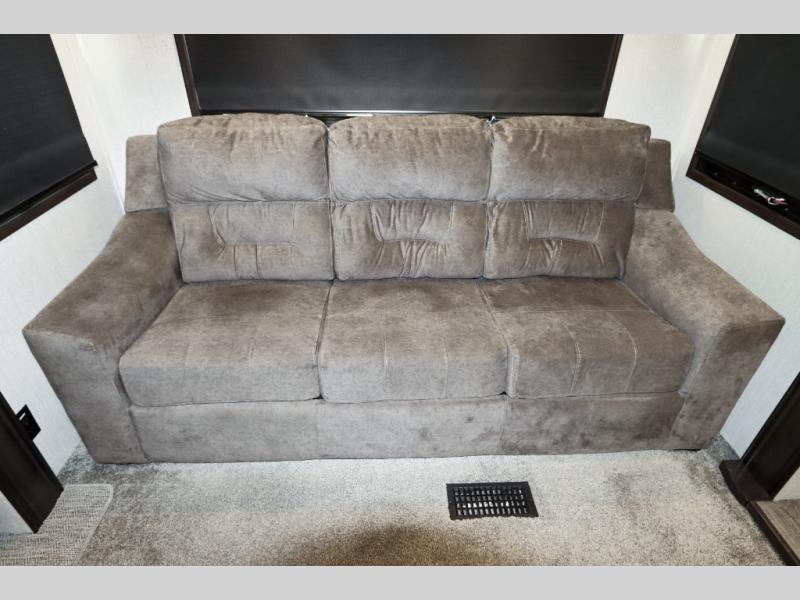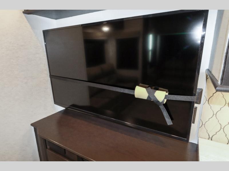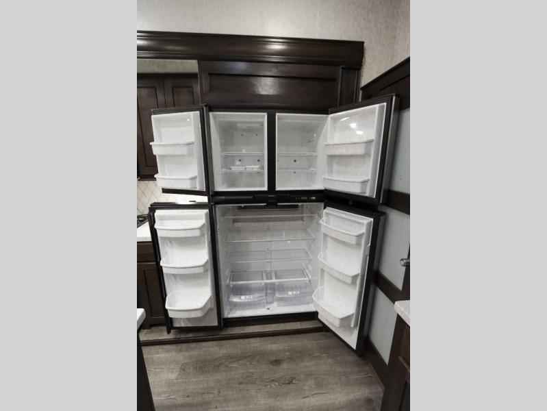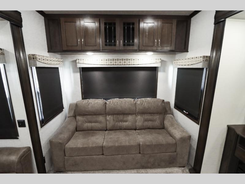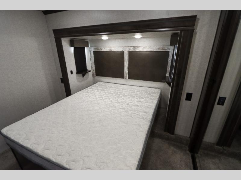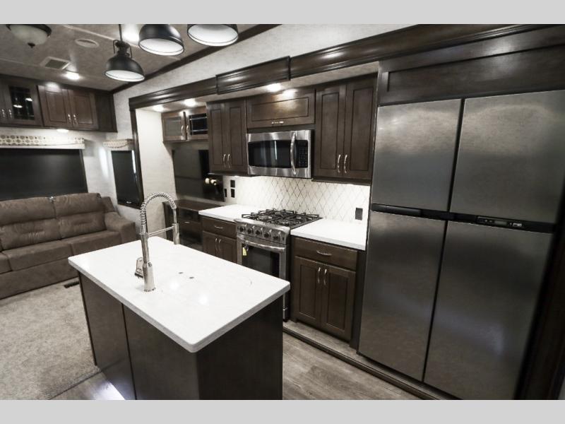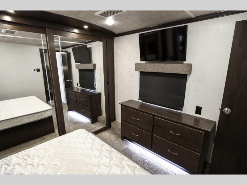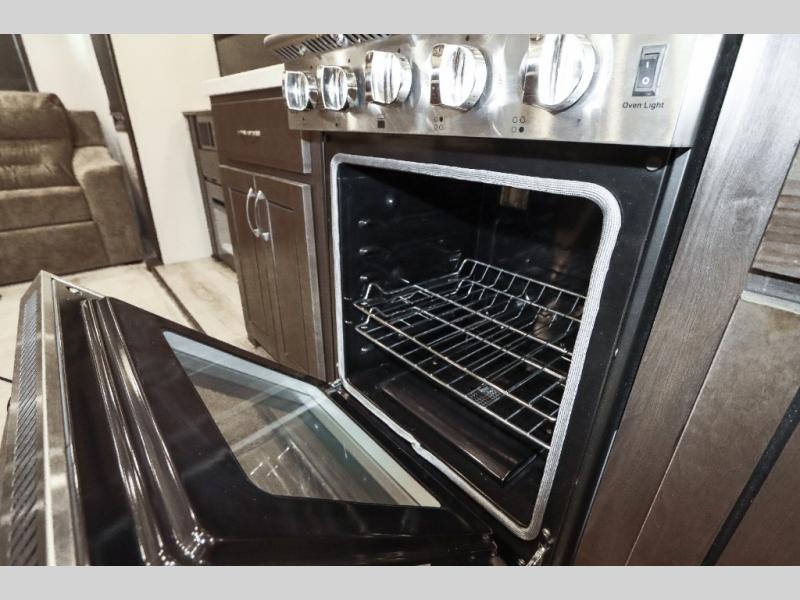 Are you ready to get away for the weekend while still enjoying the luxuries of home? Well then come check out this fifth wheel! It has a convenient kitchen island to provide more counter space and a double bowl sink with a high rise faucet to make clean up a breeze. You will also enjoy relaxing on the sofa or on the power theater seats while you watch a movie on the 50" TV on swing arm. If it's a chilly evening, everyone will love to watch the glow of the fireplace as you reminisce about your day. Mom and dad will love the front private bedroom that features a king bed slide out and a redesigned front wardrobe closet with removable shelves to add a washer and dryer if you choose.
