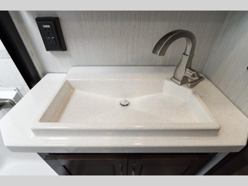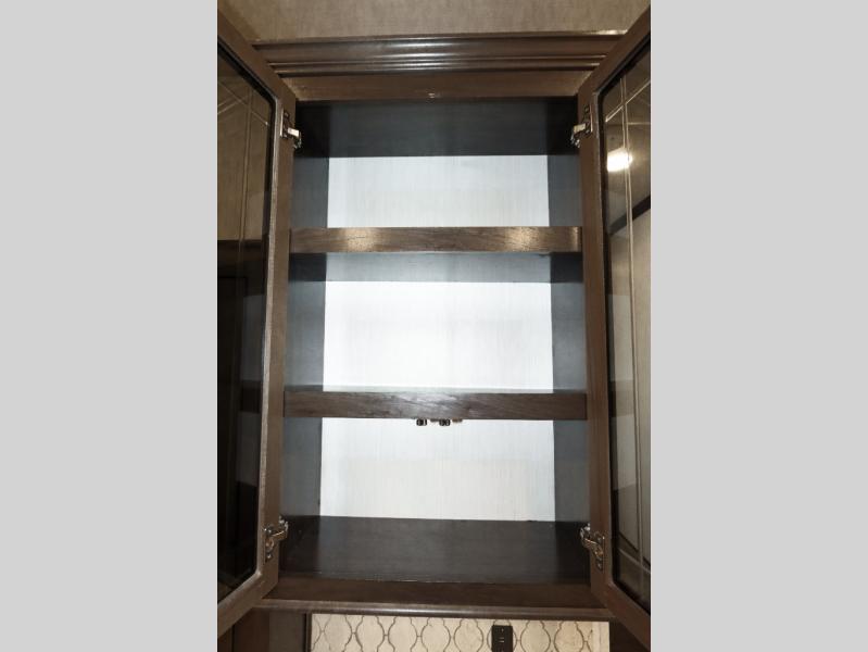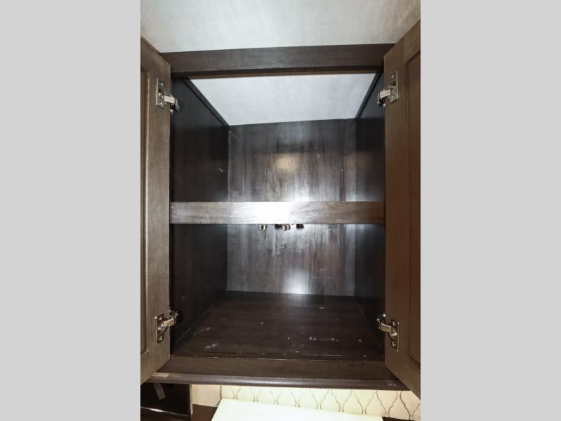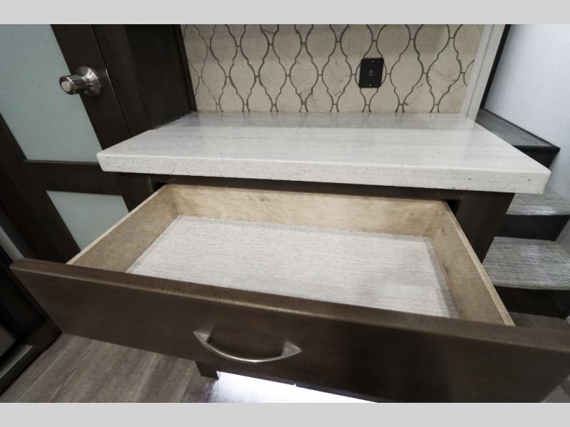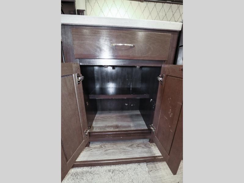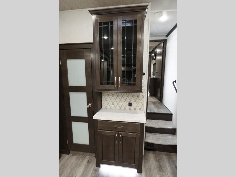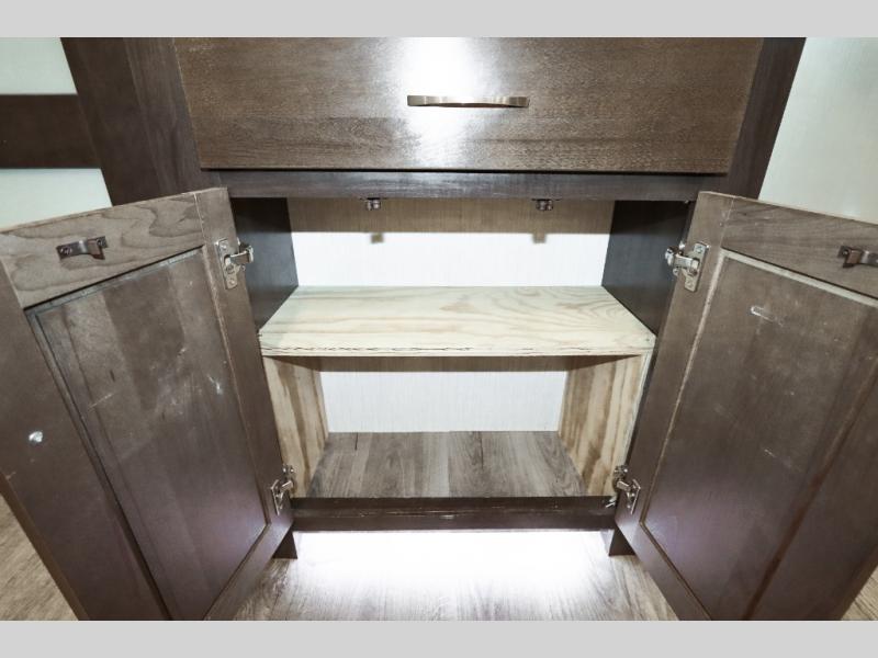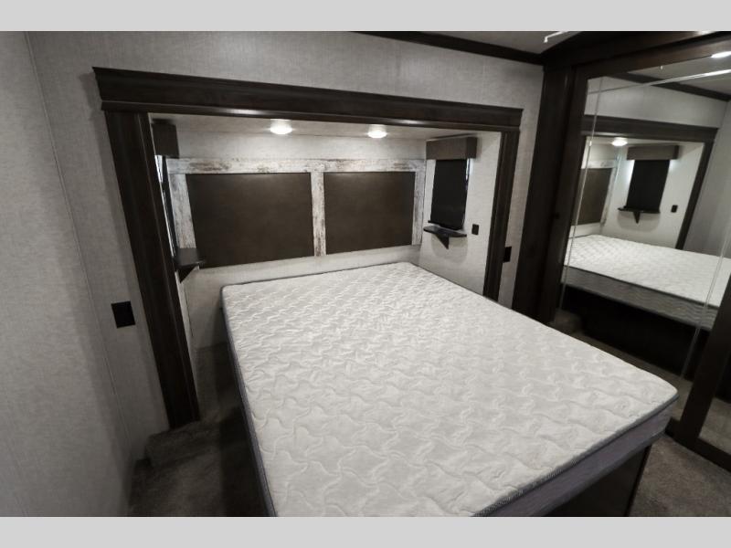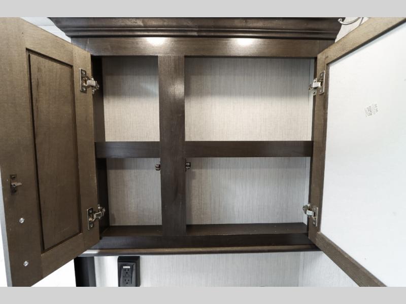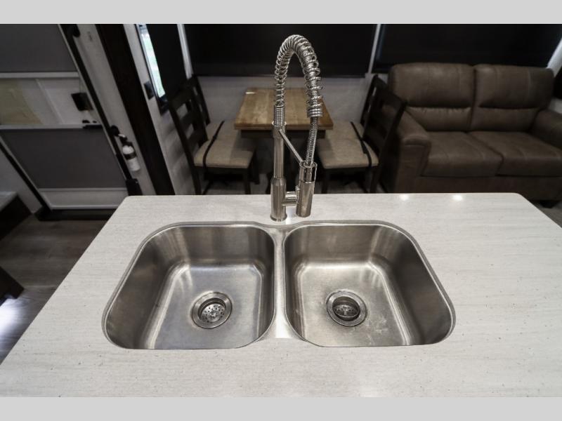 Are you ready to get away for the weekend while still enjoying the luxuries of home? Well then come check out this fifth wheel! It has a convenient kitchen island to provide more counter space and a double bowl sink with a high rise faucet to make clean up a breeze. You will also enjoy relaxing on the sofa or on the power theater seats while you watch a movie on the 50" TV on swing arm. If it's a chilly evening, everyone will love to watch the glow of the fireplace as you reminisce about your day. Mom and dad will love the front private bedroom that features a king bed slide out and a redesigned front wardrobe closet with removable shelves to add a washer and dryer if you choose.