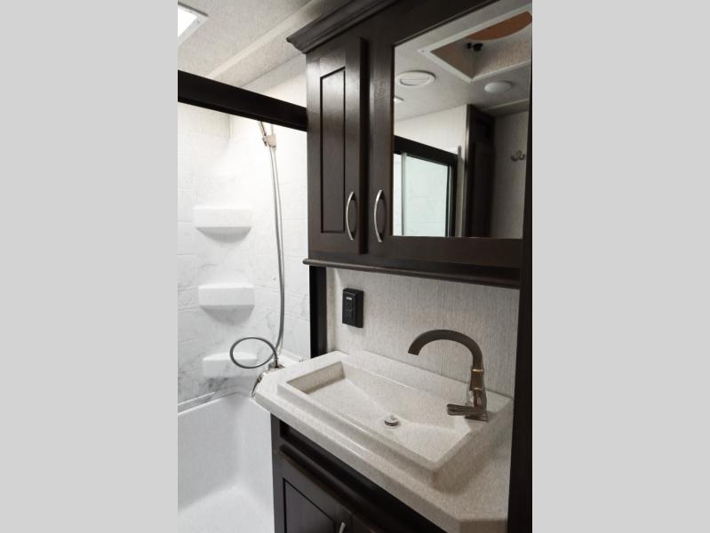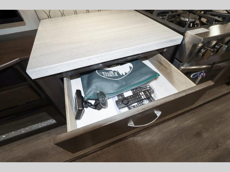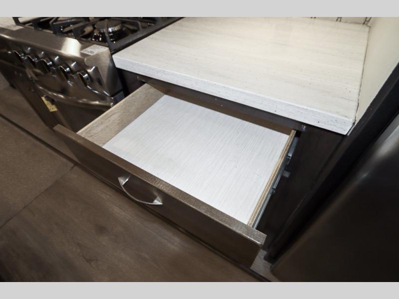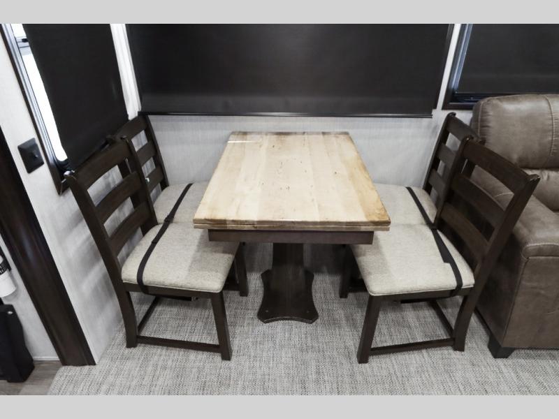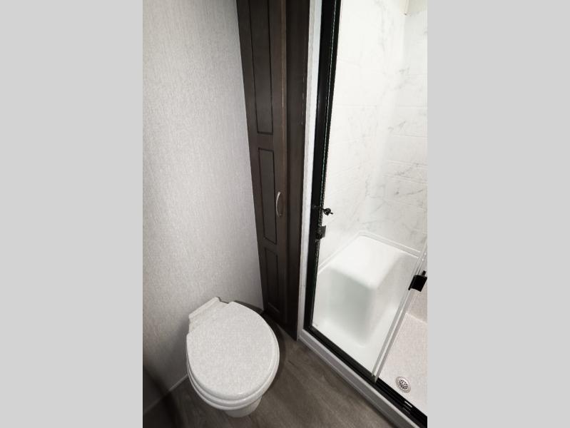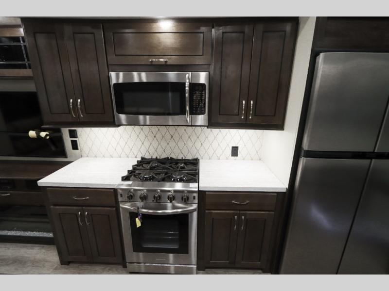 With any Forest River Cedar Creek Silverback Edition fifth wheel you will find Congoleum carefree flooring throughout and in the dining slide there is Shaw carpeting to give an at-home feel. The kitchen has everything that you would expect to find at home, including an Insignia, free-standing 24" four burner gas range, solid surface countertops, a 20 cu.ft. stainless steel refrigerator with an icemaker, and a Fantastic Create-A-Breeze fan with a rain sensor and thermostat. Each model features a fireplace, under-bed storage for all your luggage, a rectangular shower with a large seat and sliding glass doors, plus a space that has been prepped to add a washer and dryer if you choose. These models also include Dexter Heavy Duty Axles with E-Z Lube Hubs, Dexter Nev-R-Adjust Brakes, plus Dexter E-Z Flex Suspension with greased Zerk fittings for a smooth ride each trip!