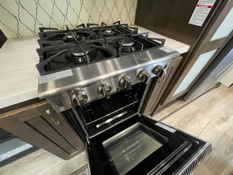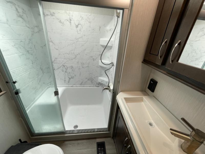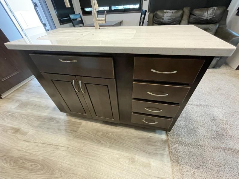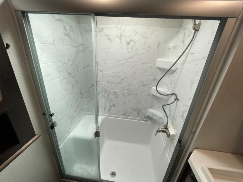 With any Forest River Cedar Creek Silverback Edition fifth wheel you will find Congoleum carefree flooring throughout and in the dining slide there is Shaw carpeting to give an at-home feel. The kitchen has everything that you would expect to find at home, including an Insignia, free-standing 24" four burner gas range, solid surface countertops, a 20 cu.ft. stainless steel refrigerator with an icemaker, and a Fantastic Create-A-Breeze fan with a rain sensor and thermostat. Each model features a fireplace, under-bed storage for all your luggage, a rectangular shower with a large seat and sliding glass doors, plus a space that has been prepped to add a washer and dryer if you choose. These models also include Dexter Heavy Duty Axles with E-Z Lube Hubs, Dexter Nev-R-Adjust Brakes, plus Dexter E-Z Flex Suspension with greased Zerk fittings for a smooth ride each trip!