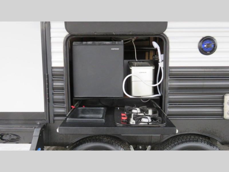 Answer the beckoning call with one of these Forest River Cherokee travel trailers or toy haulers! With a Power Gear™ frame technology, a premium wheel package, an armored underbelly tank enclosure, and seamless roofing membrane with heat reflectivity, you will enjoy a unit that will last through any adventure. The Chef Select black stainless steel kitchen suite package gives you the ability to prepare delicious home cooked meals even in the woods. The supersized, 15,000 BTU central air conditioning unit has a quick cool air dump feature to keep you cool even on the hottest summer days. You can also rinse off your feet before entering the unit with the outside shower with hot and cold water. Come take a look at all the other features!