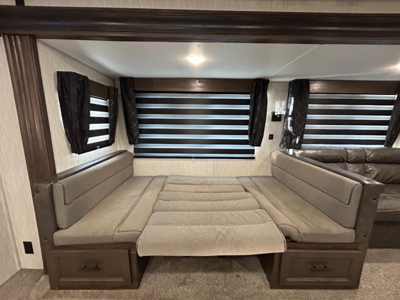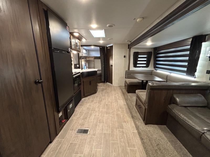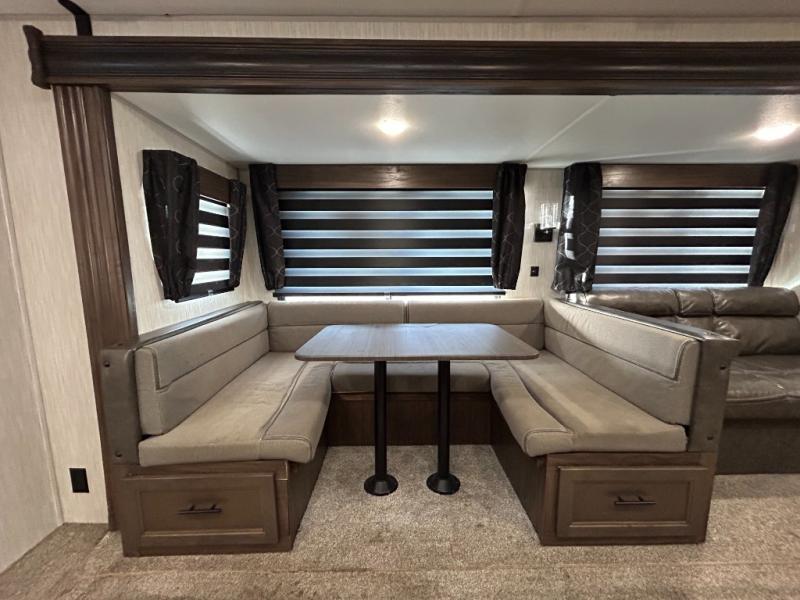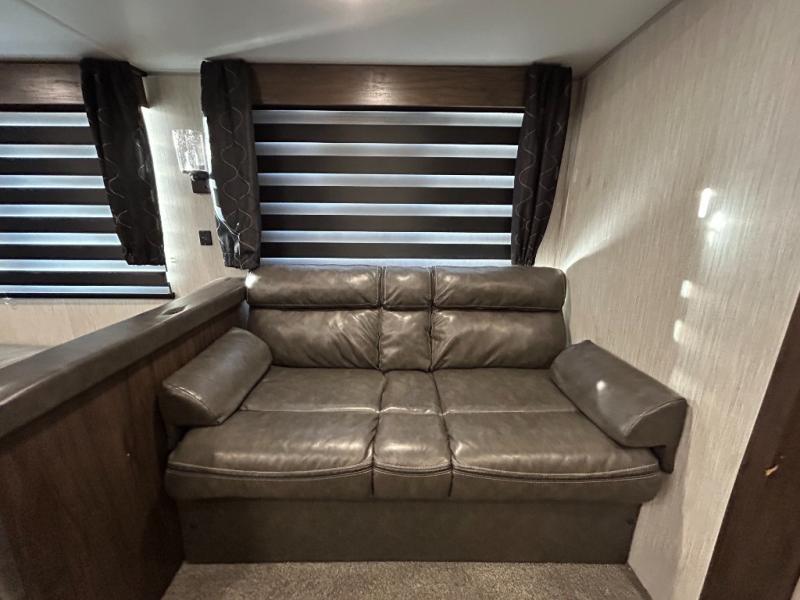 This Cherokee travel trailer can certainly house a bunch of campers looking for a fun weekend getaway! With double-size bunks and a queen-size bed, plus a sofa and a U-shaped dinette, you will have easy sleeping for ten. So gather the family and a few extra friends and head out for a great time to explore, relax, and just simply enjoy. You will find the large slide out provides a nice amount of space in the main living/dining area, and the private bedroom features its own exterior entrance door. You will also find that this unit provides loads of storage for your gear and necessities both inside and out!