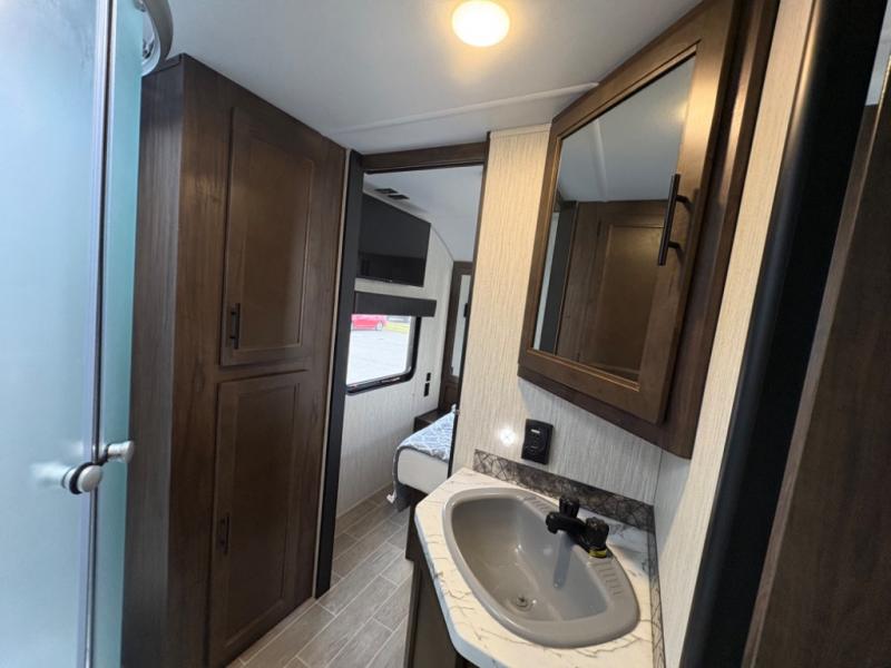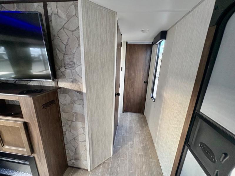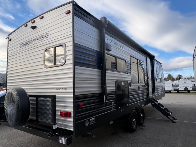 Fall in love with everything about this single-slide Cherokee travel trailer by Forest River. This model features a rear kitchen where you can easily prepare your favorite meals for your family. After you set up camp outside, come inside and relax on the sofa or booth dinette which can both be easily converted into additional sleeping space at night. The bathroom can be accessed from one of the two entry doors that lead into the main hallway and the master suite. Outside, enjoy the extra storage space with the pass-through storage, an outside kitchen, and an outside TV mount!