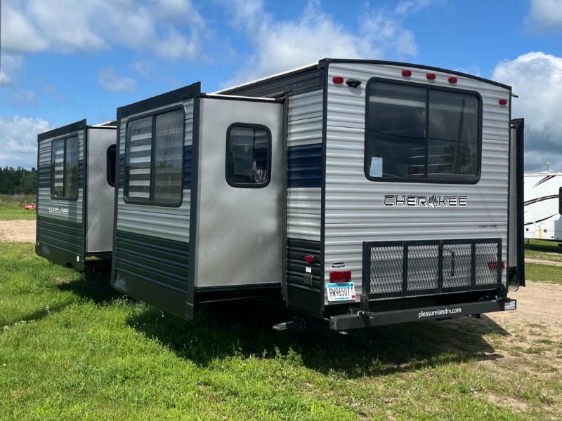 You will certainly want to plan more trips once you have this Cherokee travel trailer sitting in your driveway! With a private bedroom up front and a separate living room in the back, this trailer feels just like home. There is plenty of seating for everyone in the living room with the opposing sofa slides and the two lounge chairs, and the entertainment center will be easily viewed by all. If the weather is too nice to stay indoors, then you can all head outside and have a barbecue at the outdoor kitchen.