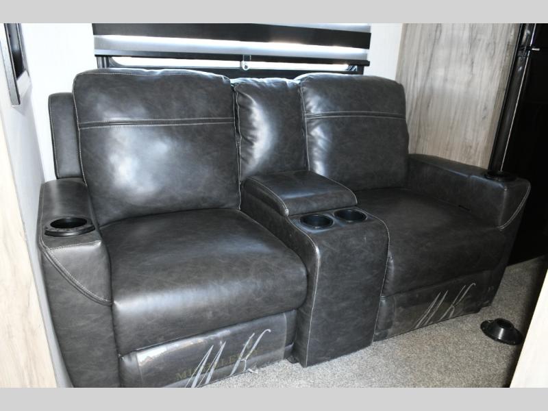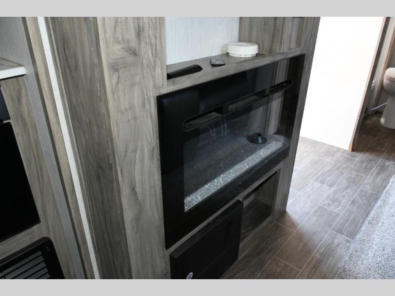 The front private bedroom provides a quiet retreat after a day of exploring, while the rear full bathroom ensures convenience and comfort with ample space for two. Inside, the home theatre seating across from the electric fireplace creates a cozy entertainment zone for movie nights, relaxing evenings, or casual dining using the removable trays.