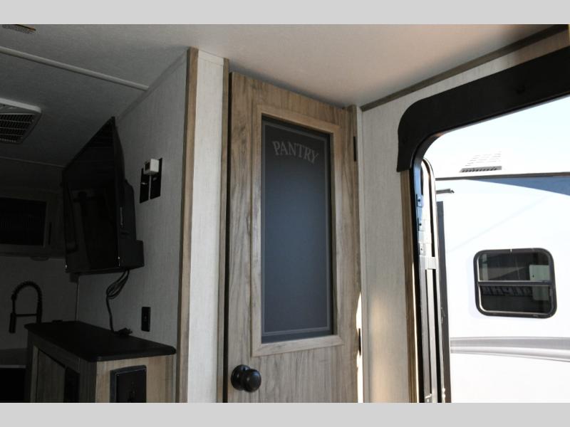 The kitchen blends function with style, featuring a farm-style sink, dual barn doors, and storage options that make meal prep easy even on extended trips. The residential refrigerator and dual pantries allow for plenty of storage to support long adventures. Outside, the oversized 18' awning and deluxe exterior kitchen expand your living space, letting you enjoy fresh air meals or relax under shade while keeping gear organized in the full pass-through storage.