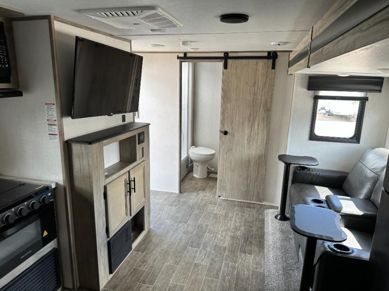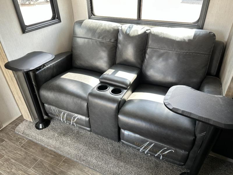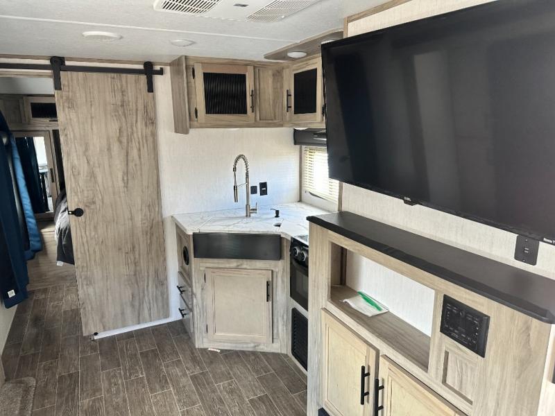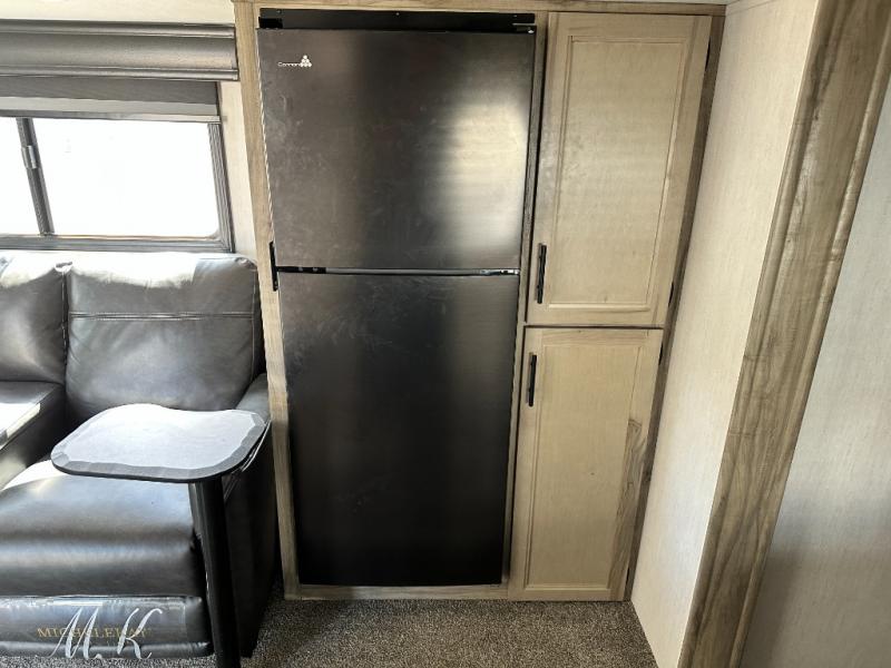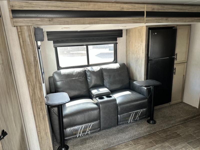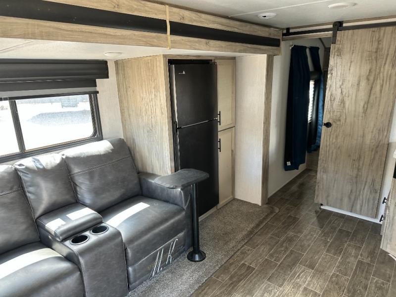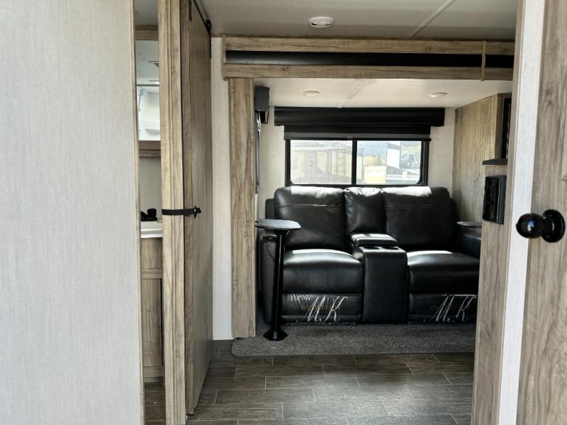 This travel trailer is perfect for a couple that wants to get out and tour the country! There is an abundance of storage inside and out with the two kitchen pantries, the overhead cabinets, and the exterior full pass-through storage area. The oversized rear bathroom comes with a porcelain stool with water jet assist, a powered attic fan, a shower/tub with a skylight above, an oversize lav sink, and a linen closet to keep your towels close. You will enjoy your meals in true relaxation while sitting at the home theatre seating which has heated massage and removable dinner trays directly across from the electric fireplace. This model offers a modern spin on camping with a farm style sink, dual barn style doors, and the deluxe bedding package. The exterior includes refinements like an oversized 18' awning, a deluxe outside kitchen, and the Alpha step above entry step!