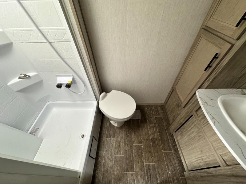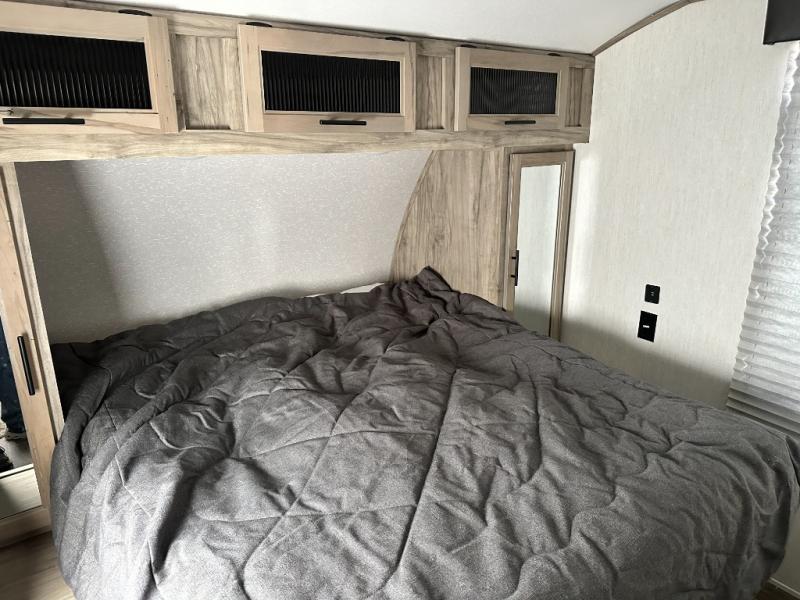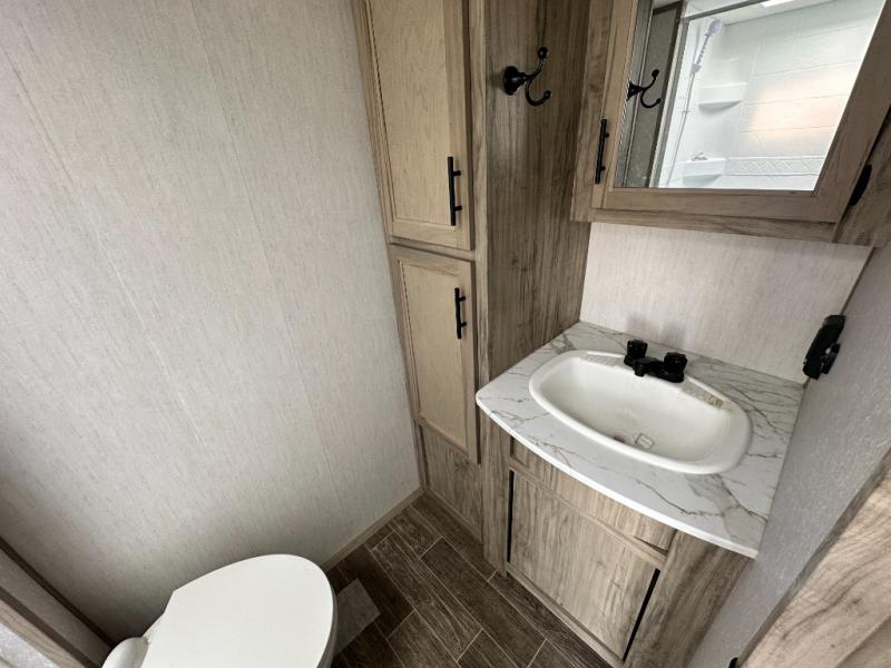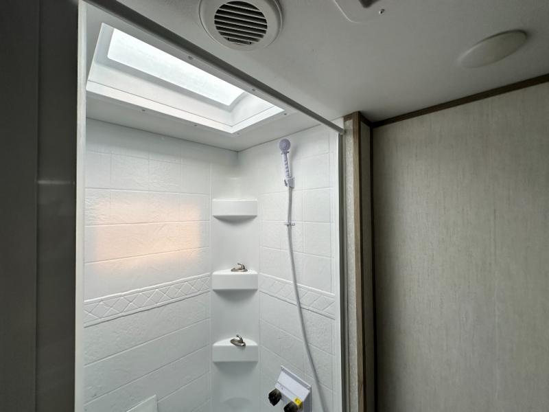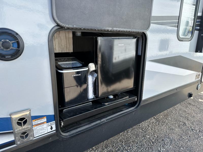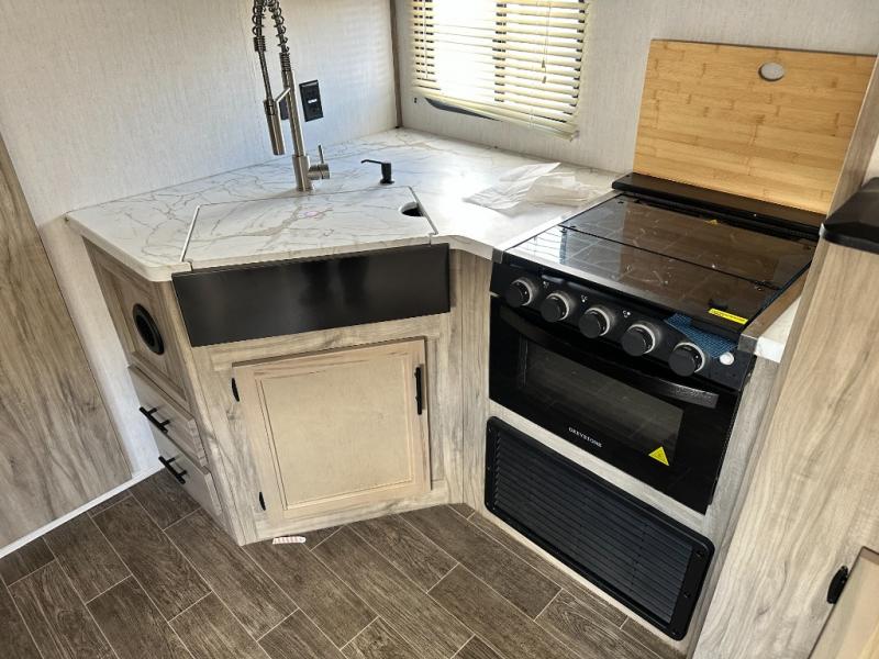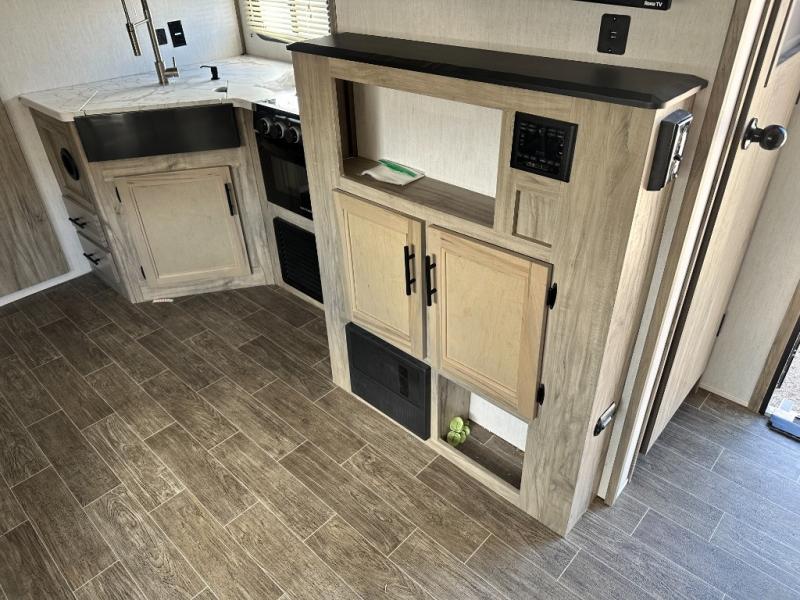 This travel trailer is perfect for a couple that wants to get out and tour the country! There is an abundance of storage inside and out with the two kitchen pantries, the overhead cabinets, and the exterior full pass-through storage area. The oversized rear bathroom comes with a porcelain stool with water jet assist, a powered attic fan, a shower/tub with a skylight above, an oversize lav sink, and a linen closet to keep your towels close. You will enjoy your meals in true relaxation while sitting at the home theatre seating which has heated massage and removable dinner trays directly across from the electric fireplace. This model offers a modern spin on camping with a farm style sink, dual barn style doors, and the deluxe bedding package. The exterior includes refinements like an oversized 18' awning, a deluxe outside kitchen, and the Alpha step above entry step!