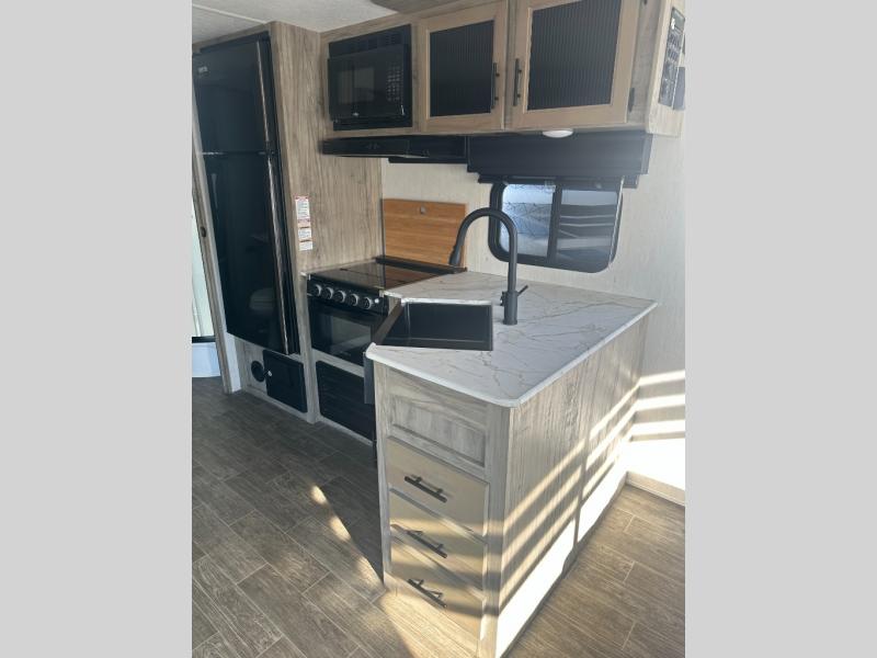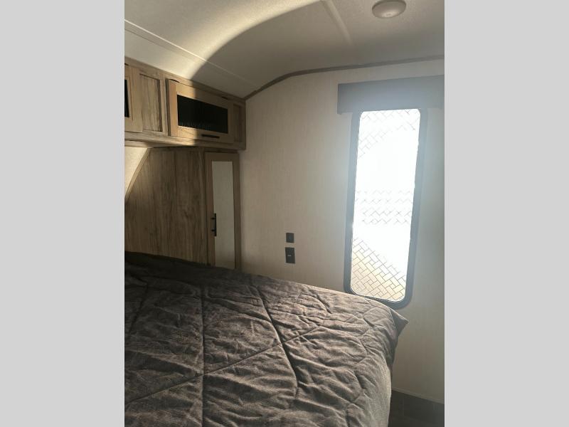 If you're looking for a dynamic, weight conscious travel trailer for you and your spouse to take to your favorite campsite then you need this one! The cross conversational area includes a deluxe tri-fold hide-a-bed sofa with a panoramic rear window to look out at the lake, a free standing table with four seats, and a fireplace to enjoy on those cool nights, just grab a snack from the walk-in pantry and you're all set for the perfect evening. The walk-through bathroom has a radius shower with opaque glass doors, a skylight, and a linen closet, plus you can enter right into the front private bedroom. The bedroom has a comfortable queen bed with nightstands and shirt closets on either side to keep your clothes looking their best, and you can even choose to add an optional TV for your entertainment. The exterior features an oversized 20' awning, a deluxe outside kitchen, and a full pass-through storage area to keep all of your camping gear!