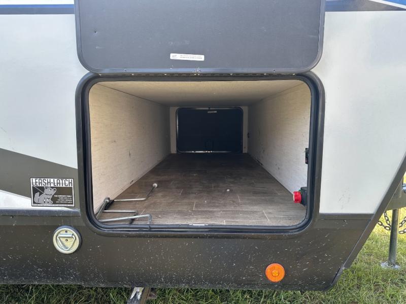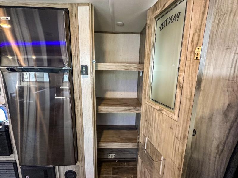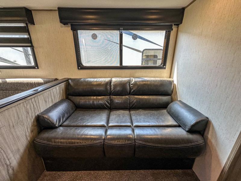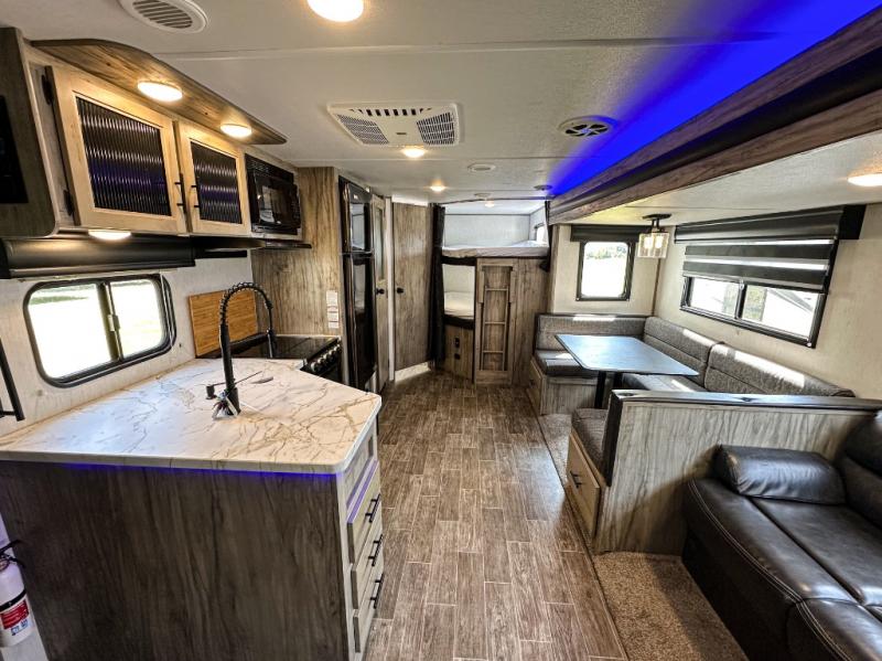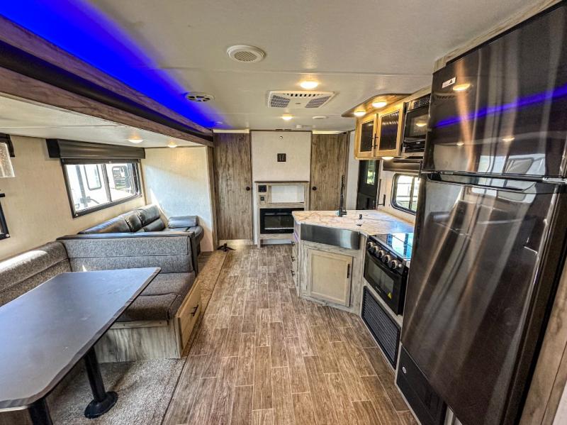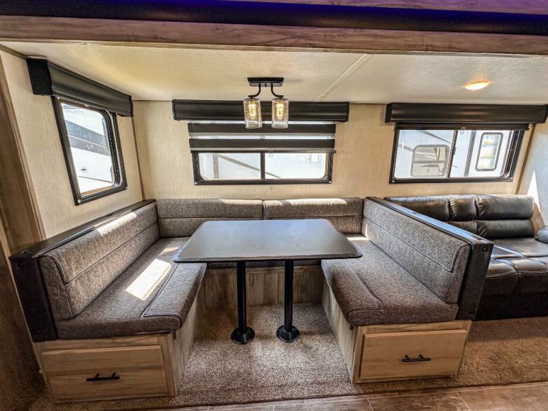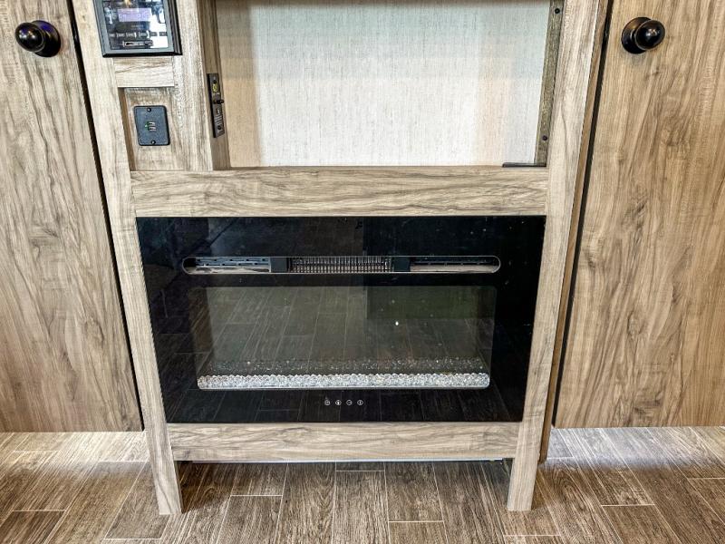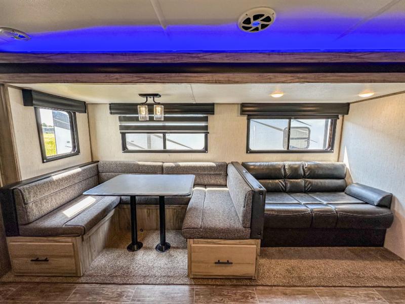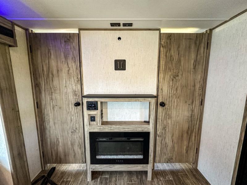 Spend your weekends with the whole family in the most popular multi-sleeper with this travel trailer! The dual entry doors make for a smooth flow of traffic in and out of the unit, plus one of the doors leads directly into the rear corner bathroom so you can get back to playing outdoors fast. The oversized U-shaped dinette is big enough for everyone to gather around at meal times and to play games. If mother nature is raining on your parade then you can relax on the jackknife sofa and enjoy the electric fireplace, just grab a snack from the large pantry and a drink from the 12V residential refrigerator.. If you're feeling brave then you can head outdoors and watch the rain poor down as you stay protected underneath the oversized 20' awning, plus there is a deluxe outside kitchen for you to cook while you watch the kids play when the sun is shining!