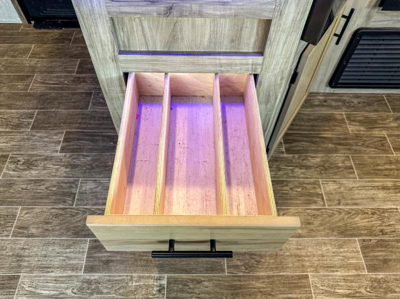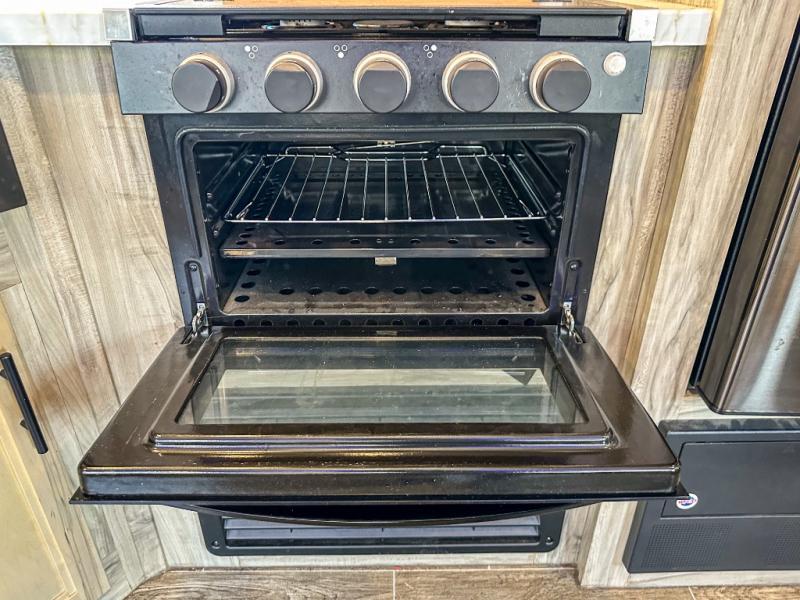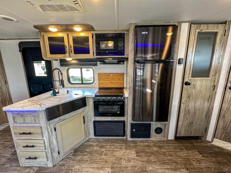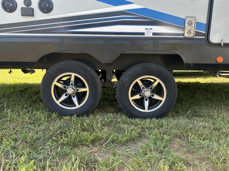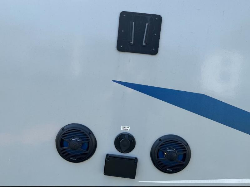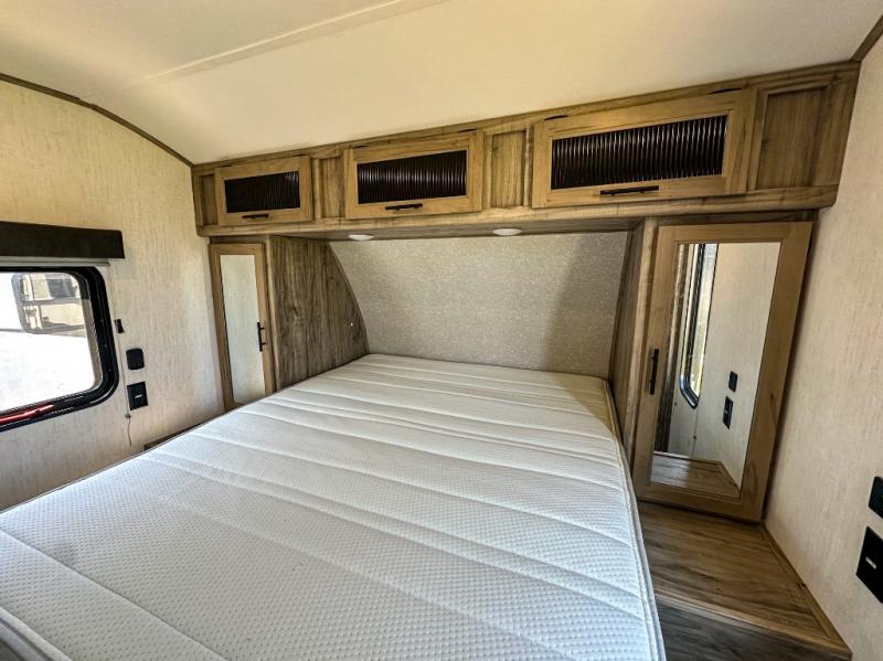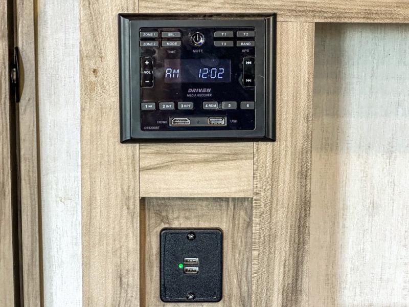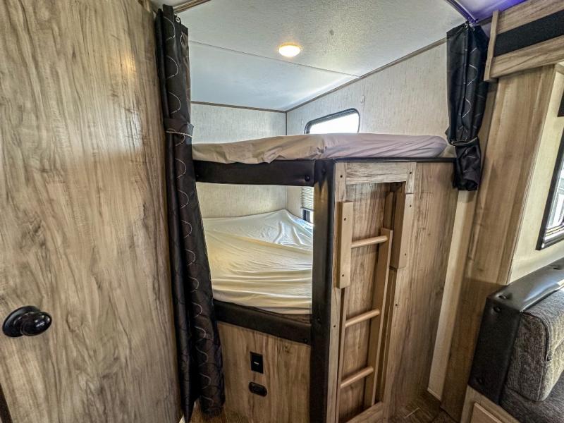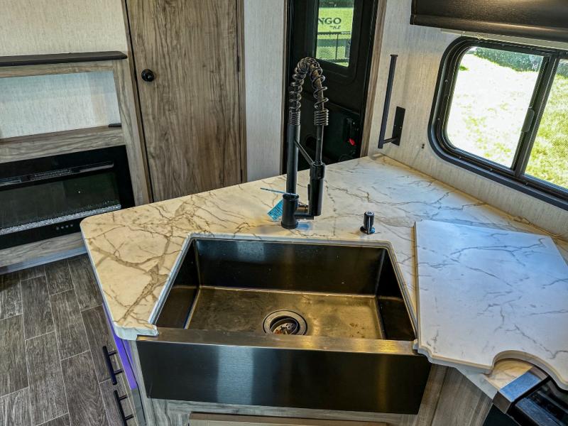 Spend your weekends with the whole family in the most popular multi-sleeper with this travel trailer! The dual entry doors make for a smooth flow of traffic in and out of the unit, plus one of the doors leads directly into the rear corner bathroom so you can get back to playing outdoors fast. The oversized U-shaped dinette is big enough for everyone to gather around at meal times and to play games. If mother nature is raining on your parade then you can relax on the jackknife sofa and enjoy the electric fireplace, just grab a snack from the large pantry and a drink from the 12V residential refrigerator.. If you're feeling brave then you can head outdoors and watch the rain poor down as you stay protected underneath the oversized 20' awning, plus there is a deluxe outside kitchen for you to cook while you watch the kids play when the sun is shining!