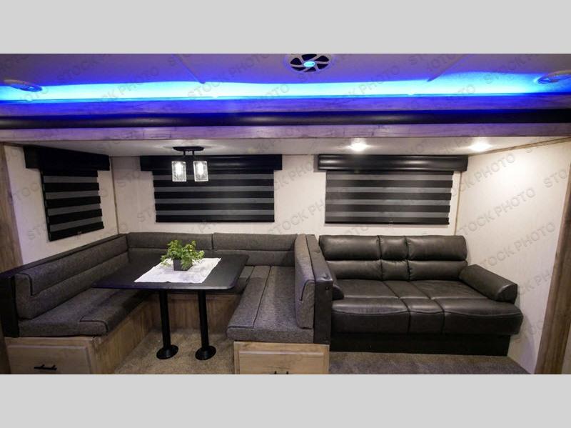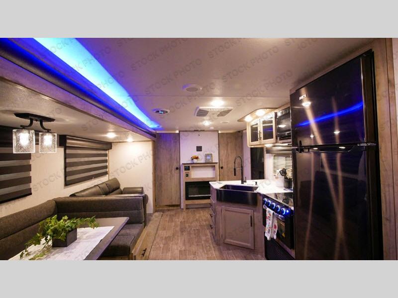 Spend your weekends with the whole family in the most popular multi-sleeper with this travel trailer! The dual entry doors make for a smooth flow of traffic in and out of the unit, plus one of the doors leads directly into the rear corner bathroom so you can get back to playing outdoors fast. The oversized U-shaped dinette is big enough for everyone to gather around at meal times and to play games. If mother nature is raining on your parade then you can relax on the jackknife sofa and enjoy the electric fireplace, just grab a snack from the large pantry and a drink from the 12V residential refrigerator.. If you're feeling brave then you can head outdoors and watch the rain poor down as you stay protected underneath the oversized 20' awning, plus there is a deluxe outside kitchen for you to cook while you watch the kids play when the sun is shining!