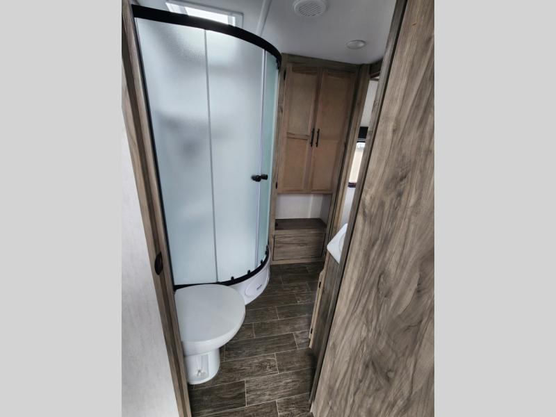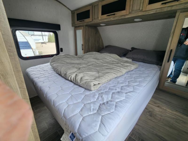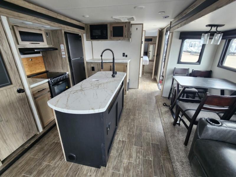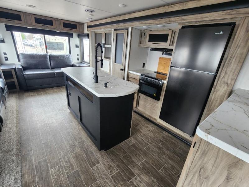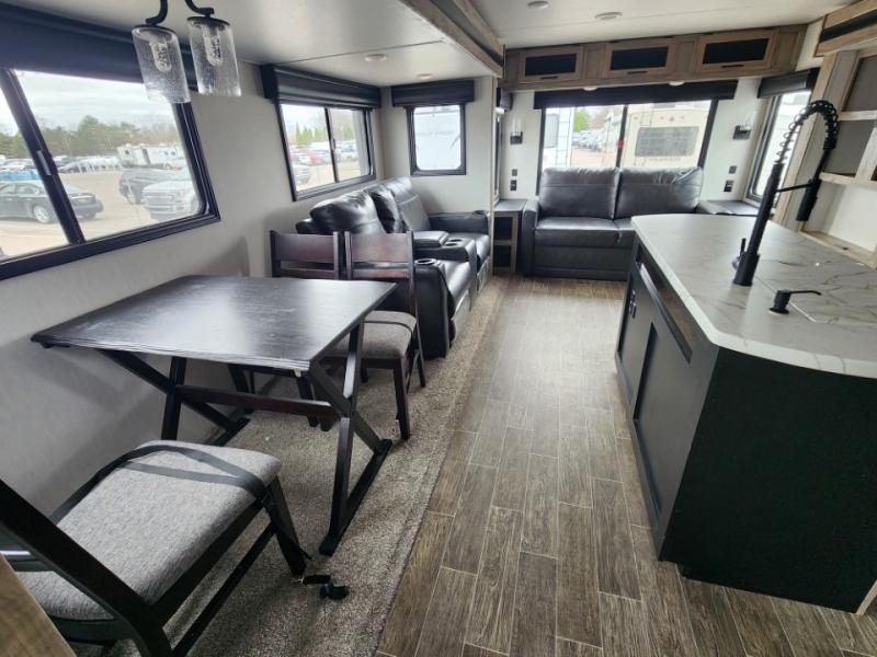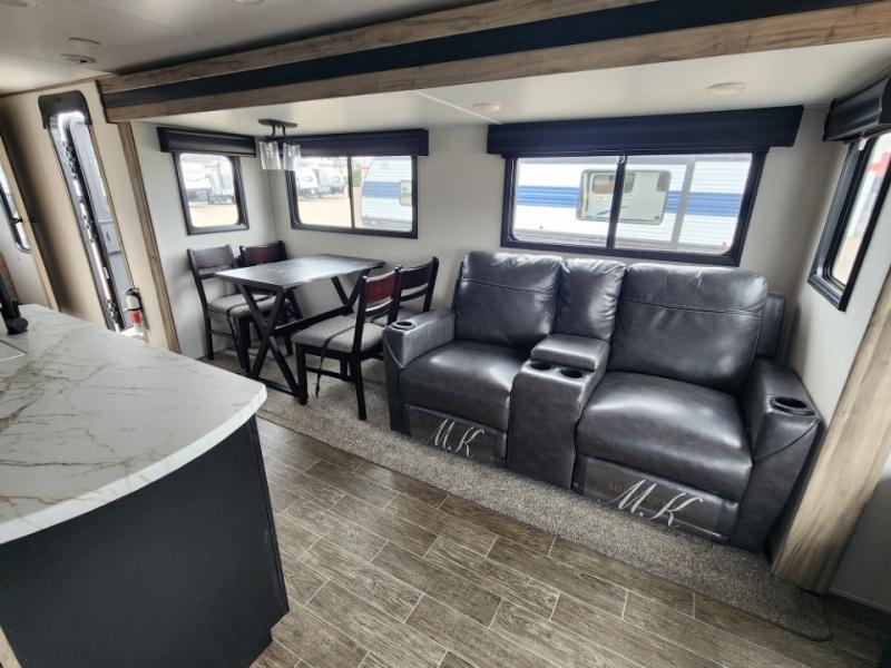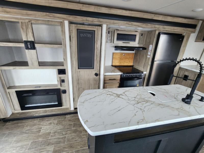 Come see how popular and spacious this couples travel trailer is! An extra guest or two can join in on the fun too with the rear tri-fold hide-a-bed sofa to convert into a sleeping space. The chef of your group will have an easy time preparing dinner with the kitchen island, and the coffee lover will appreciate the coffee bar. The free standing table comes with four chairs to enjoy your meals at, and after dinner you can relax at the home theatre seating for a relaxing, heated massage with a cozy fire roaring in the electric fireplace. Everyone can easily access the dual entry bathroom and take a hot shower in the radius shower with a skylight above to let in some natural lighting, plus you can head right into the front private bedroom from the bathroom. Grab your pajamas from one of the shirt closets on either side of the queen bed, and if you choose to add the optional TV then you can watch your favorite movie in true relaxation!
