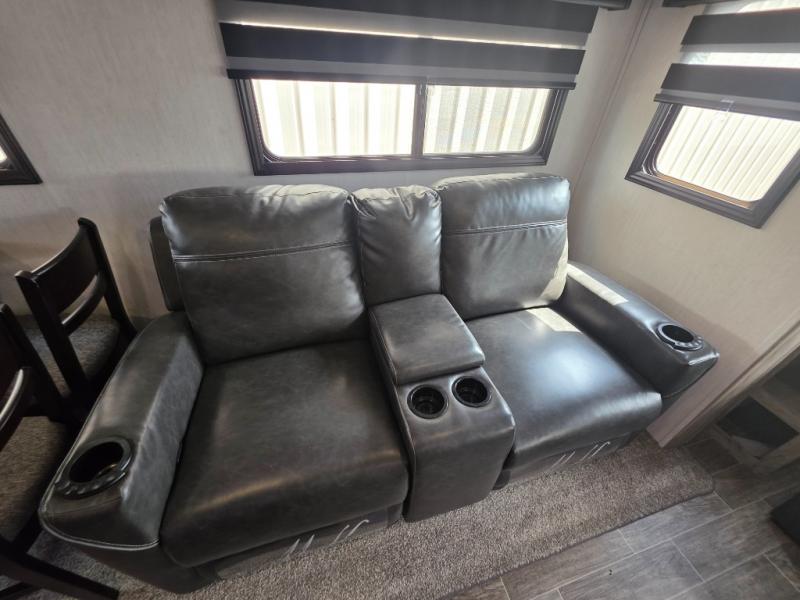 Come see how popular and spacious this couples travel trailer is! An extra guest or two can join in on the fun too with the rear tri-fold hide-a-bed sofa to convert into a sleeping space. The chef of your group will have an easy time preparing dinner with the kitchen island, and the coffee lover will appreciate the coffee bar. The free standing table comes with four chairs to enjoy your meals at, and after dinner you can relax at the home theatre seating for a relaxing, heated massage with a cozy fire roaring in the electric fireplace. Everyone can easily access the dual entry bathroom and take a hot shower in the radius shower with a skylight above to let in some natural lighting, plus you can head right into the front private bedroom from the bathroom. Grab your pajamas from one of the shirt closets on either side of the queen bed, and if you choose to add the optional TV then you can watch your favorite movie in true relaxation!