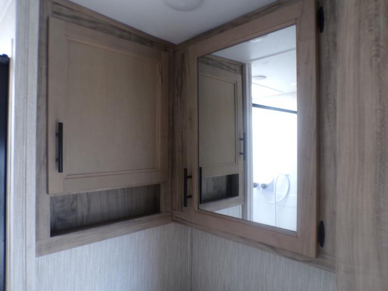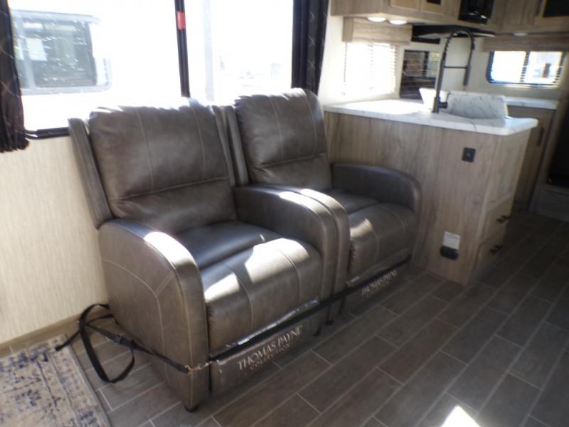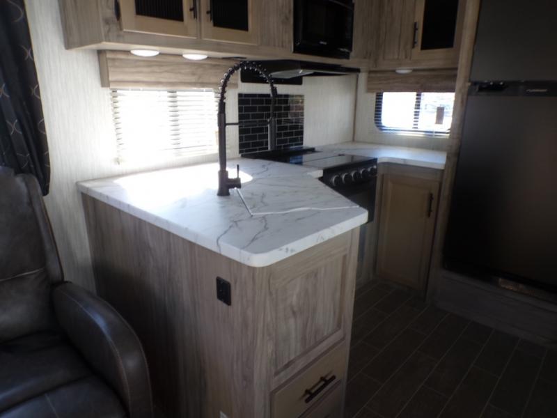 If you and your spouse wish to escape the hustle and bustle of everyday life, then check out this Arctic Wolf fifth wheel! It features a front private bedroom with a residential queen-size bed, a wardrobe with an area for your bath linens above it, and an area prepped for you to add an optional TV. You can even bring a couple of extra guests thanks to the tri-fold sofa and flip-up bunk within the large slide out, and the fireplace will make this area feel more like home. The rear kitchen includes overhead cabinetry, a microwave, a hand sanitizer station, plus a 12V residential refrigerator. There's no need to cook indoors all the time either when you use the deluxe outside kitchen which features a sink, two burners, a refrigerator, and even a place for ice!