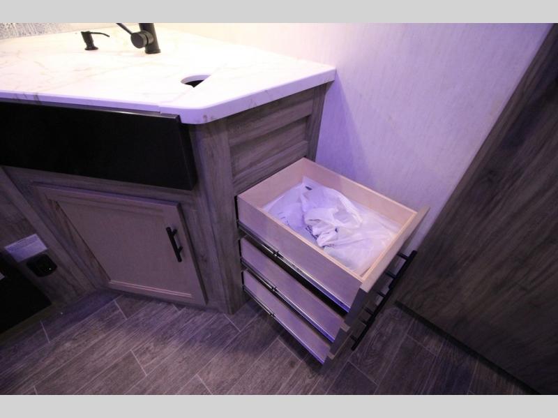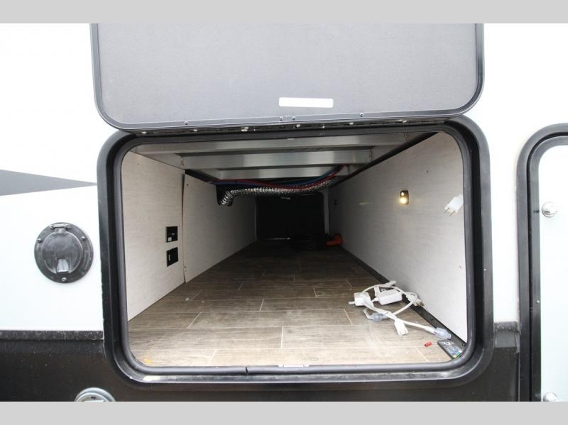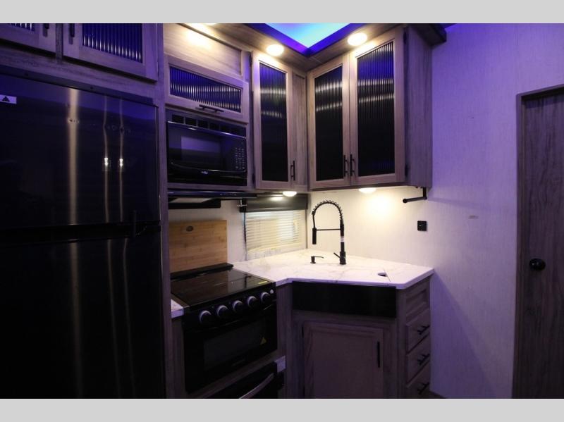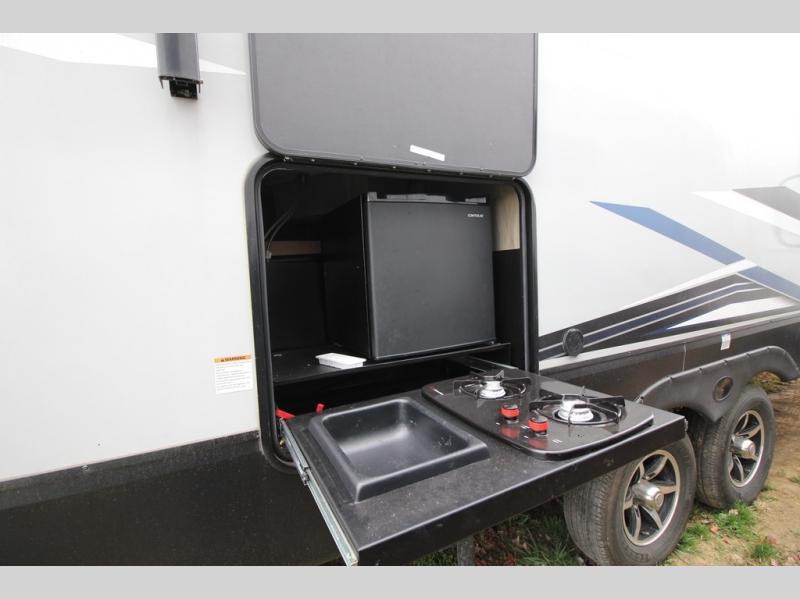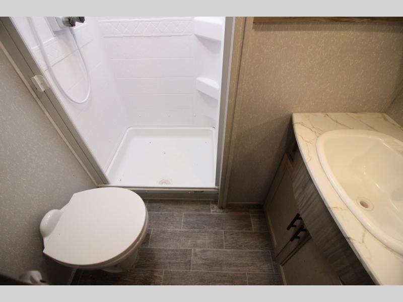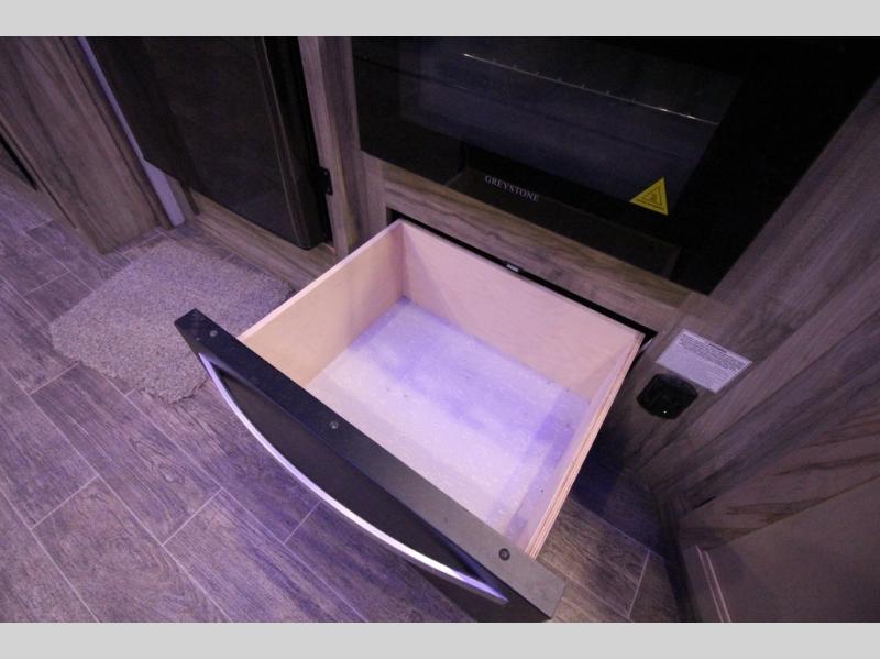It's time to join the pack and see what you've been missing! With the Forest River Cherokee Arctic Wolf fifth wheel, you can finally enjoy true value and home-like amenities. Each portion of the Arctic Wolf has been designed to make you feel comfortable, like the bathroom that has a Nautilus-style shower with retractable splash-proof door, a skylight, an oversized sink, countertop, base cabinet, and medicine cabinet, a motion-sensing nightlight, and a barn-style door. Make each of your getaways a party with the dual-zone Bluetooth stereo optimized for USB flash drives, iPods, and other MP3 players, and use the leash latch pet safety technology to keep your puppy from wandering off. The outside shower with hot and cold water can be used for hosing down your outdoor equipment before storing it away again, and there are motion-sensor lights in the pass-through storage so that you can easily see when the campsite is dark.