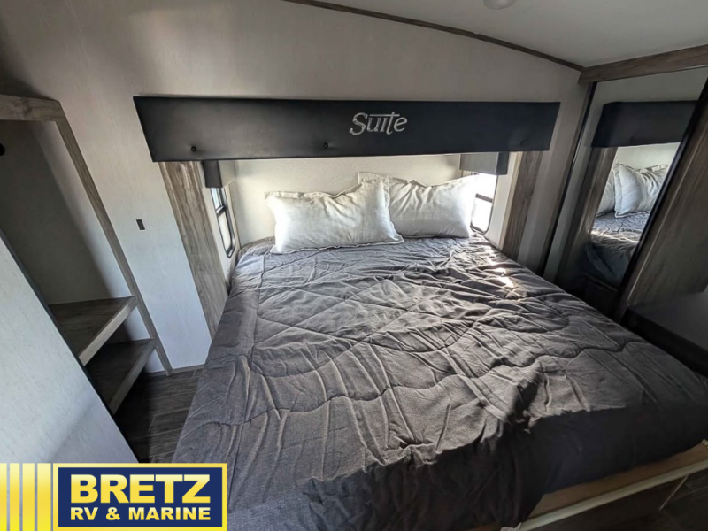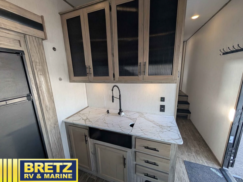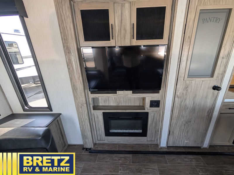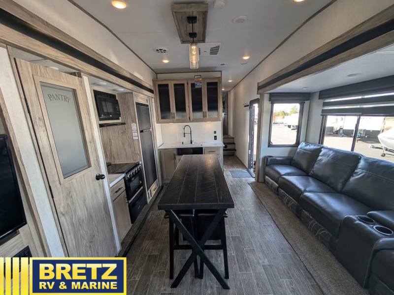 This fifth wheel is uniquely designed for multiple sleepers! Start and end your days in ultimate relaxation at the home theatre seating which comes with heat, ambient lighting, and massage. The kitchen island will make prepping your meals easier than ever and comes with four bar stools, plus panoramic rear and slide windows to enjoy a view of the lake while eating your meals. The second bedroom has a set of 48" x 72" double stacked bunks with a ladder, a wardrobe, and a barn-style door. Inside the full bathroom is a Nautilus style shower with a retractable splash proof door, a skylight for natural lighting, a porcelain stool with water jet assist and foot flush, and an oversized lavatory sink with a base cabinet and medicine cabinet. There is lots of interior space in the front private bedroom, a front wall wardrobe with shelves, a dresser with shoe storage, and even a closet that is prepped to add the optional washer and dryer. Some exterior refinements you will love include a 15,000 BTU A/C to keep you cool on those hot summer days, a one-touch auto leveling system, and double basement storage to bring all of your favorite camping gear!