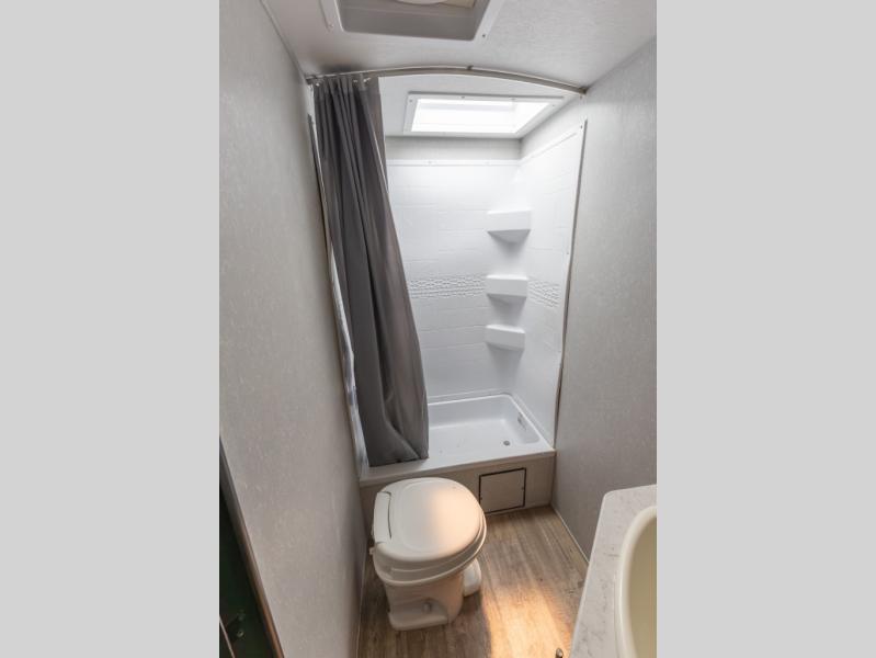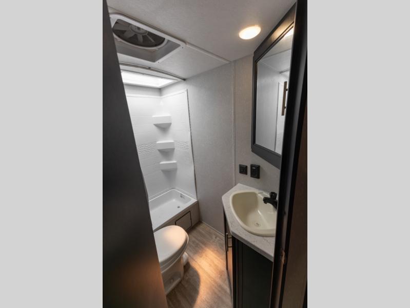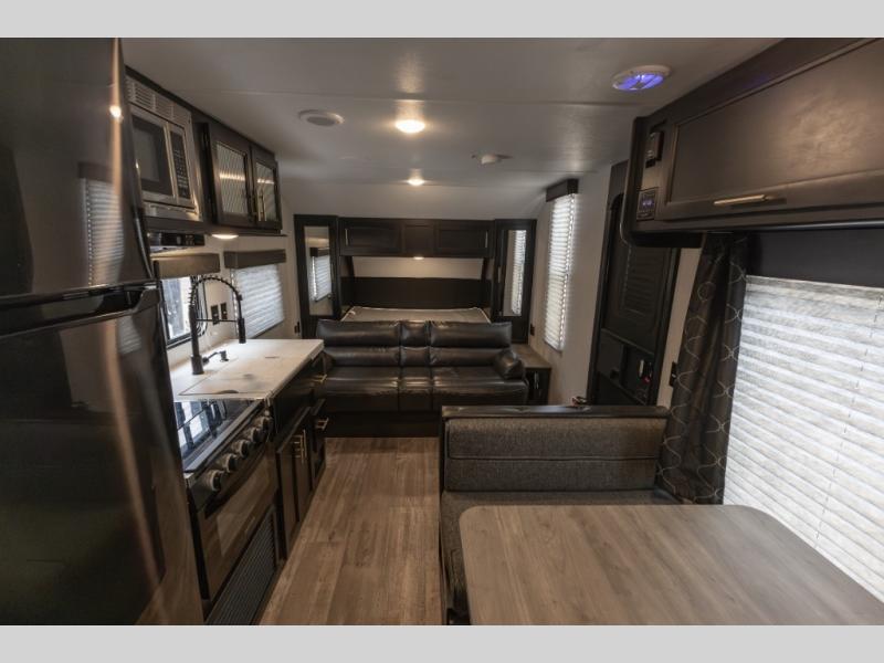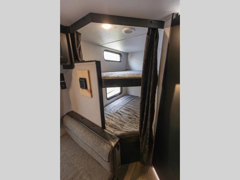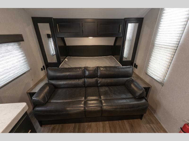 With this Cherokee Cascade travel trailer, there are a set of double-size bunks that your kiddos are sure to love, and you will love having your own Cherokee Sleep System bed. The bed can be easily folded up to give you a full sofa. The location of the full bathroom in the back next to the bunk beds offers even more convenience, especially at night. This unit will give your larger family a great camping experience. You will find ample storage both inside and out with large overhead cabinets inside and wardrobes on either side of the front bed. On the outside, there are storage compartments for your exterior camping gear in both the front and rear making it easy to stow away outdoor camp chairs and games that you can enjoy while hanging out under the 15' power awning.